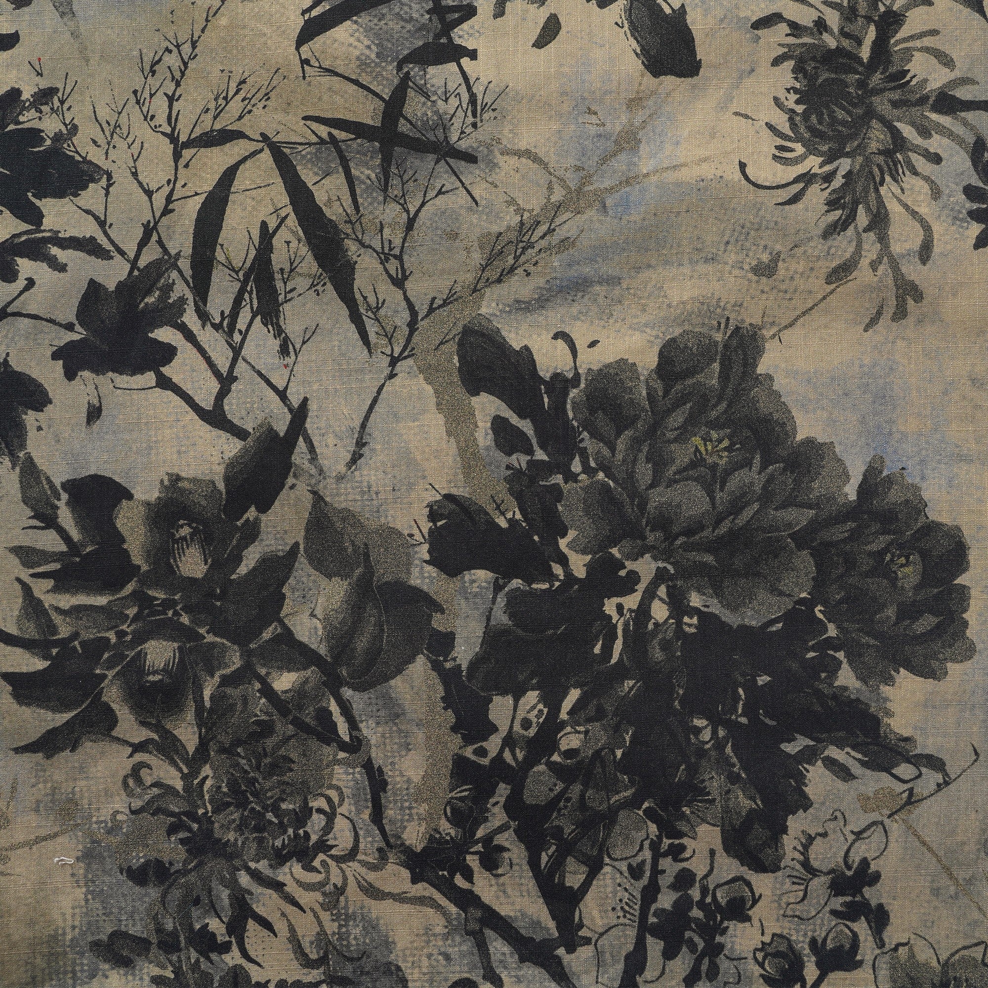 This elegant watercolor artwork features a vintage-inspired brown shirt adorned with timeless floral motifs—chrysanthemums, peonies, and plum blossoms—symbolizing resilience, prosperity, and grace. The soft blue textured background adds depth and a touch of poetic serenity, embodying classic Eastern charm. Perfect for adding refined, artistic flair to any space.
