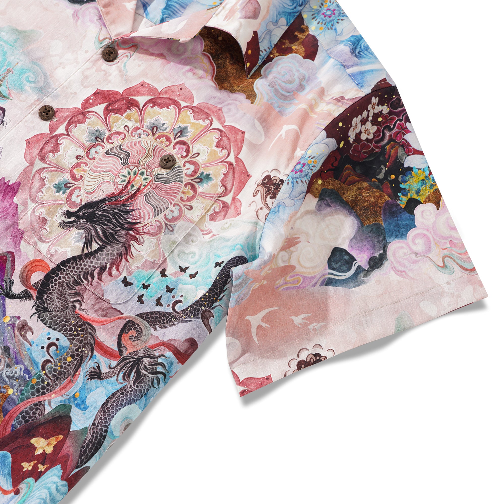 This striking shirt blends ancient Chinese mythology with artistic elegance. At its center, a powerful dragon—symbolizing strength, wisdom, and good fortune—winds through swirling clouds and waves. Rich earth tones and soft pastels create depth and movement. The dreamlike backdrop features intricate flowers, misty mountains, and delicate butterflies, adding a touch of magic. Every detail is meticulously crafted, inviting admiration and curiosity. More than just a visual masterpiece, it’s a cultural journey—a wearable story of legend and beauty. A timeless addition to any collection.