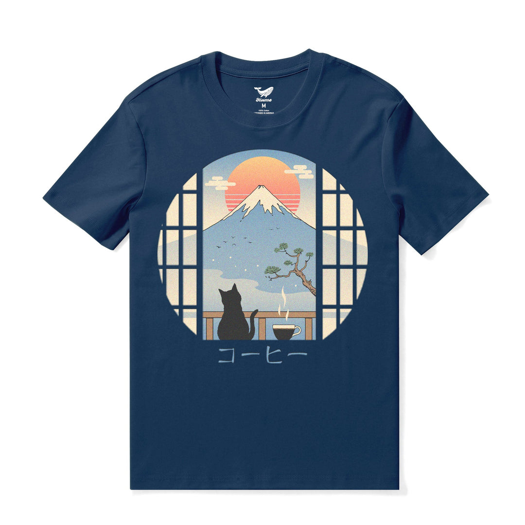 Cat, coffee, and Japan's iconic Mt. Fuji - this t-shirt captures serene minimalism and rich blue hues for cat and coffee lovers inspired by Asian landscapes and cultures. Wear it to relive your adventures in Japan or inspire compliments and questions from fellow travelers.