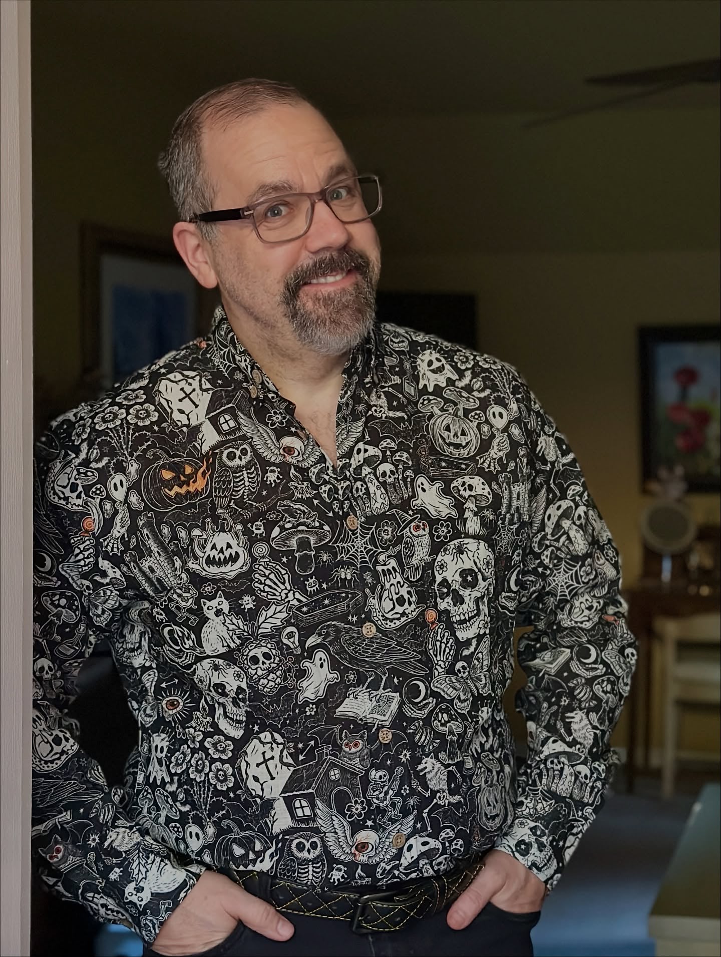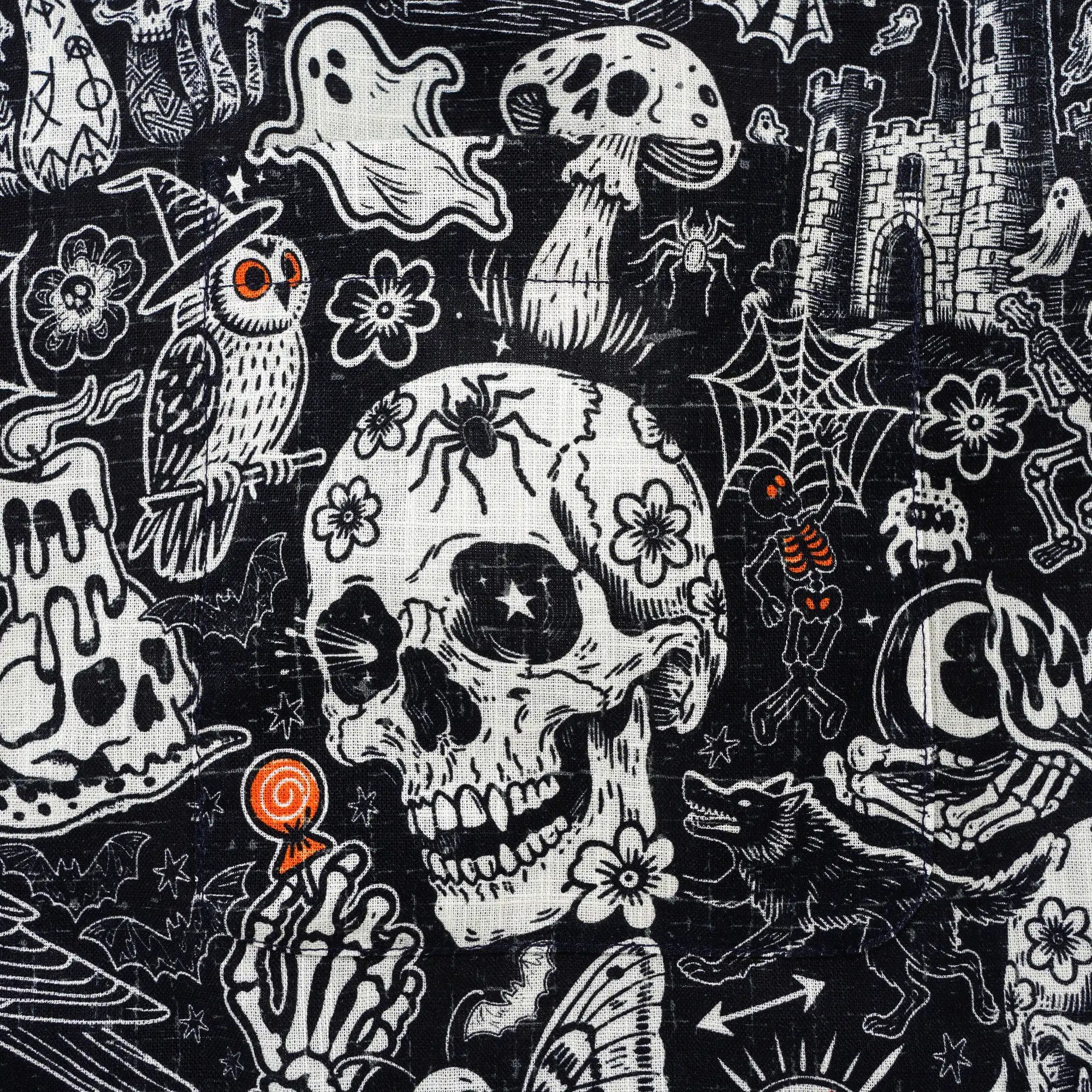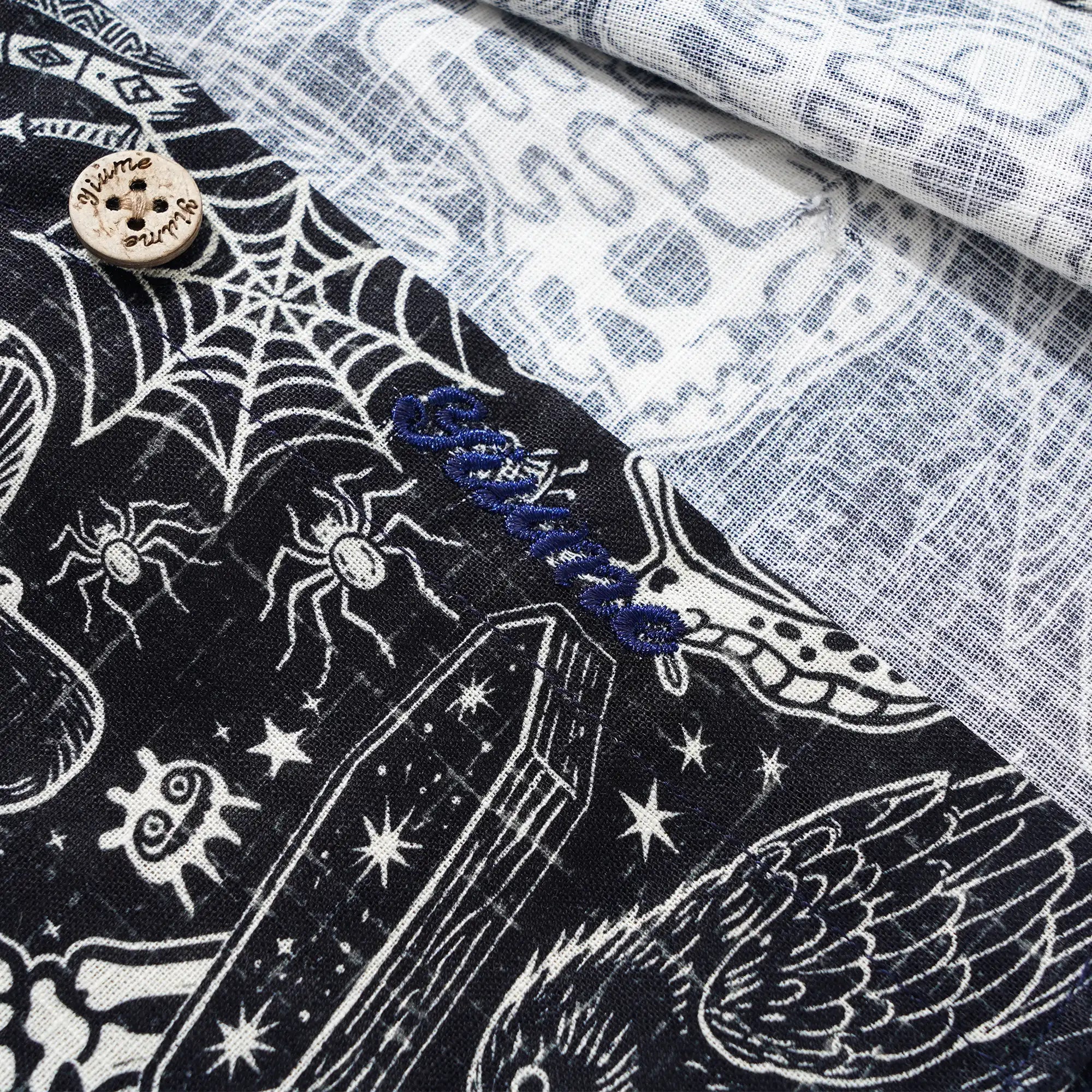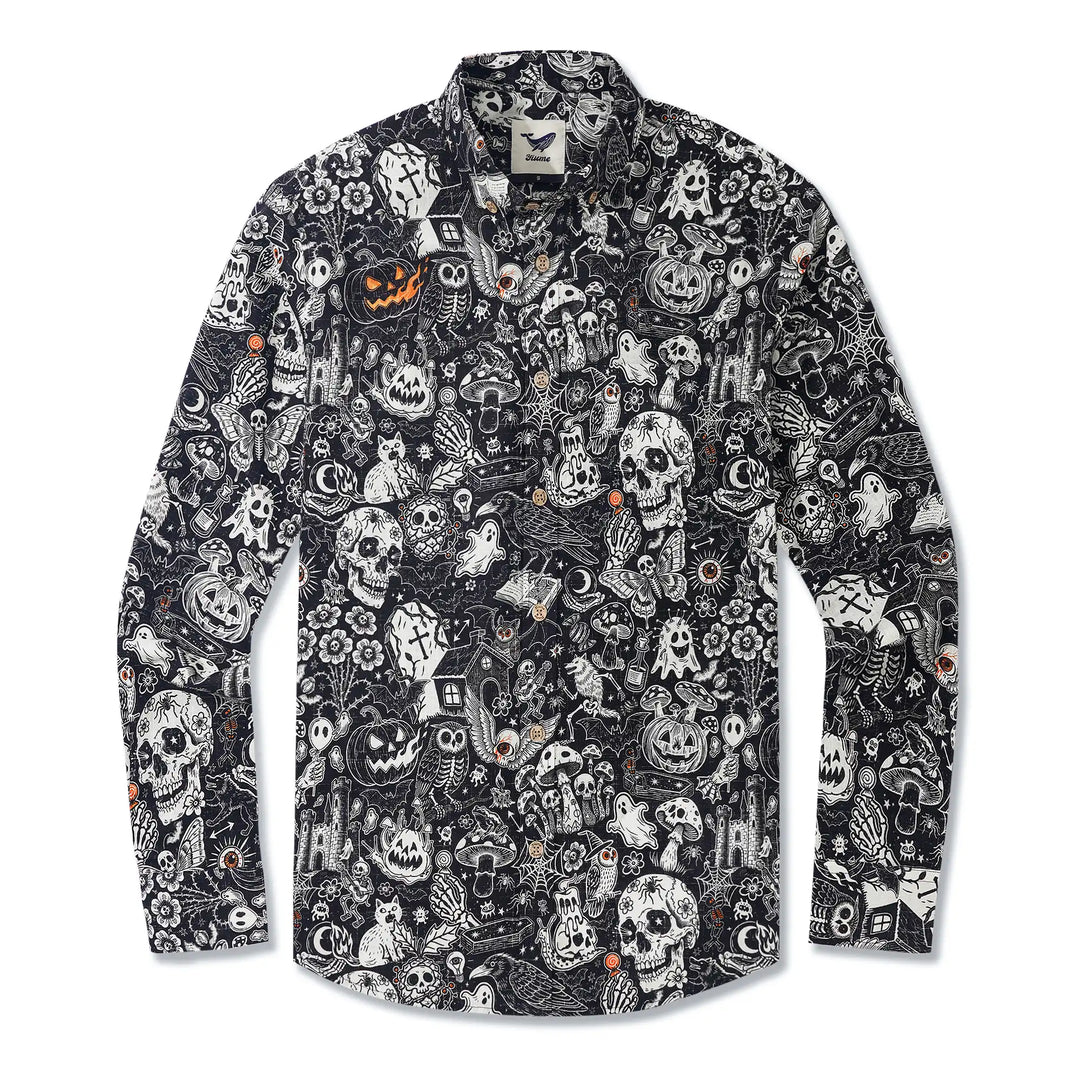 Men's Hawaiian Shirt Long Sleeve Button-down 100% Cotton Black Aloha Halloween Bash
