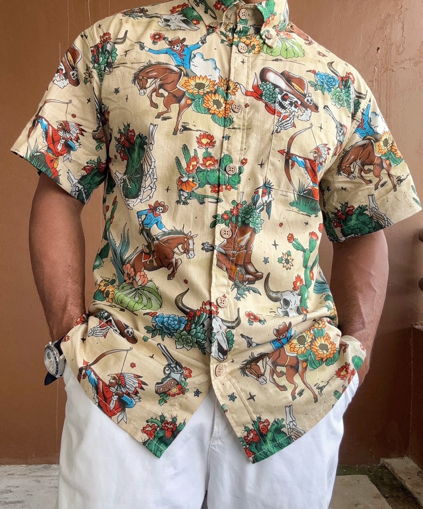 Western Cowboy Hawaiian Shirt For Men Short Sleeve Button-down 100% Cotton Desert Skull Shirt