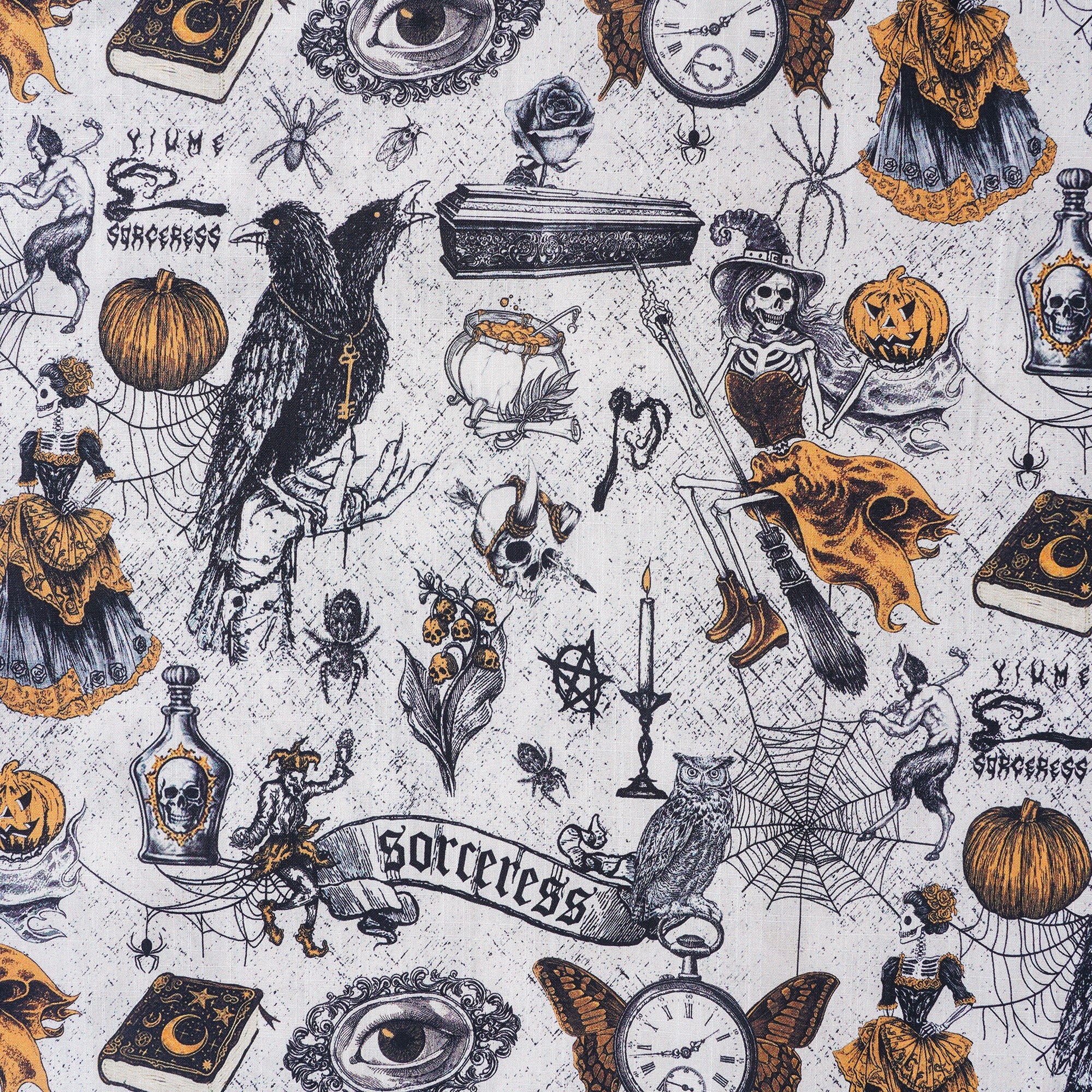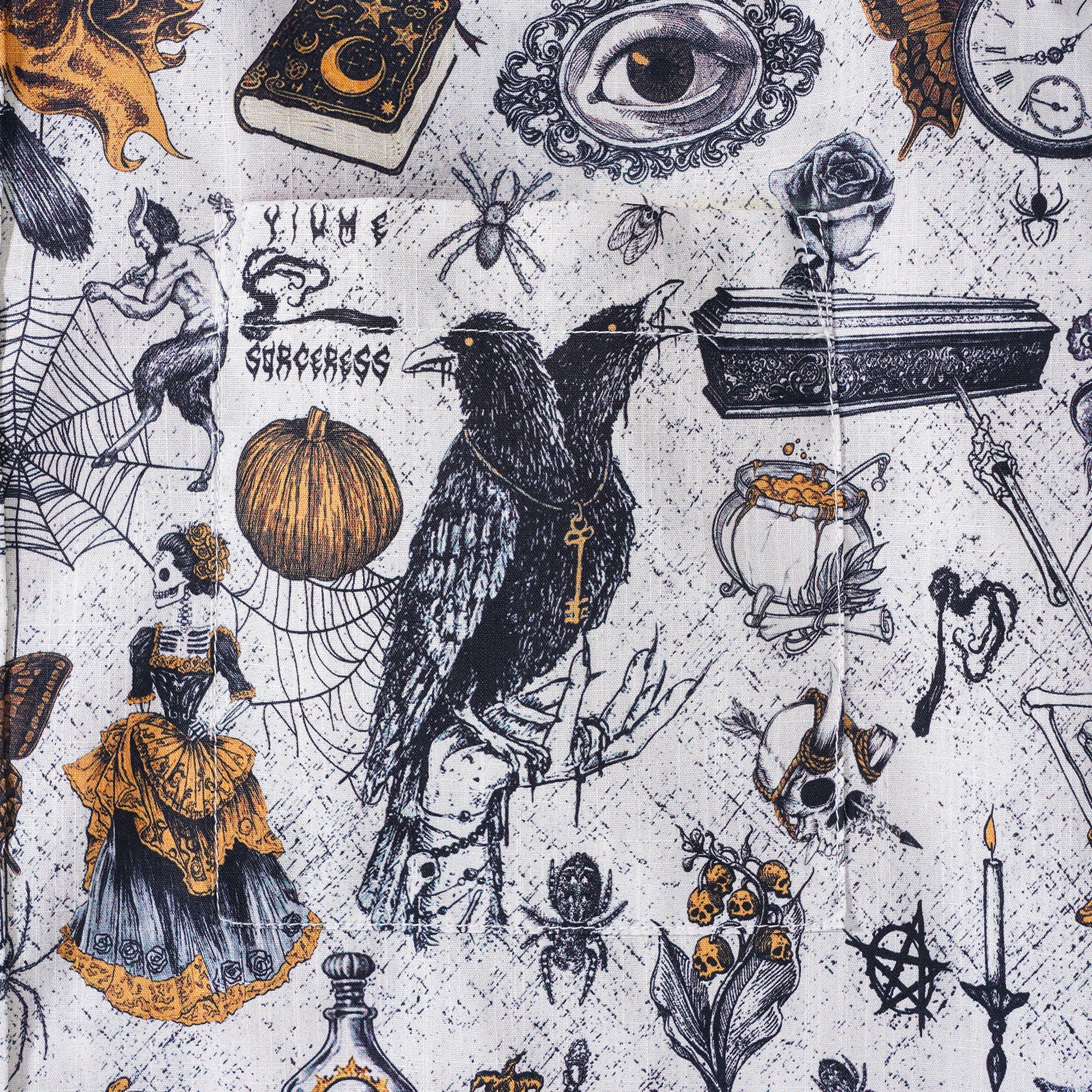 As midnight strikes, ancient gears turn and time stills. A crow glides through moonlight, a dark omen in flight. In the mist, a witch's hut appears—silver webs shimmer, spiders weave unseen secrets. Inside, cauldrons bubble with potions, casting purple smoke and eerie light. This artwork conjures a medieval dreamscape of dark magic and hidden tales. Wearing it feels like stepping into a realm where mystery and romance entwine.