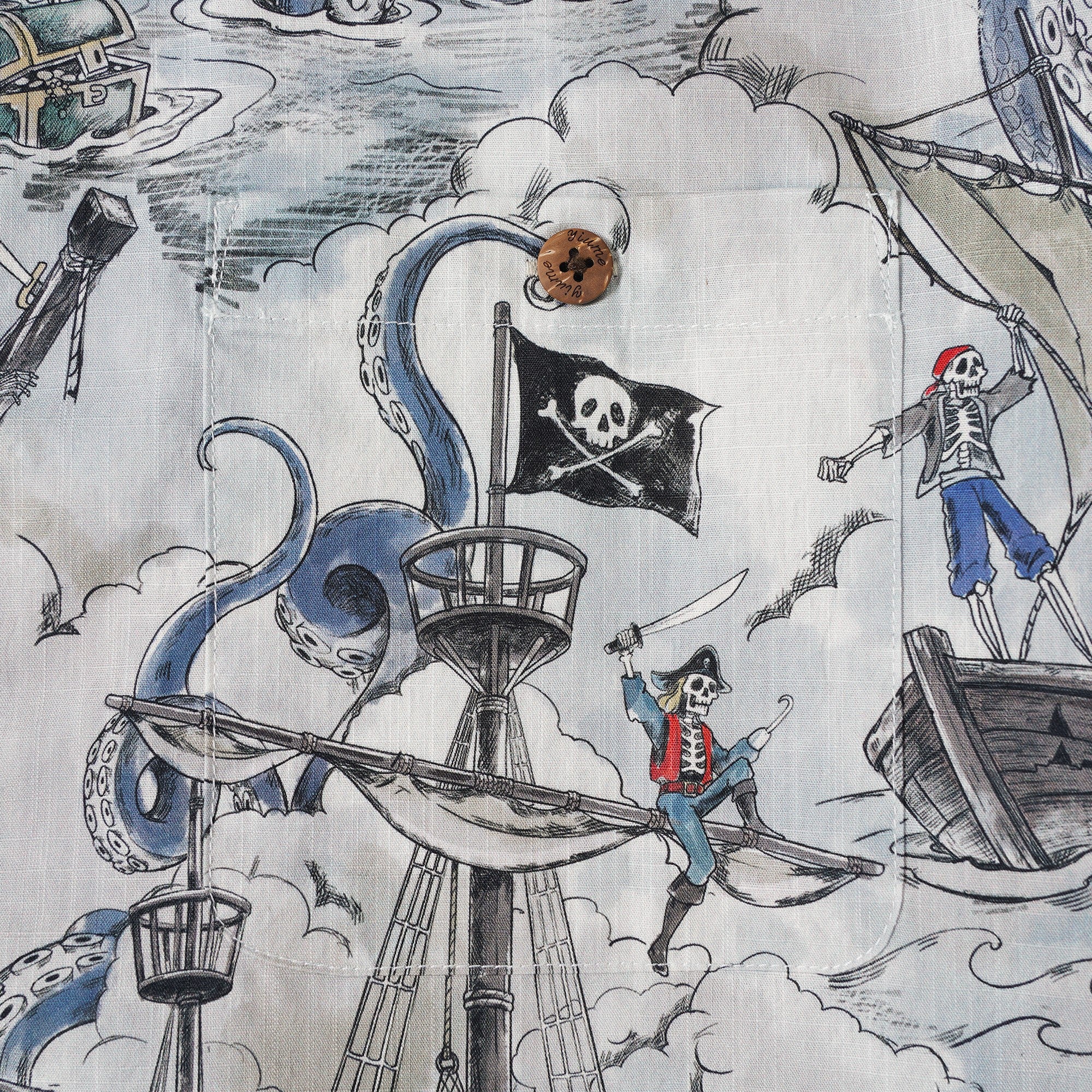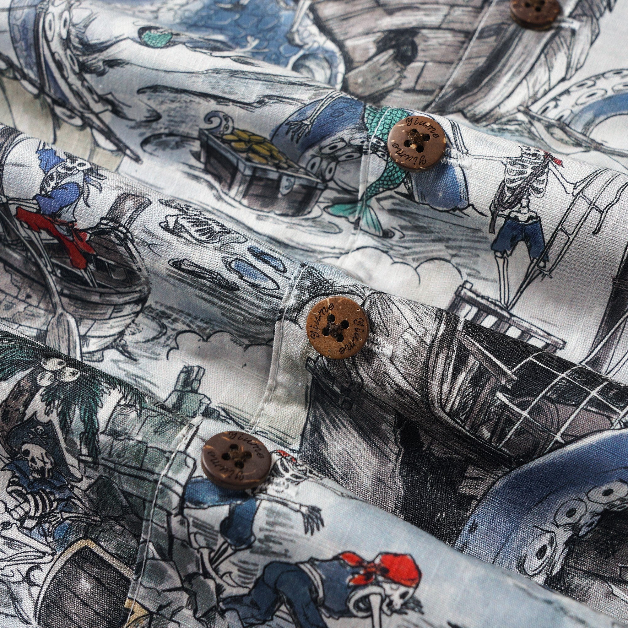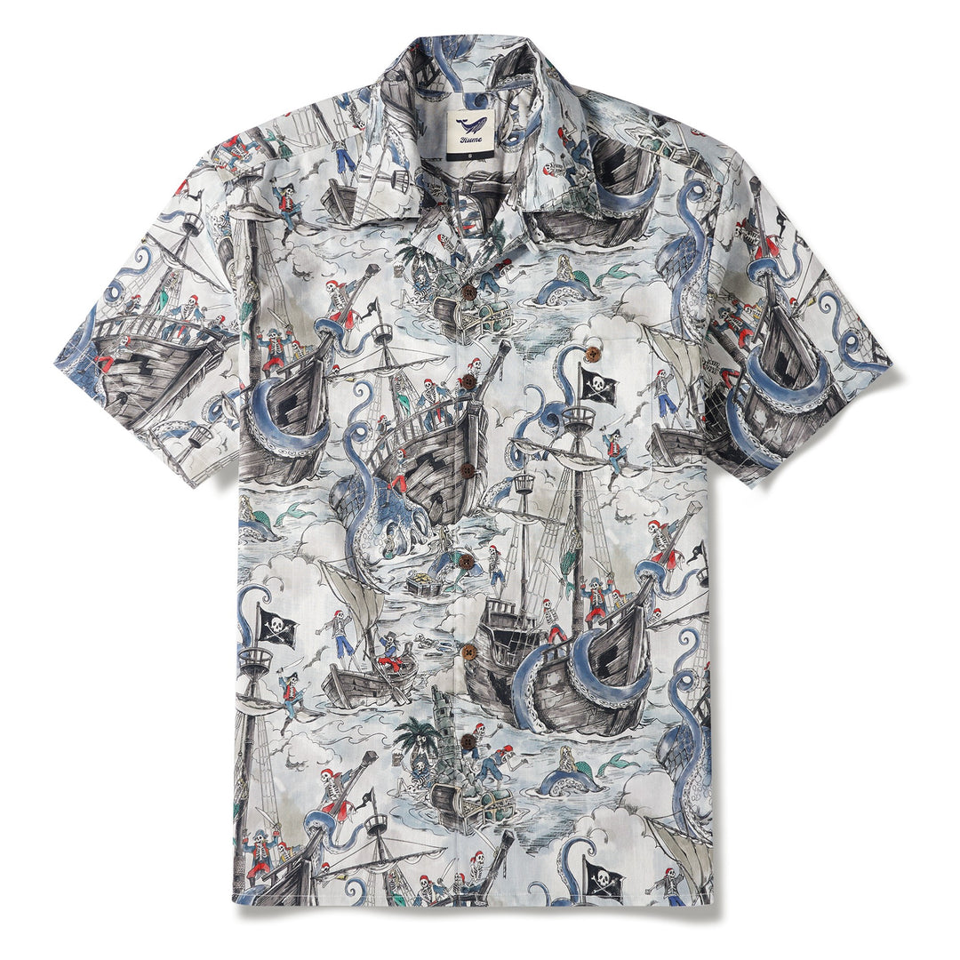 Embrace a pirate fantasy with this Hawaiian shirt featuring a vintage sketch-style. A black flag ship voyages towards "Mermaid Island," a treacherous trap of bones. Enchanted by mermaids' songs, the pirates decay into skeletons, ensnared by sea monsters. Embody a lazy summer vibe with a mysterious twist. Stand out with mystical allure on the beach or in the city.