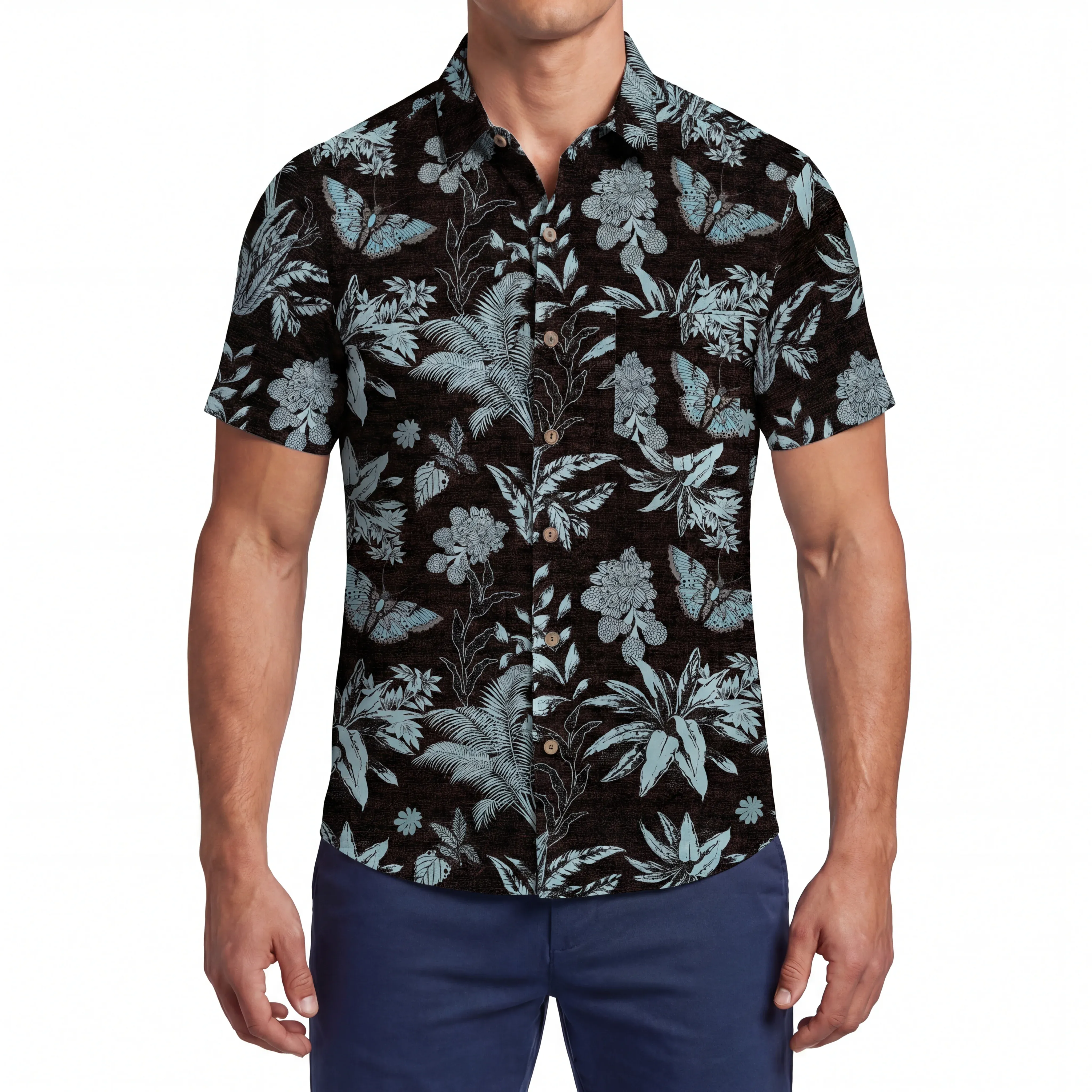 LeosWare® Men's Hawaiian Shirt Short Sleeve Button-up 100% Cotton Black Aloha Mystical Flowers And Butterflies