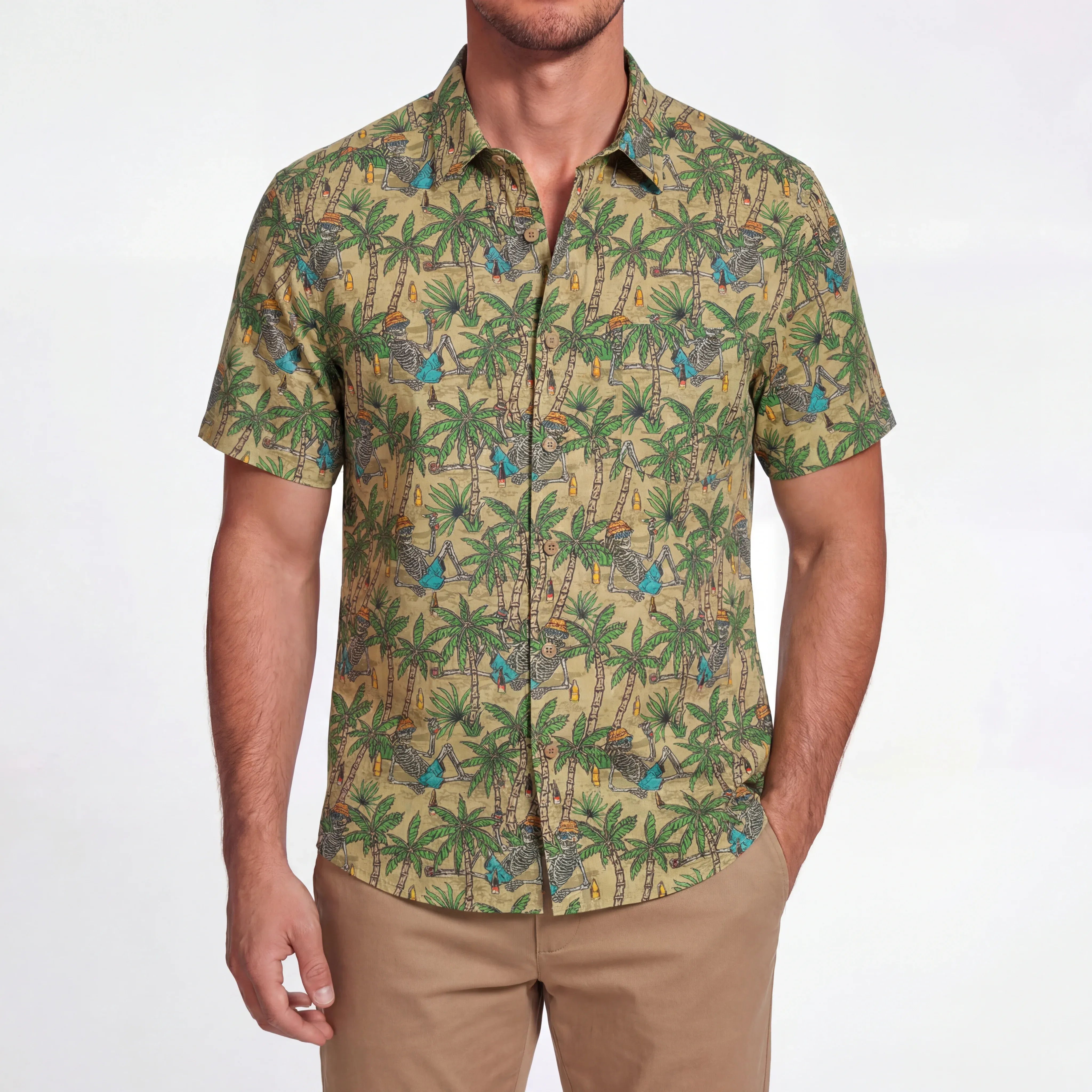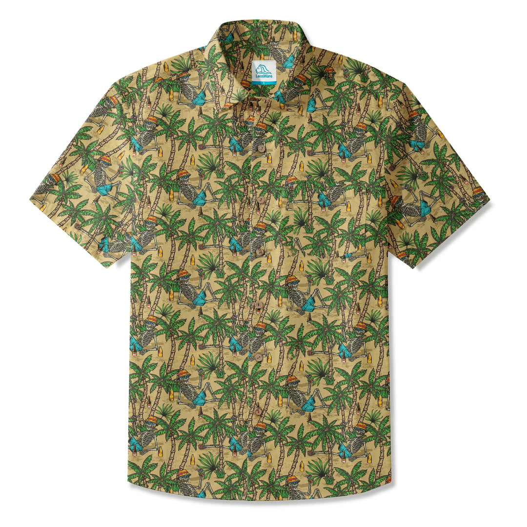 LeosWare® Men's Hawaiian Shirt Short Sleeve Button-up 100% Cotton Green Aloha Skeleton's Coconut Beach Vacation