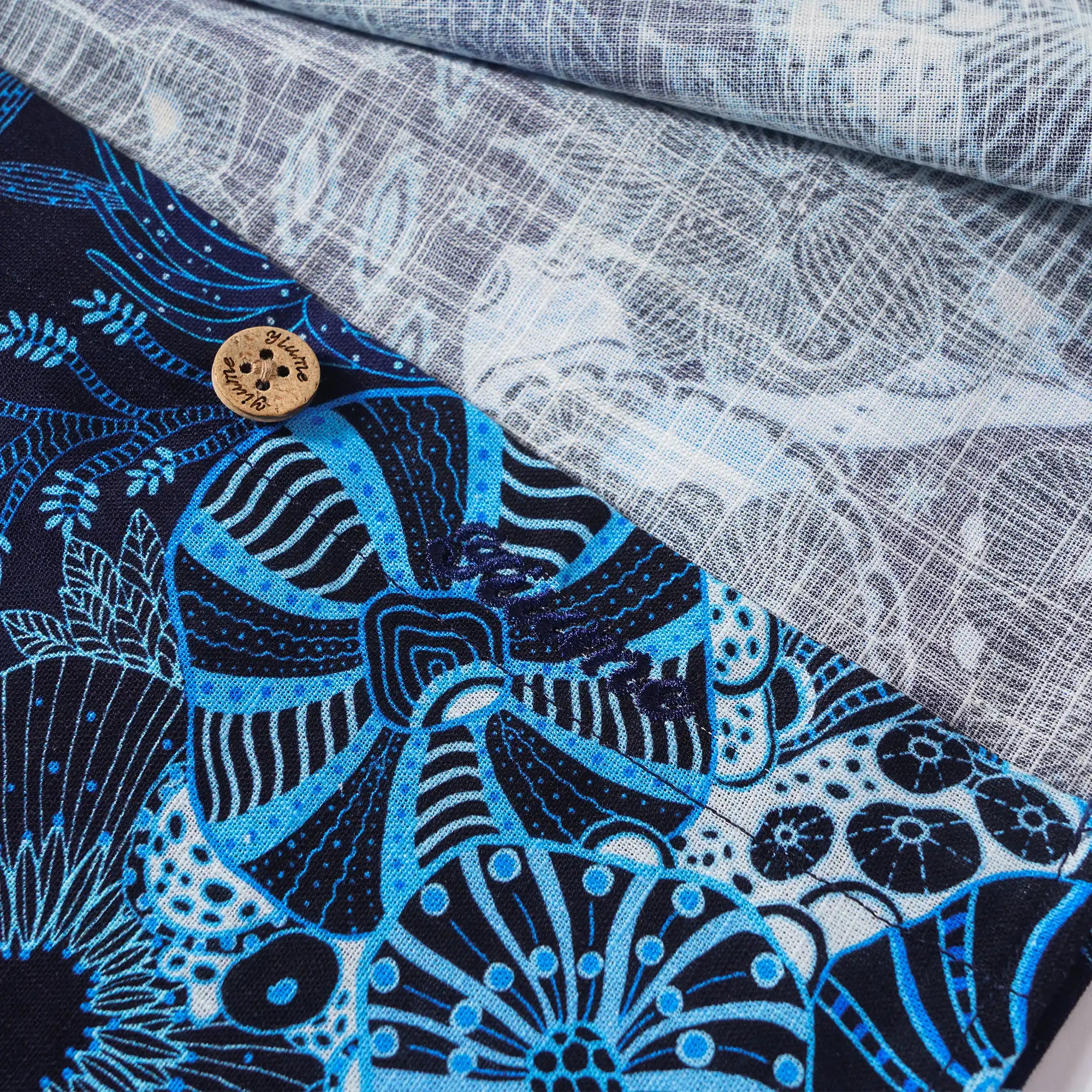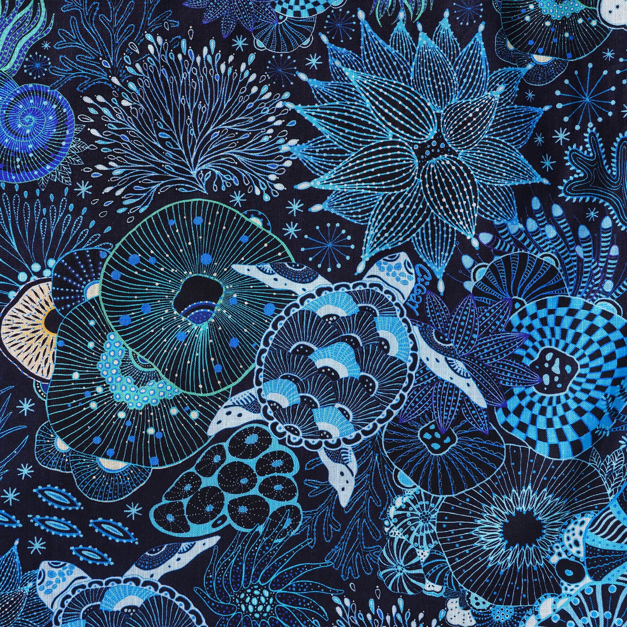 Dive into the depths with this striking deep blue design, reminiscent of the ocean’s mysterious beauty. Delicate linework in an Art Deco style brings intricate coral formations to life, while subtle hints of seafoam green add a luminous glow. A graceful sea turtle glides through the scene, capturing the serene elegance of underwater life. Perfect for adding a touch of ocean-inspired tranquility to your wardrobe—wear the magic of the sea wherever you go.