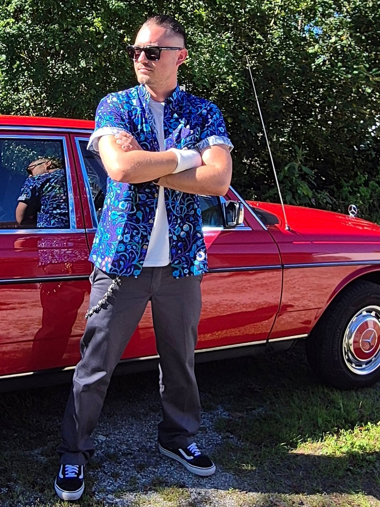 Hokusai inspired Fujiyama Ocean theme blue on white Aloha button down short sleeve shirt was out of its mail box and onto me within an hour! Pictured on me as we visited Christmas Train exhibition Flower Dome Singapore. Shirt is a work of art. Appreciate the spare buttons attached to the laundry instructions tag. Comfortable (although I chose one size too big)