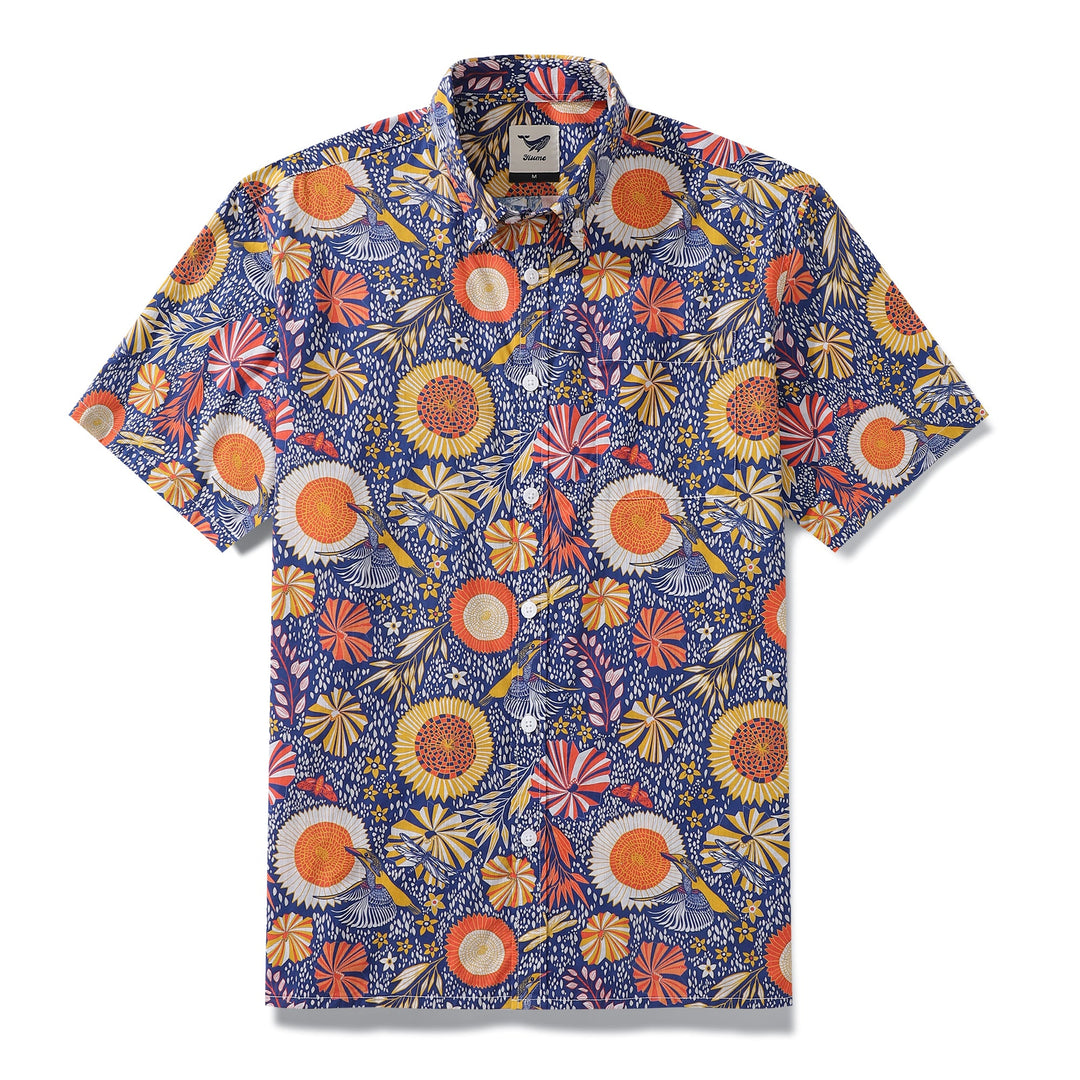 Men's Hawaiian Shirt 1960s Vintage Kingfisher and Flowers Print Cotton Button-down Short Sleeve Aloha Shirt Kingfisher And Flowers By Nina Leth