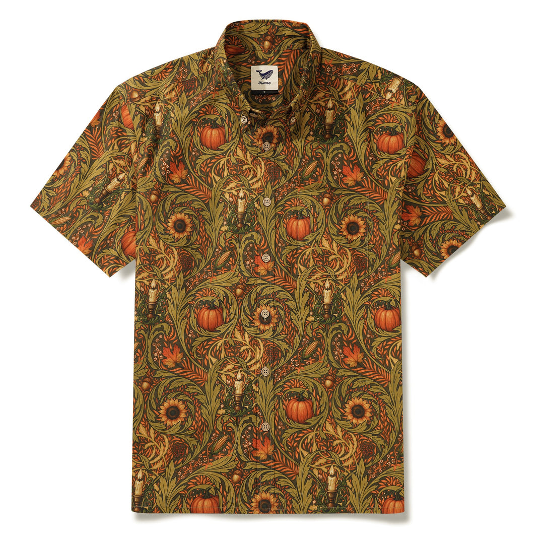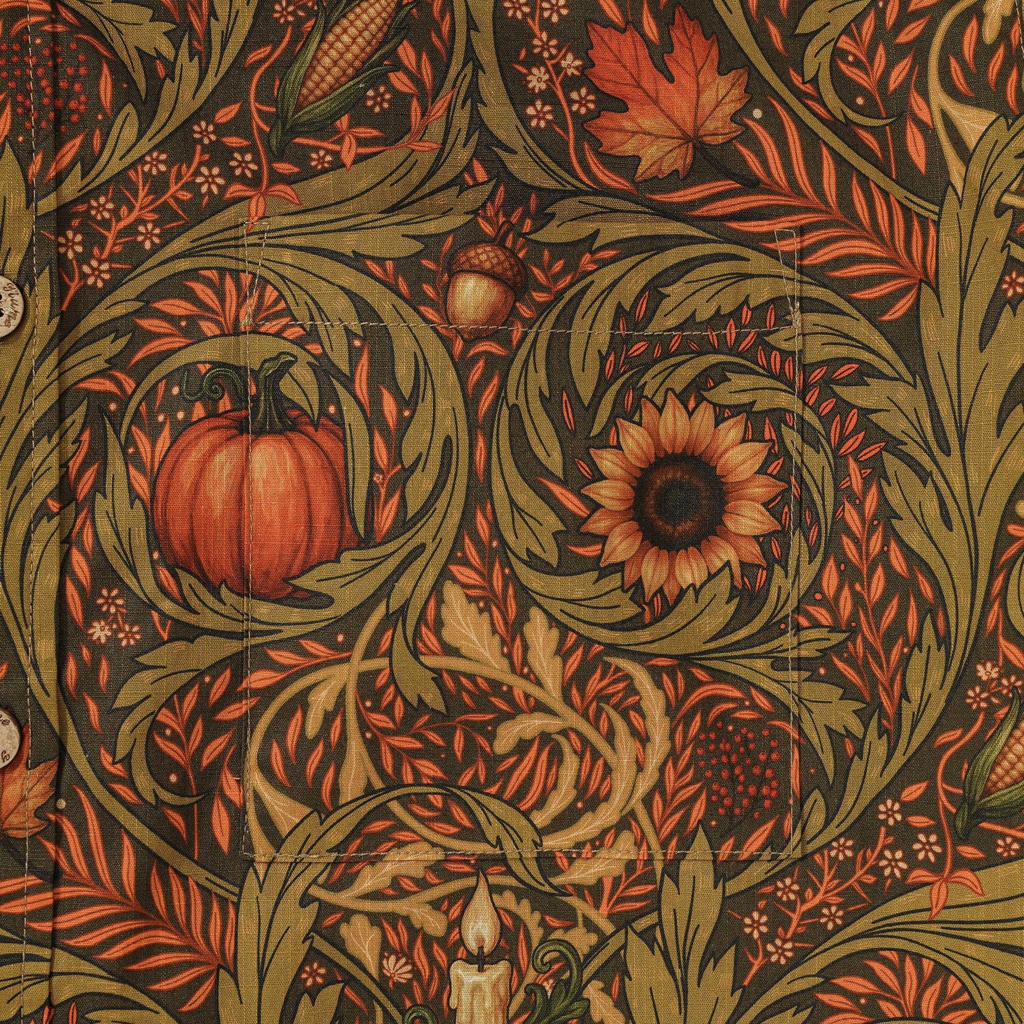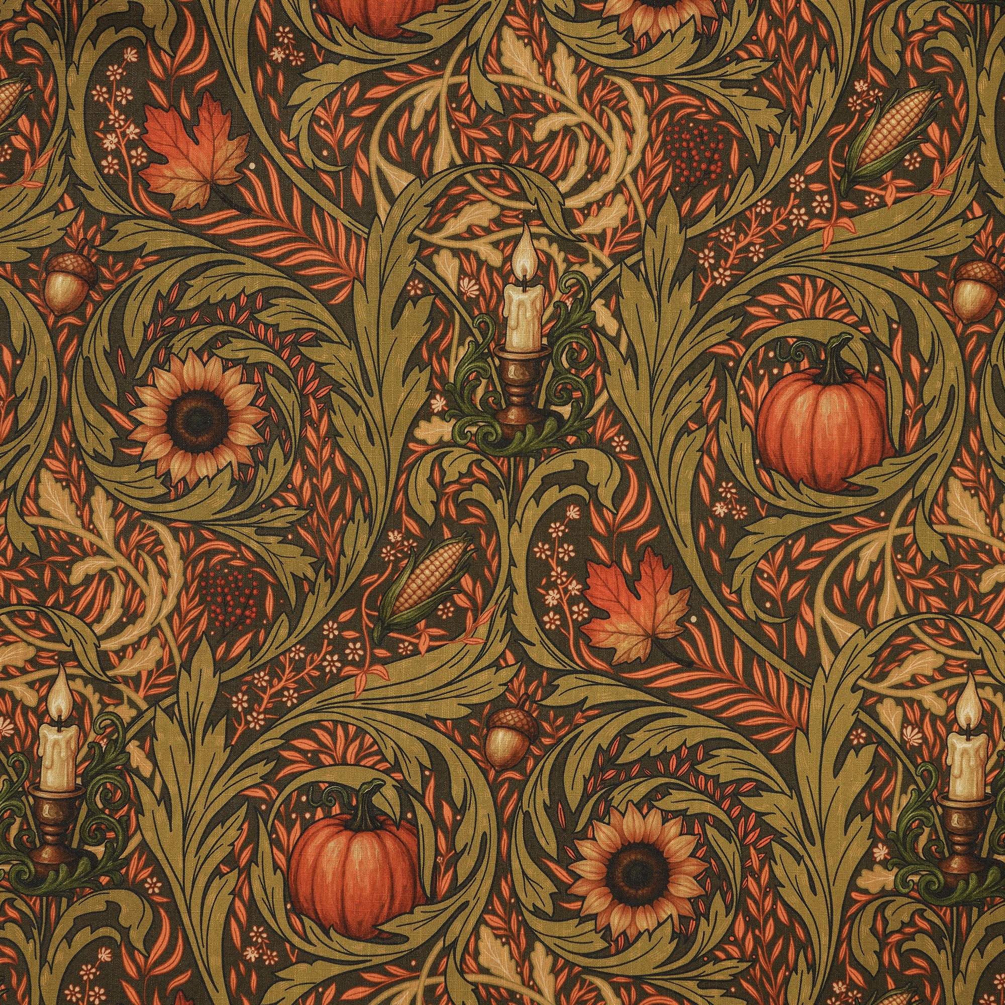 Weave Morris's botanical whispers and the warmth of autumn into the fabric — deep green vines entwine with pumpkins, maple leaves, and corn, hinting at the harvest in shades of orange. Within vintage swirls, the autumn tale slumbers: daily life exudes a refined elegance akin to a stroll through the manor, while gatherings resonate with the gentle spirit of the season, infusing a natural Thanksgiving poetic into the attire.