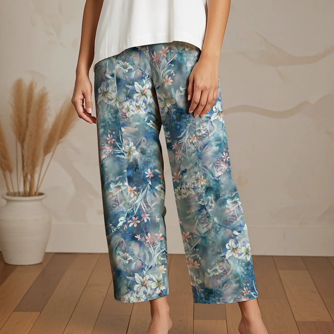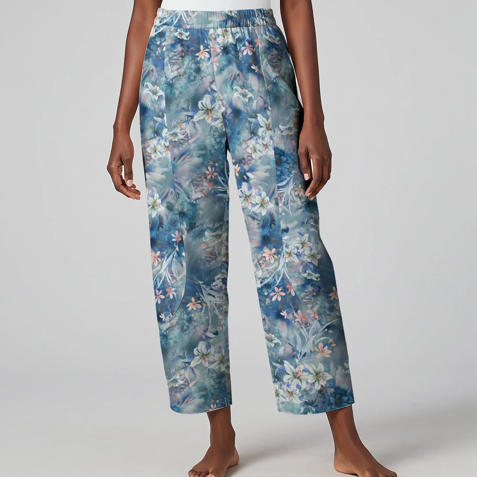 Women Casual Ankle Pants Lounge Elastic Waist with Pockets 93% Lyocell, 7% Linen Blue Aloha Floral Whispers In The Mist