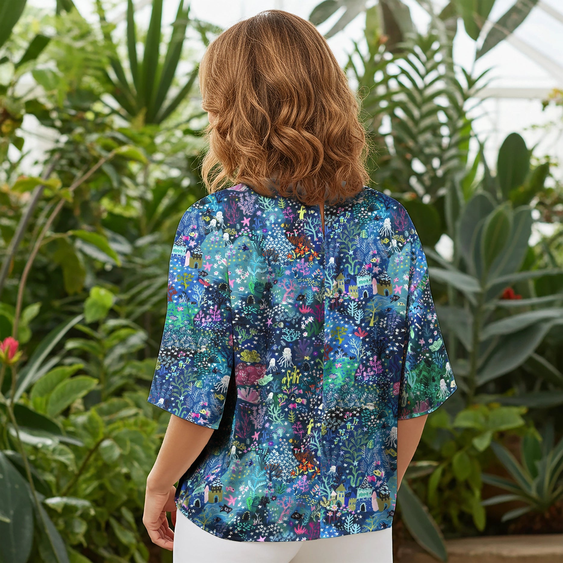 Women Casual Blouse Elbow Sleeve Crew Neck Button-Back 100% Lyocell Blue Aloha Enchanted Underwater World