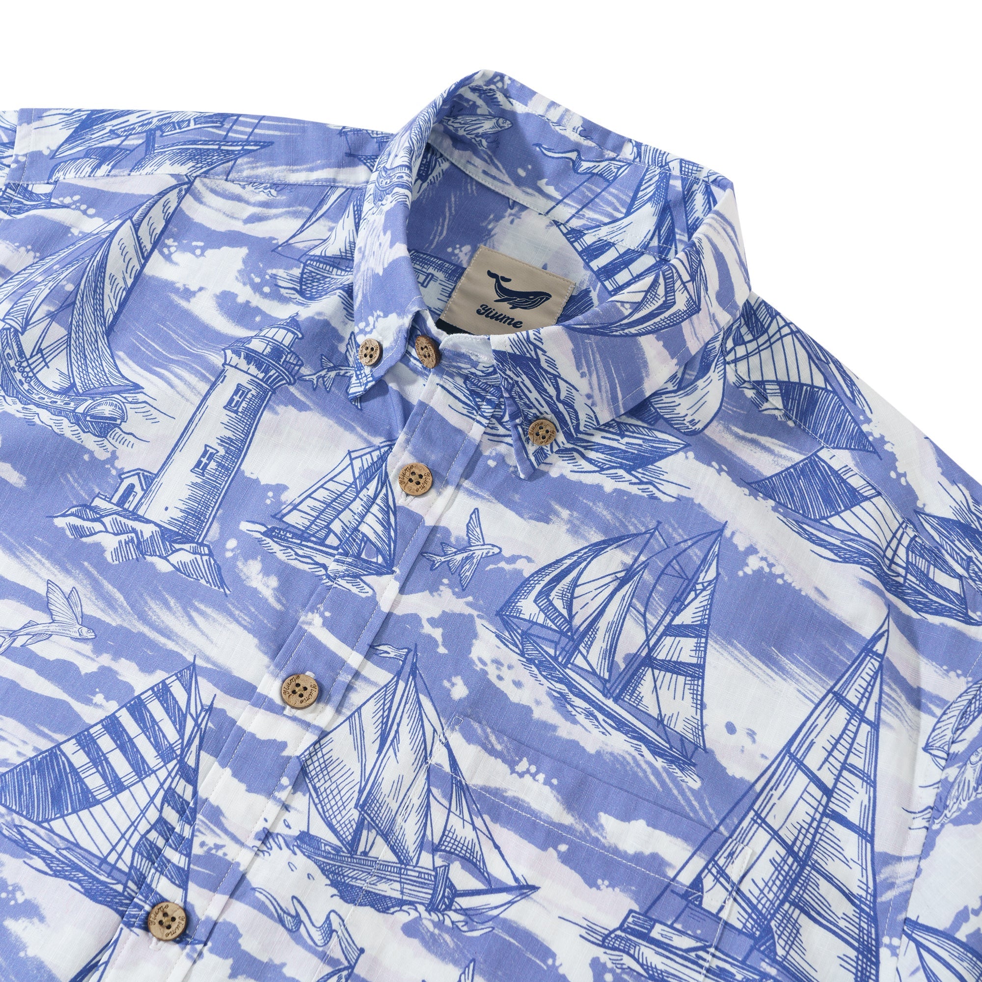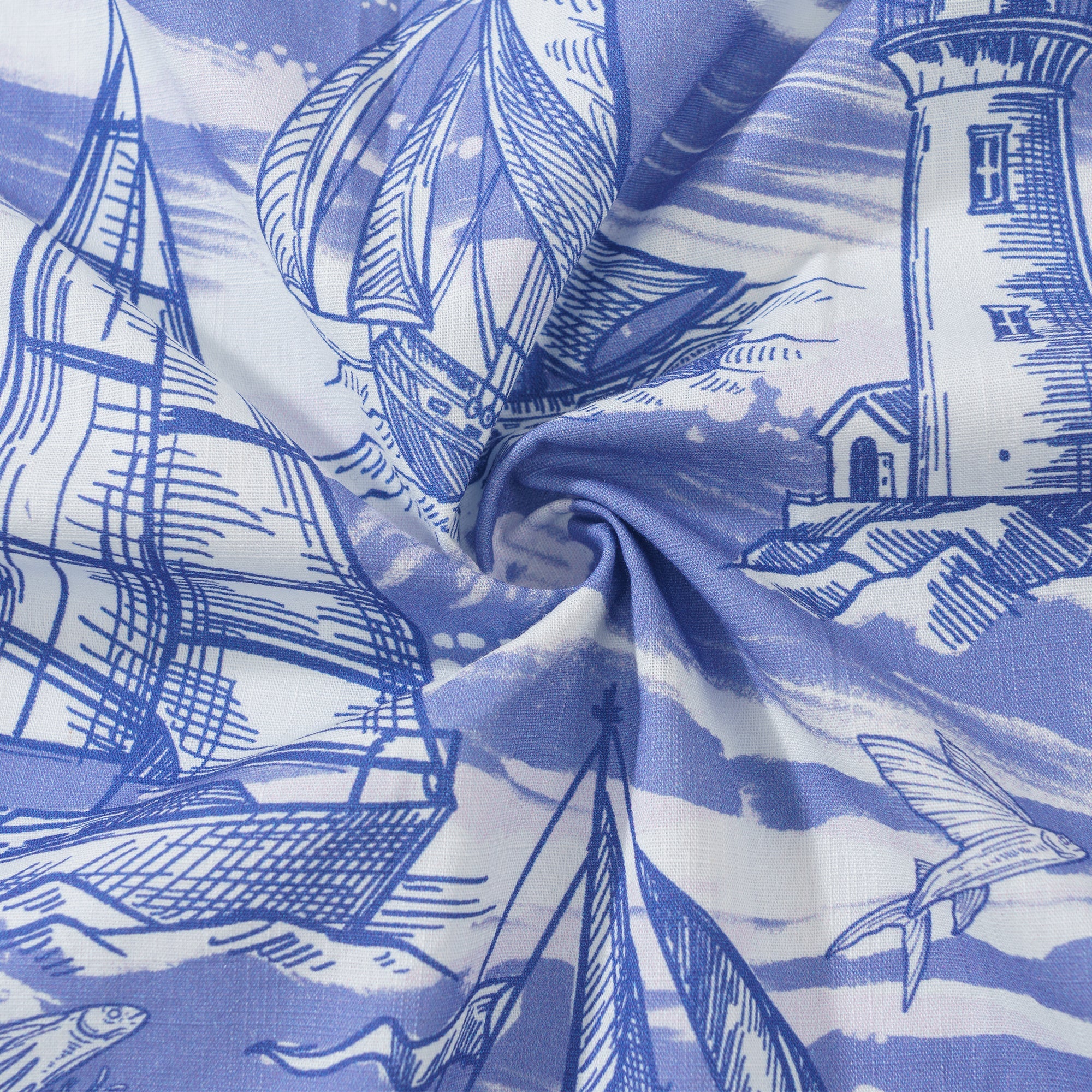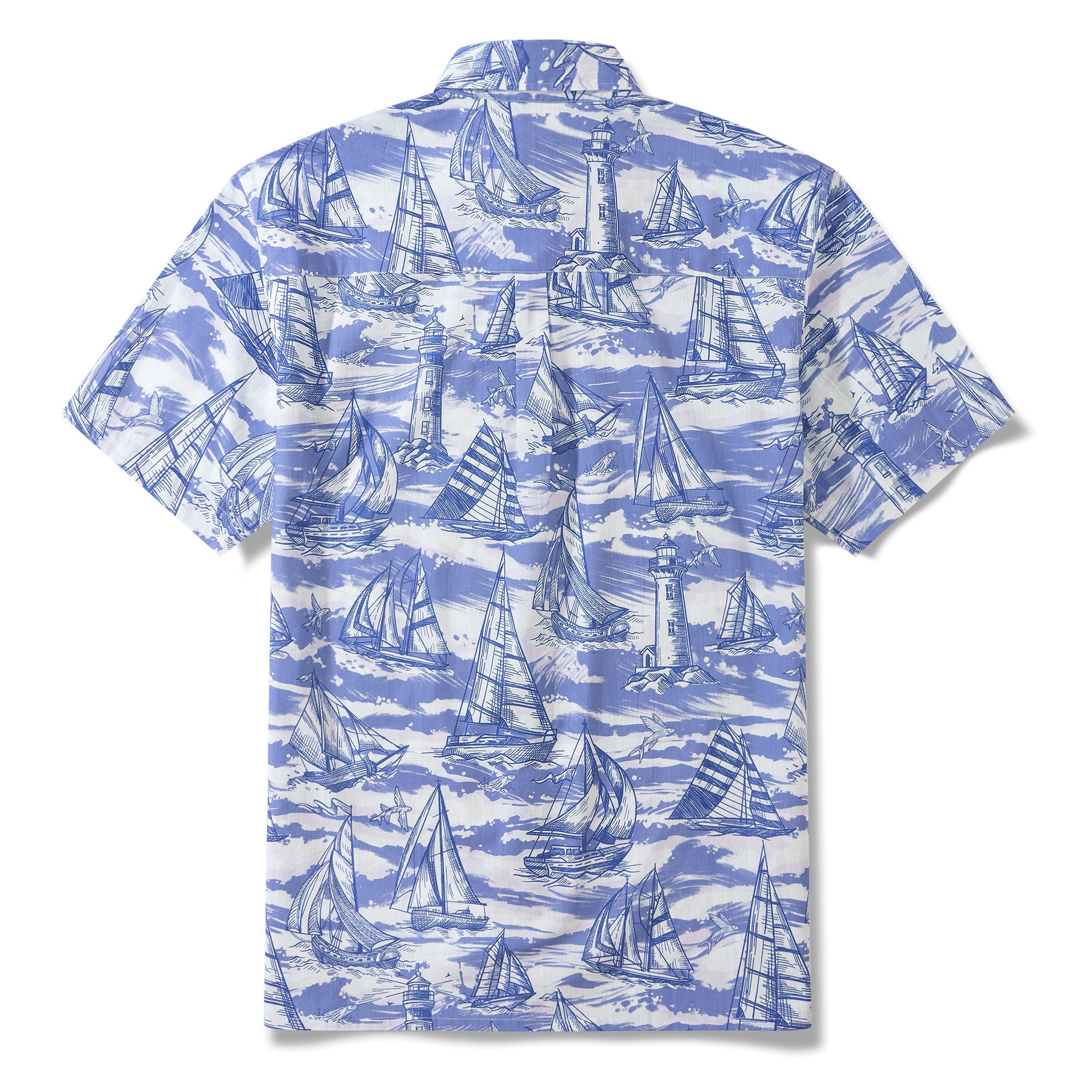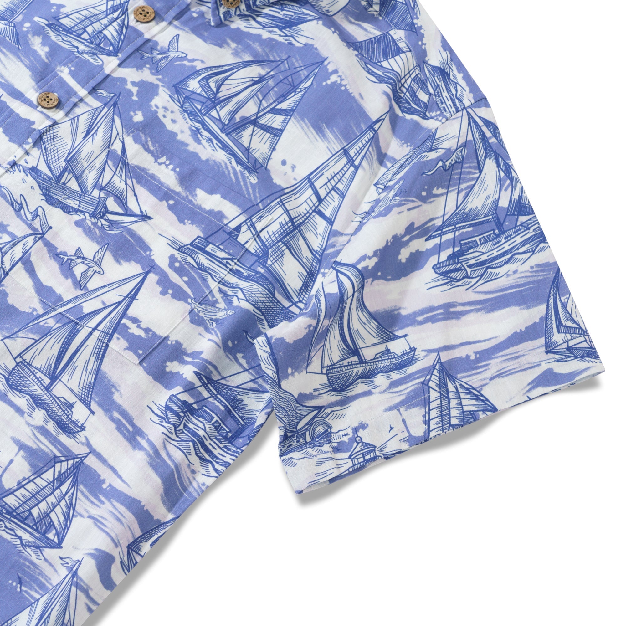 Lebendige blaue und weiße Wellen verweben sich in einem faszinierenden Tanz auf diesem Shirt. Die tiefblauen Wellen prallen gegen die helleren blauen, was einen auffälligen Kontrast schafft. Segelboote mit ihren reichen marineblauen Segeln sind über die Szene verstreut, einige nah und einige in der Ferne. Sie navigieren mutig durch das Meer aus Blau und Weiß und verkörpern grenzenlose Energie und Leidenschaft.