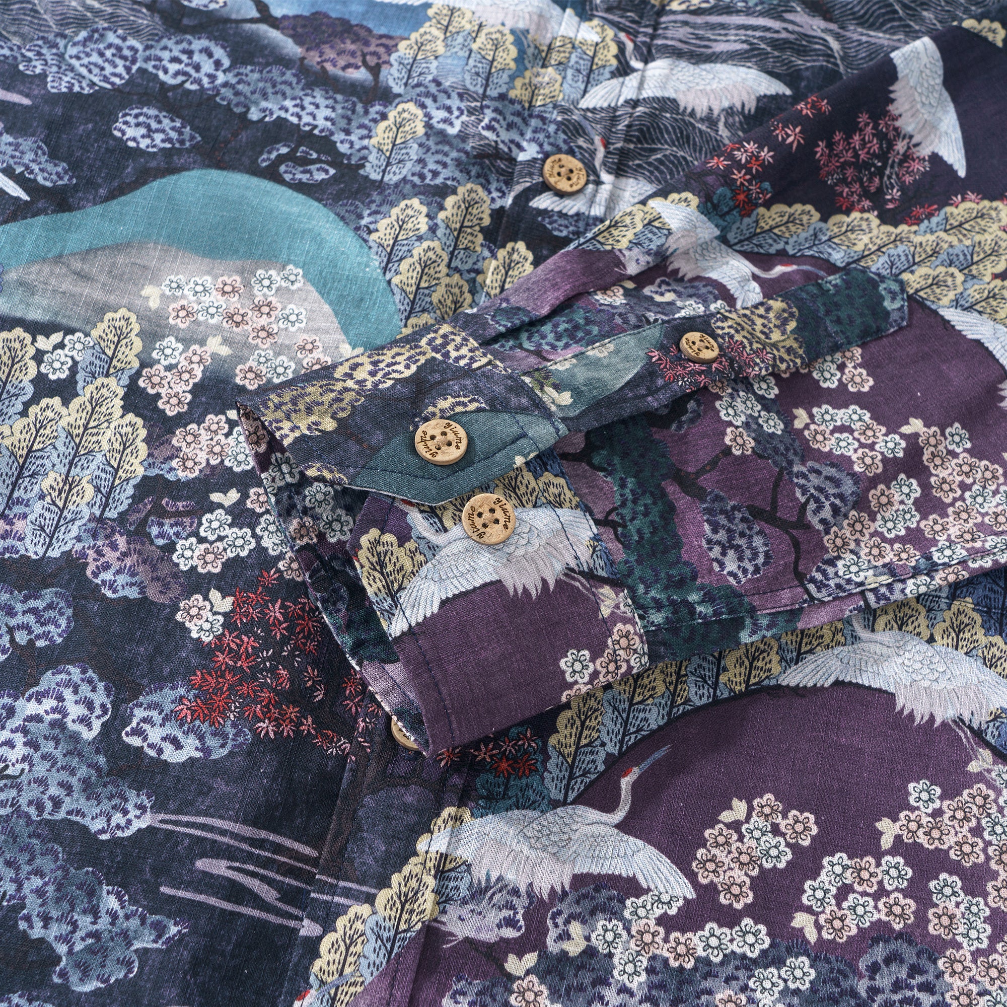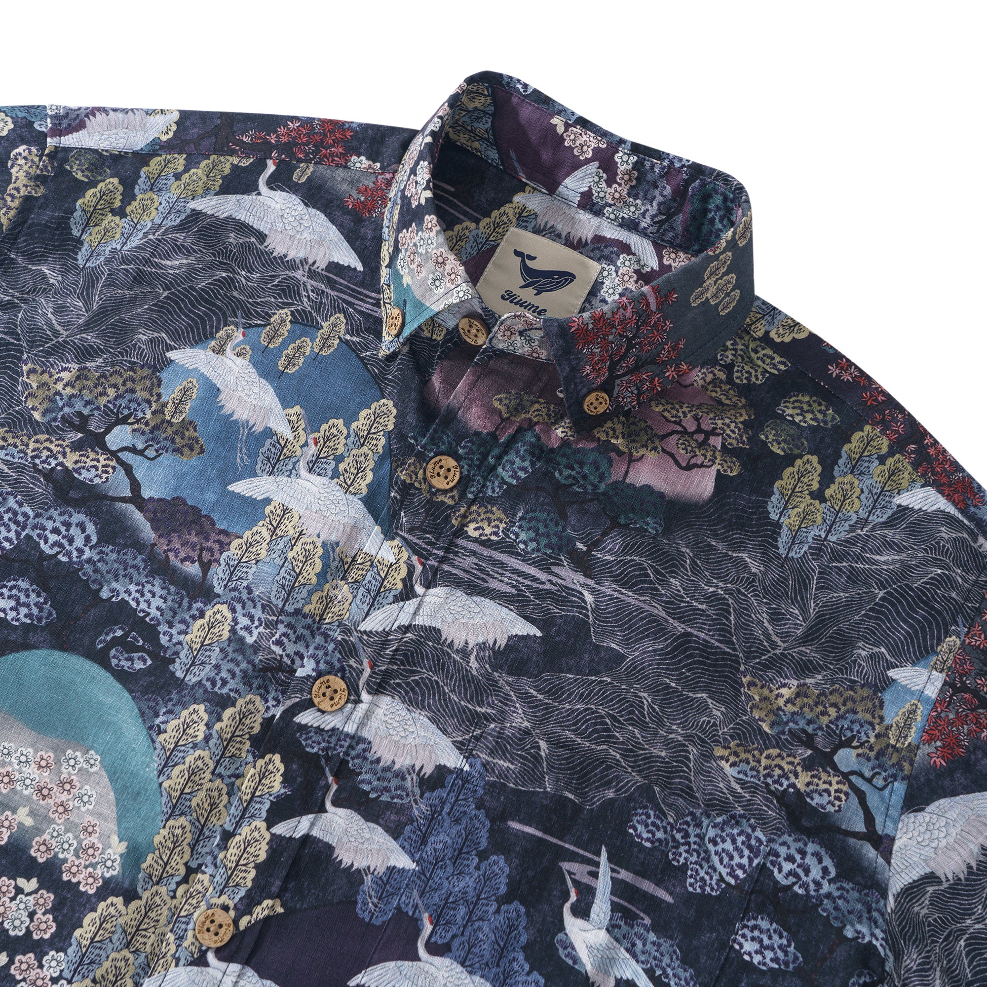 Tanz der Kraniche 100% Baumwolle Herren Aloha Hawaiian Langarm Hemd mit Knopfleiste