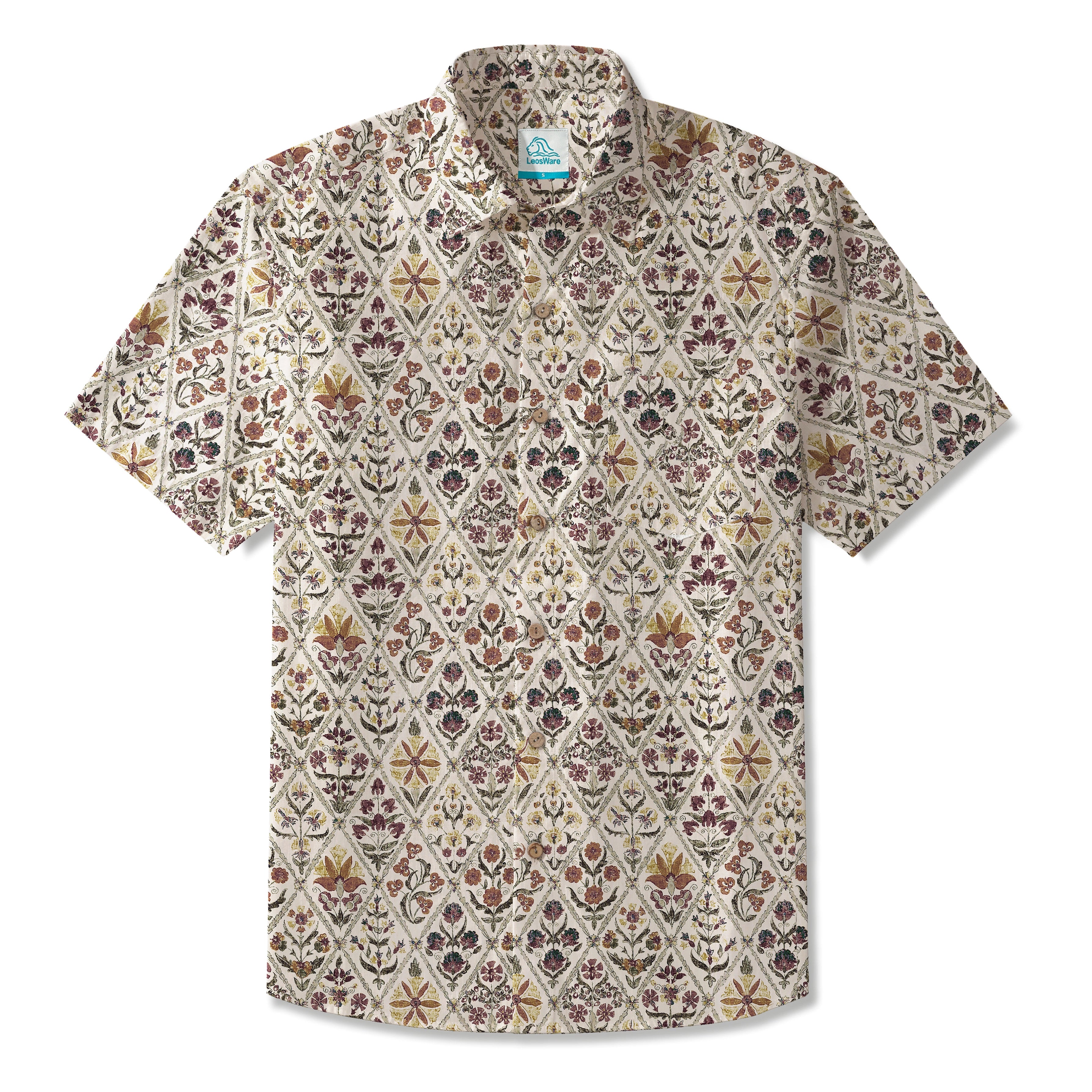 Inspired by traditional geometric textiles and vintage floral aesthetics, our shirt blends intricate florals within diamond frames, in a sophisticated brown-purple palette. Elevating the ordinary floral shirt with a touch of symmetry and artistic allure, embodying the essence of a 'retro geometric gentleman'.