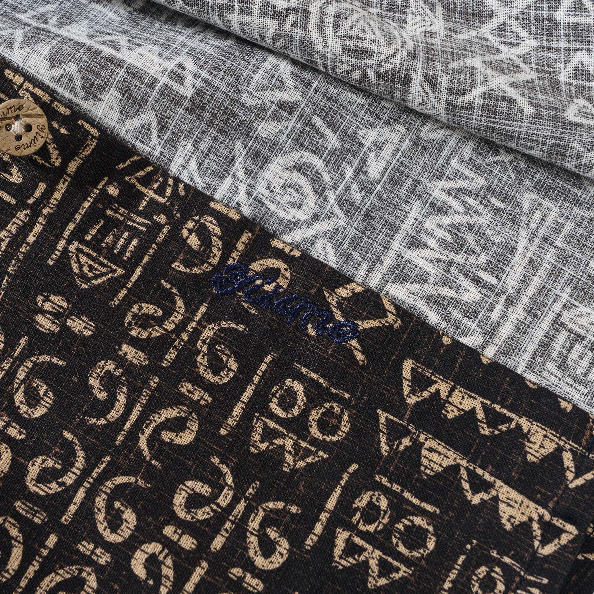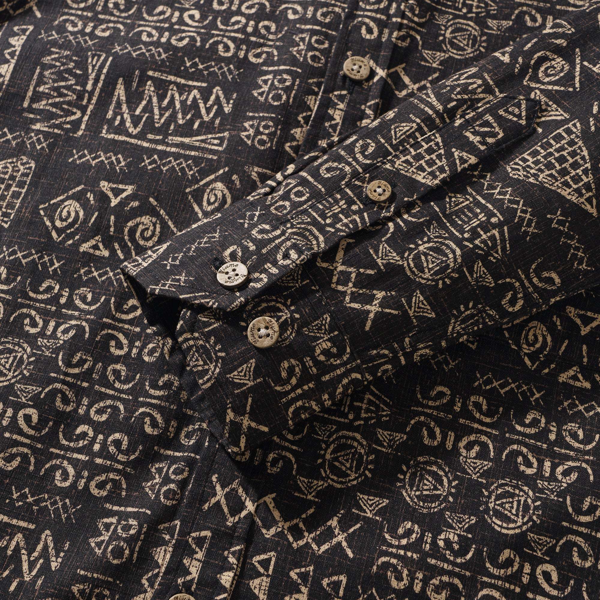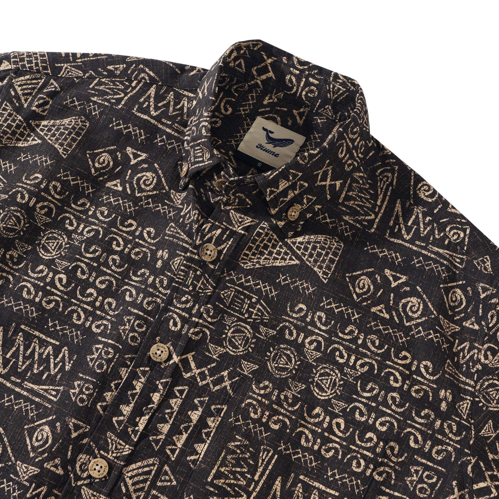 Dieses hawaiianische Hemddesign präsentiert ein geheimnisvolles und fesselndes totemisches runisches Kunstwerk. Mit dunklen Farbtönen, die an alte, tiefe Nächte erinnern, ruft es die rätselhaften Länder Ägyptens in Erinnerung, die von Jahrtausenden Geschichte durchzogen sind. Verflochten mit den khakifarbenen Runen, die mit einem mystischen Glanz strahlen, fangen die starren, aber dynamischen Linien der Symbole das Wesen antiker ägyptischer Motive und tribalistischer Muster ein, als würden sie alte Geschichten erzählen. Der verwitterte Effekt spiegelt die Spuren wider, die die Zeit an ägyptischen Pyramiden und Stammesruinen hinterlassen hat, und hüllt das gesamte Design in eine reiche historische Atmosphäre. Es fühlt sich an, als würde man durch die Zeit reisen und den Puls antiker Zivilisationen berühren.