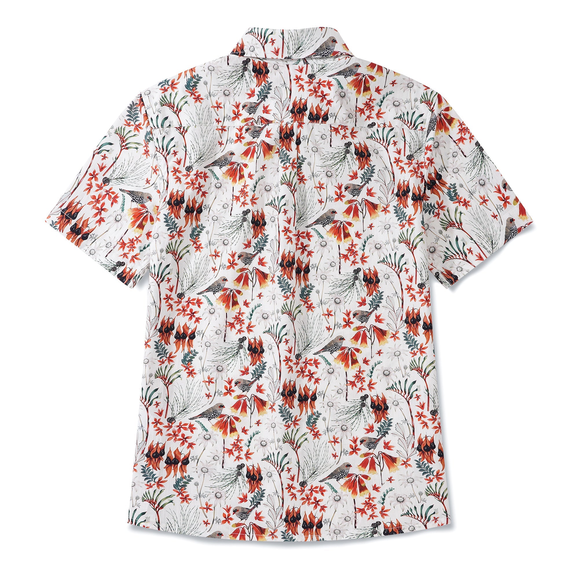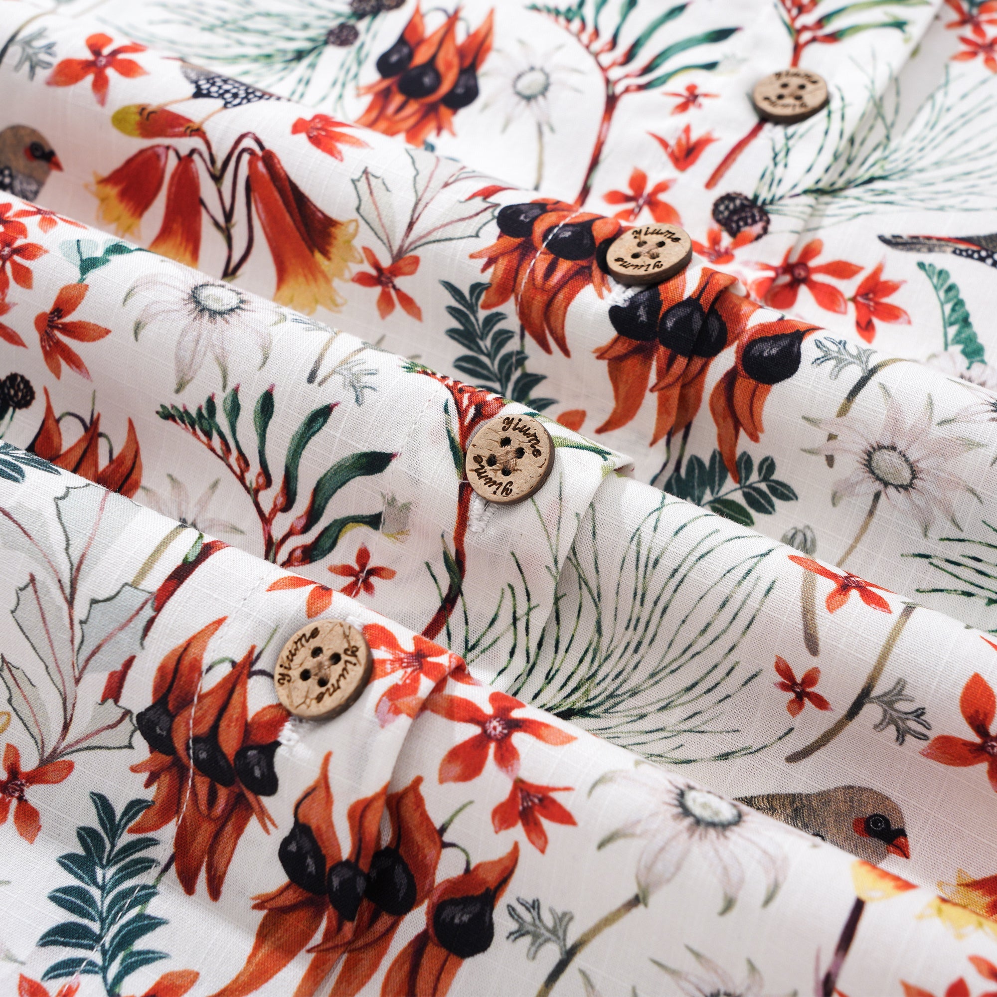 Dieses stylische Shirt zeigt ein handgemaltes Design mit leuchtenden Feuerschwanzfinken und einheimischen australischen Blüten – Flanellblumen, Kängurupfoten, Sturts Wüstenerbsen und Weihnachtsglöckchen. Eine einzigartige Mischung aus Inselflair und Down-Under-Charme.