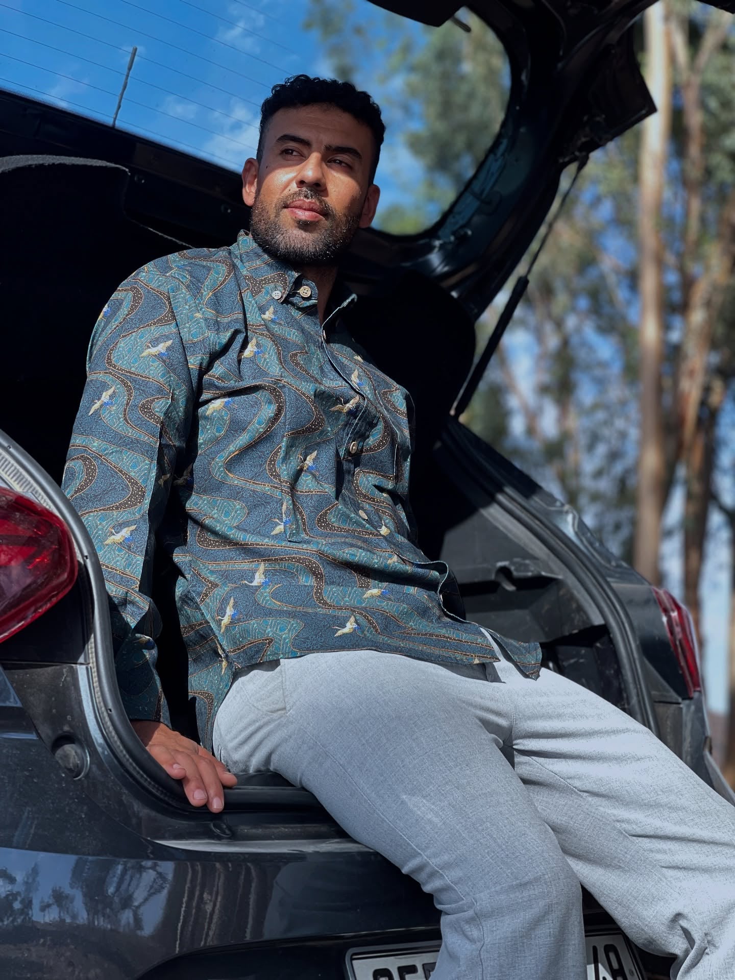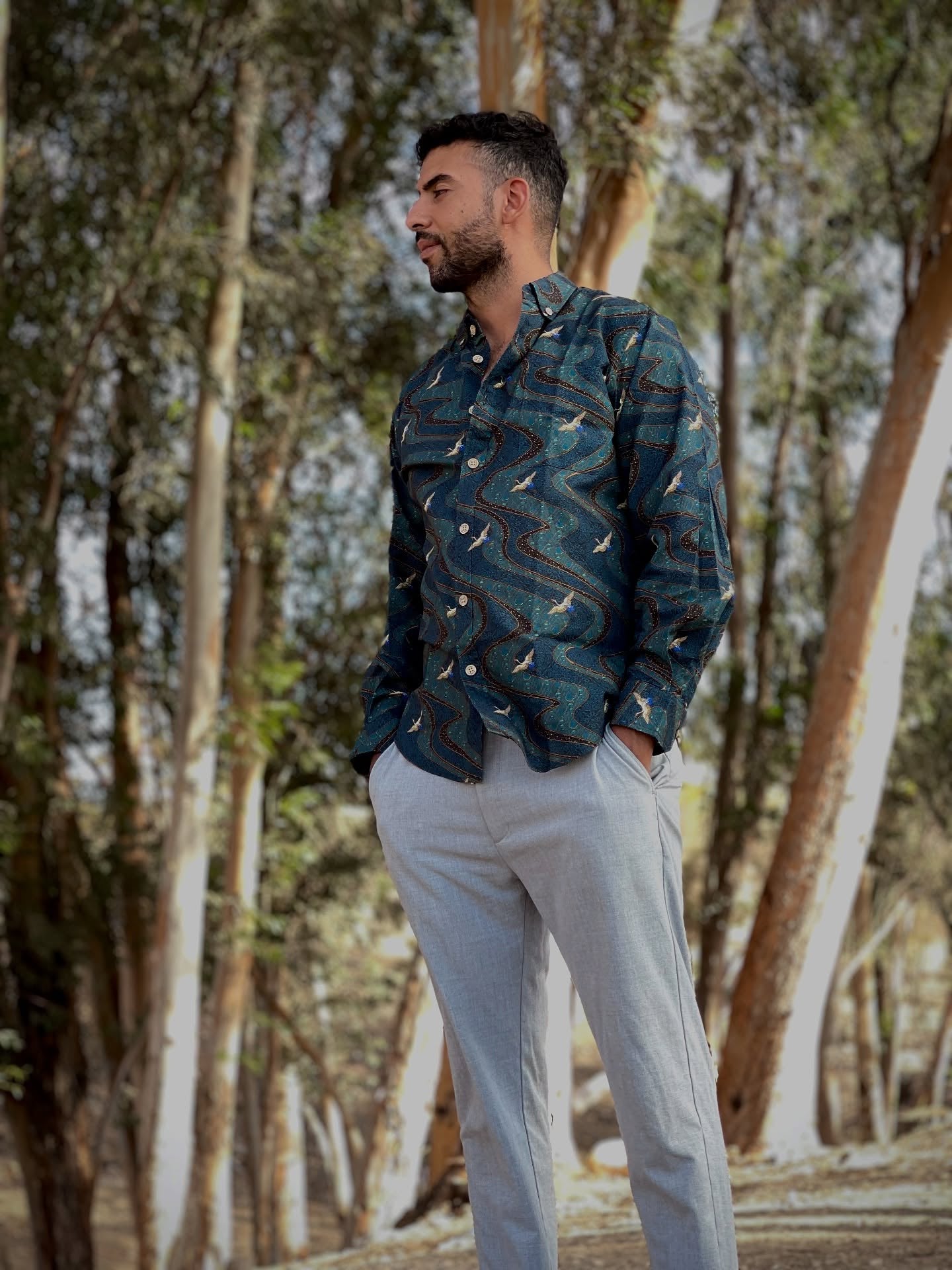 • Print-abgestimmte linke Brusttasche und Knopfleiste
