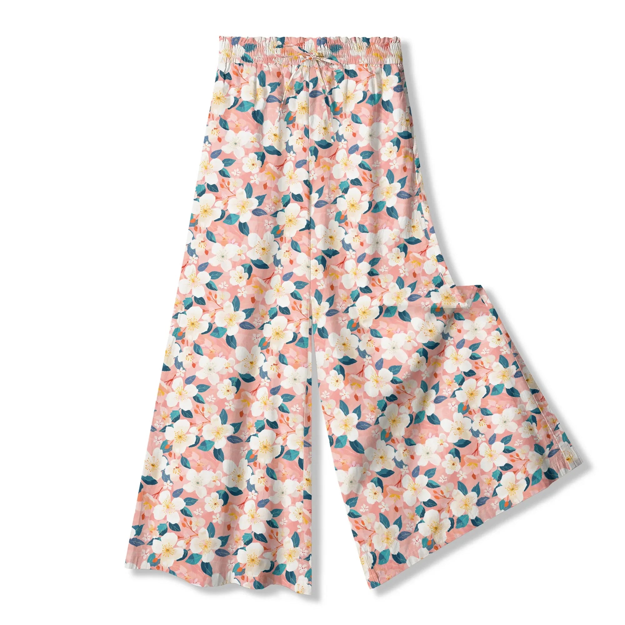 Women's Casual Floral Wide Leg Palazzo Pants Lounge Elastic Waist Drawstring with Pockets 100% Cotton Aloha Cherry Blossom Spring Delight