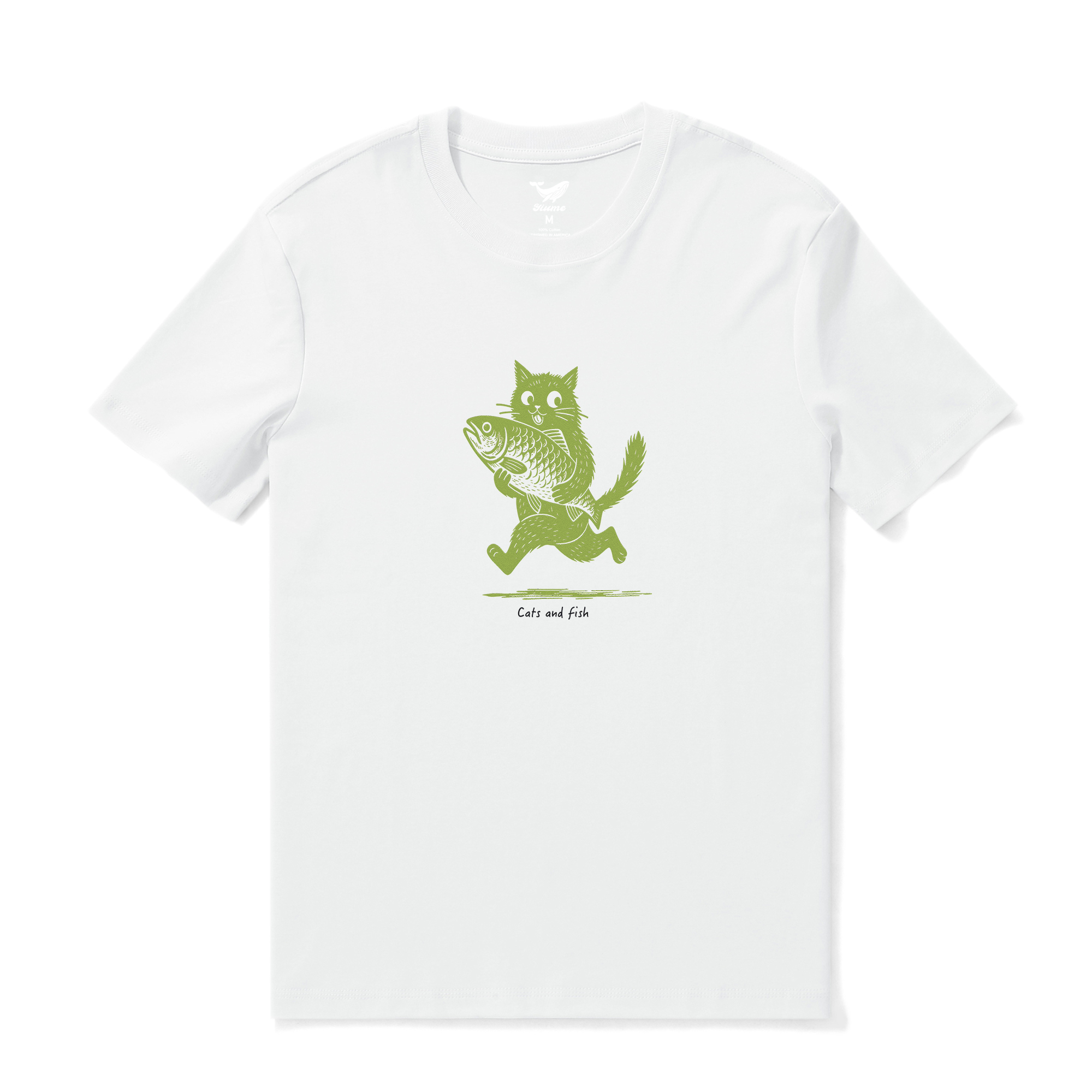 Green Cat Fish Hawaiian Tee Shirt Short Sleeve 100% Cotton Green Aloha Cat Love Fish