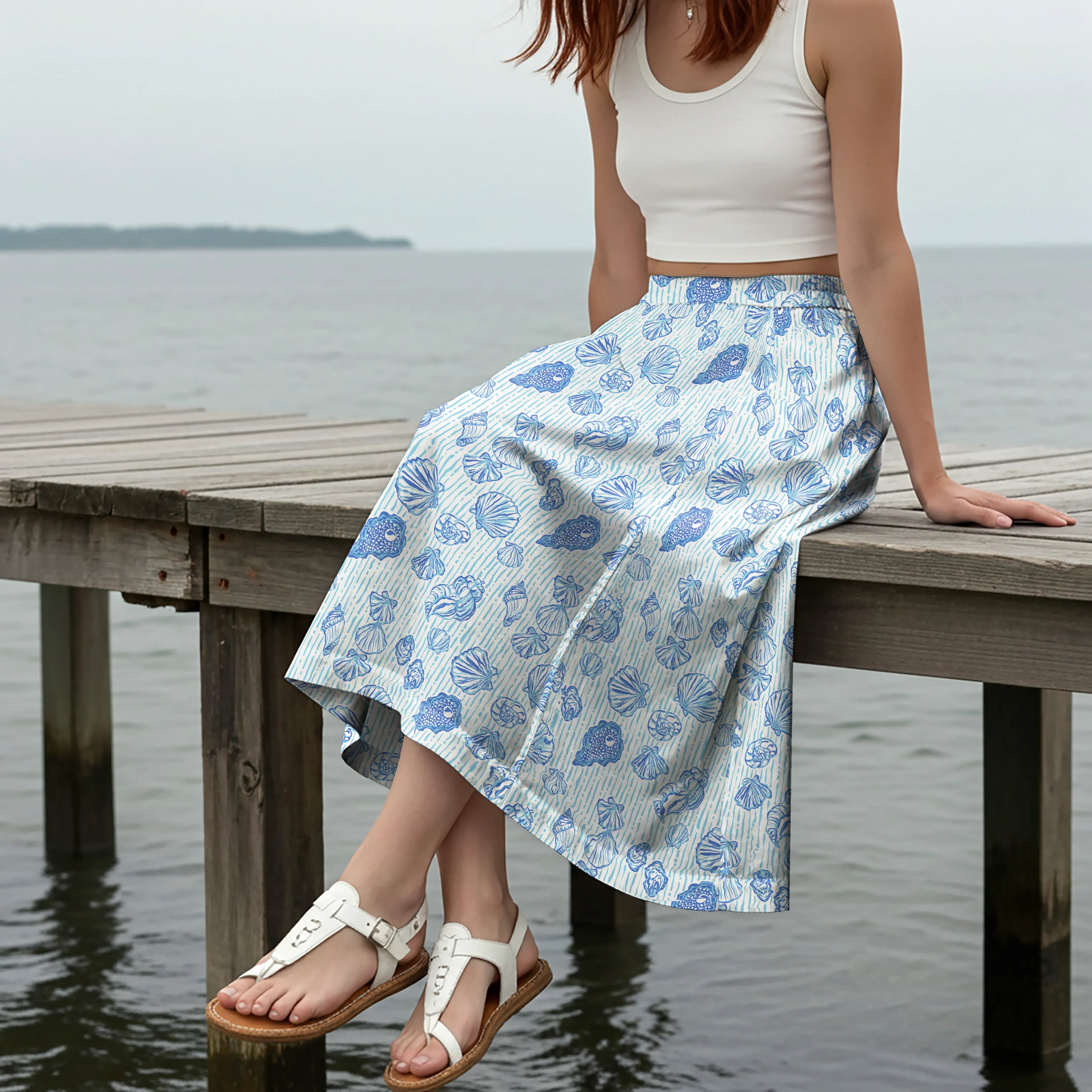Women Casual Maxi Skirt Long Elastic Waist with Pockets 100% Cotton Blue Aloha Shallow Blue Clam