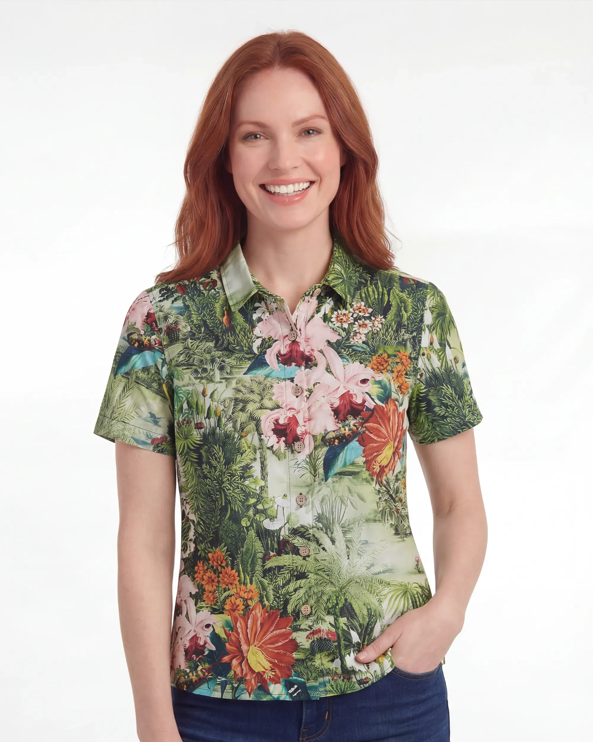 Dieses farbenfrohe Hemd zeigt ein üppiges tropisches Dschungel-Blumenmuster. Hohe Palmen mit ihren federähnlichen Blättern ragen empor und versprühen tropischen Charme. Verschiedene üppige Büsche und Stauden ranken und wachsen ineinander und zeigen mit ihren unterschiedlichen Blattformen – groß, schlank und vielfältig – die Vielfalt der Dschungelvegetation. Die farbenfrohen Blüten sind das Highlight des Designs. Elegante rosa Orchideen blühen anmutig, auffällige rote Blüten ziehen die Blicke auf sich, zarte weiße Blüten sorgen für eine frische Note und lebendige orange Blüten heben sich vom Hintergrund ab. Die Kombination von Blumen in verschiedenen Farben und Formen schafft eine warme und lebendige Atmosphäre. Das Gesamtdesign präsentiert ein sich wiederholendes Arrangement und erzeugt einen durchgehenden und harmonischen visuellen Effekt, der äußerst dekorativ ist. Es bringt eine üppige tropische Atmosphäre und natürliche Energie in jeden Raum.