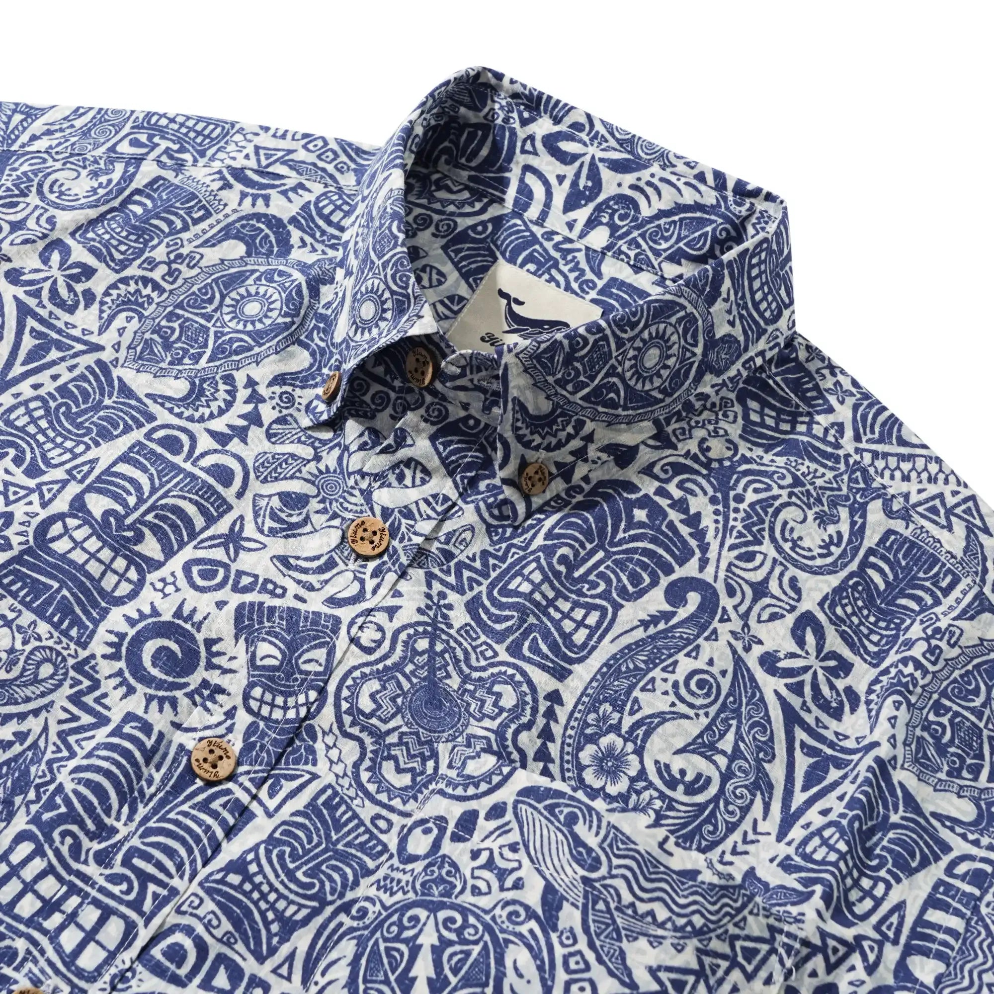 Men's Hawaiian Shirt Short Sleeve Button-down 100% Cotton Blue Aloha Tiki Retro Totem