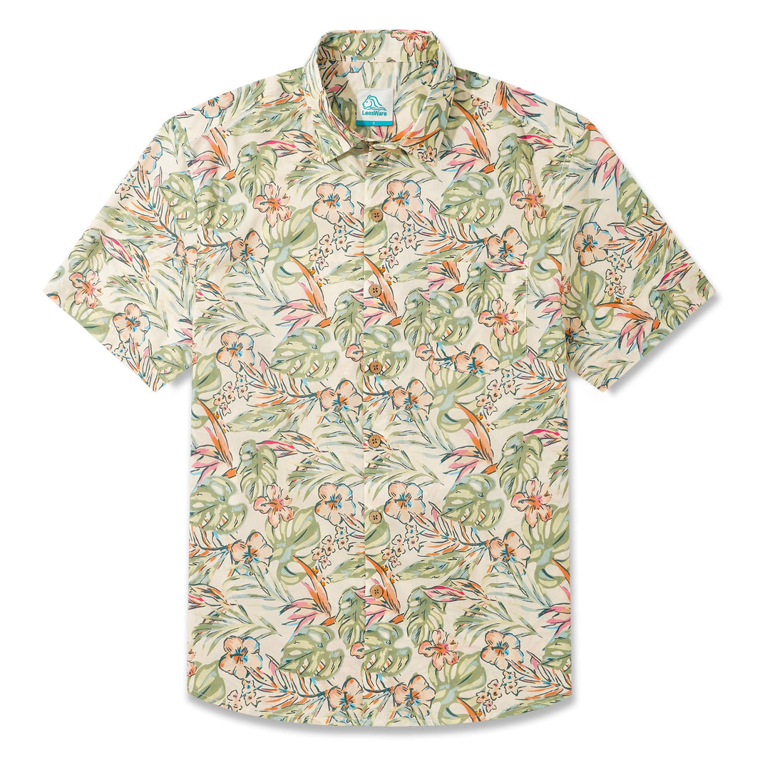 LeosWare® Men's Hawaiian Shirt Short Sleeve Button-up 100% Cotton Beige Aloha Fresh Tropical Plant Art