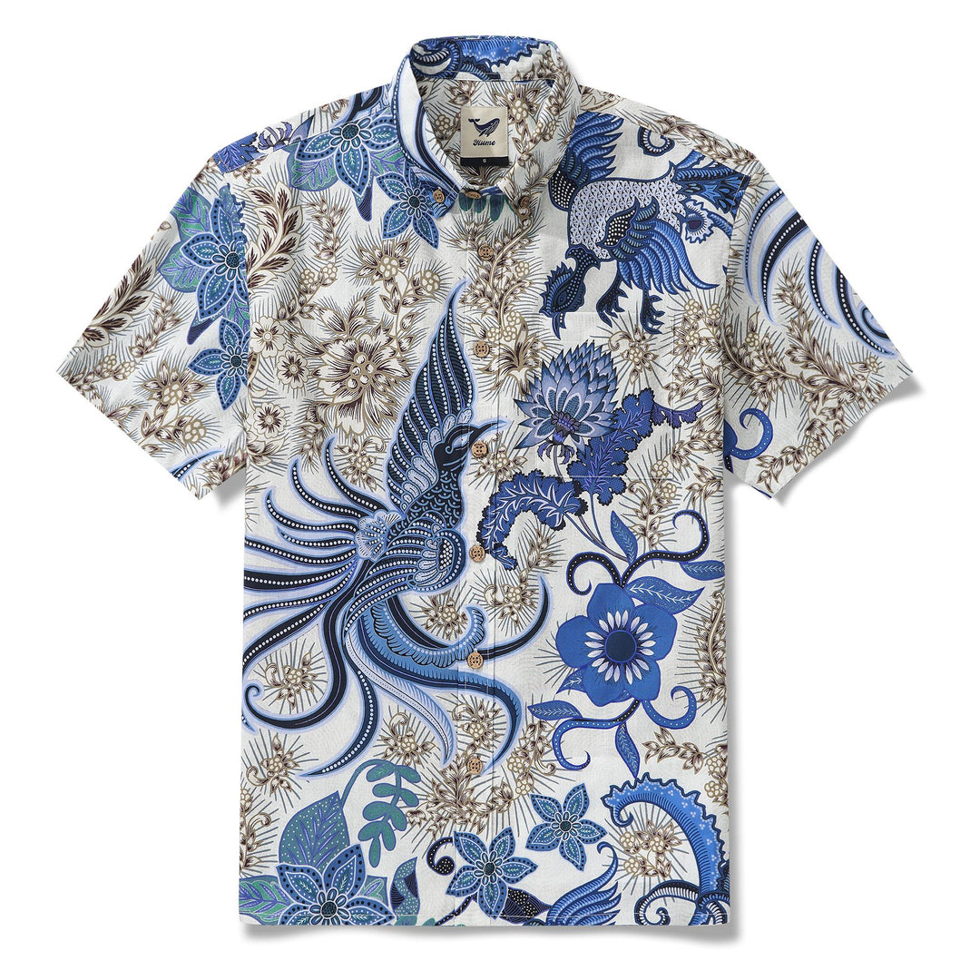 Satte Indigo- und Goldtöne verflechten sich in diesem exquisiten Batik-Design. Ein majestätischer Phönix steht im Mittelpunkt – sein tiefblauer Körper erinnert an den Nachthimmel, während sein strahlend gelbes Gefieder wie die Morgendämmerung leuchtet. Um ihn herum blühen goldene Blumen in voller Pracht, deren Blütenblätter sich mit zarter Anmut entfalten. Verwobene blaue Ranken und Blätter vervollständigen das filigrane Muster und erzeugen einen markanten Kontrast aus Dunkel und Hell. Inspiriert von östlicher Kunstfertigkeit erzählt dieses Hemd eine zeitlose Geschichte von Eleganz und Mystik – perfekt für alle, die Handwerkskunst mit einem Hauch von Legende schätzen.