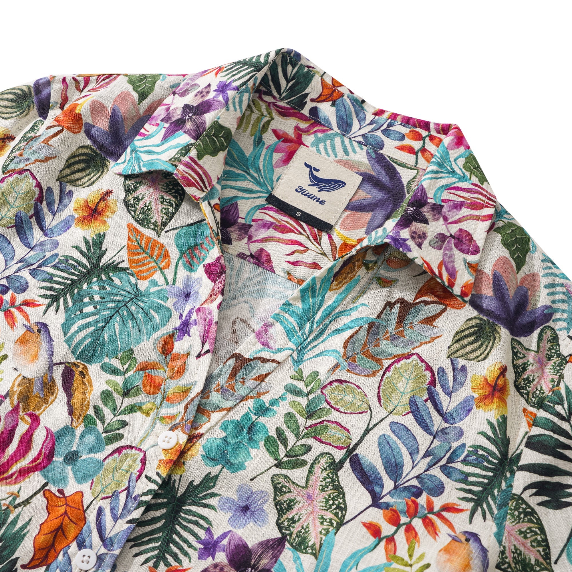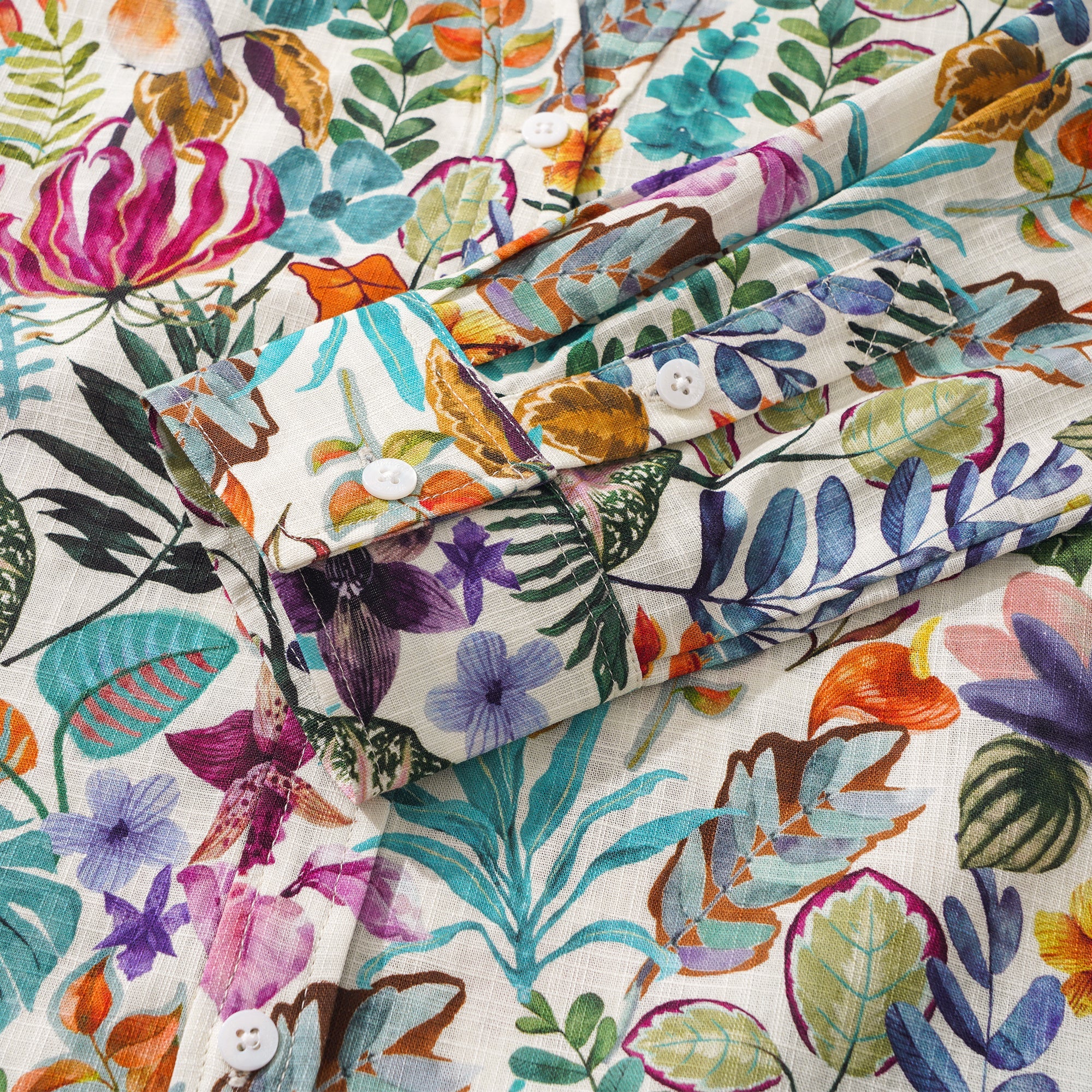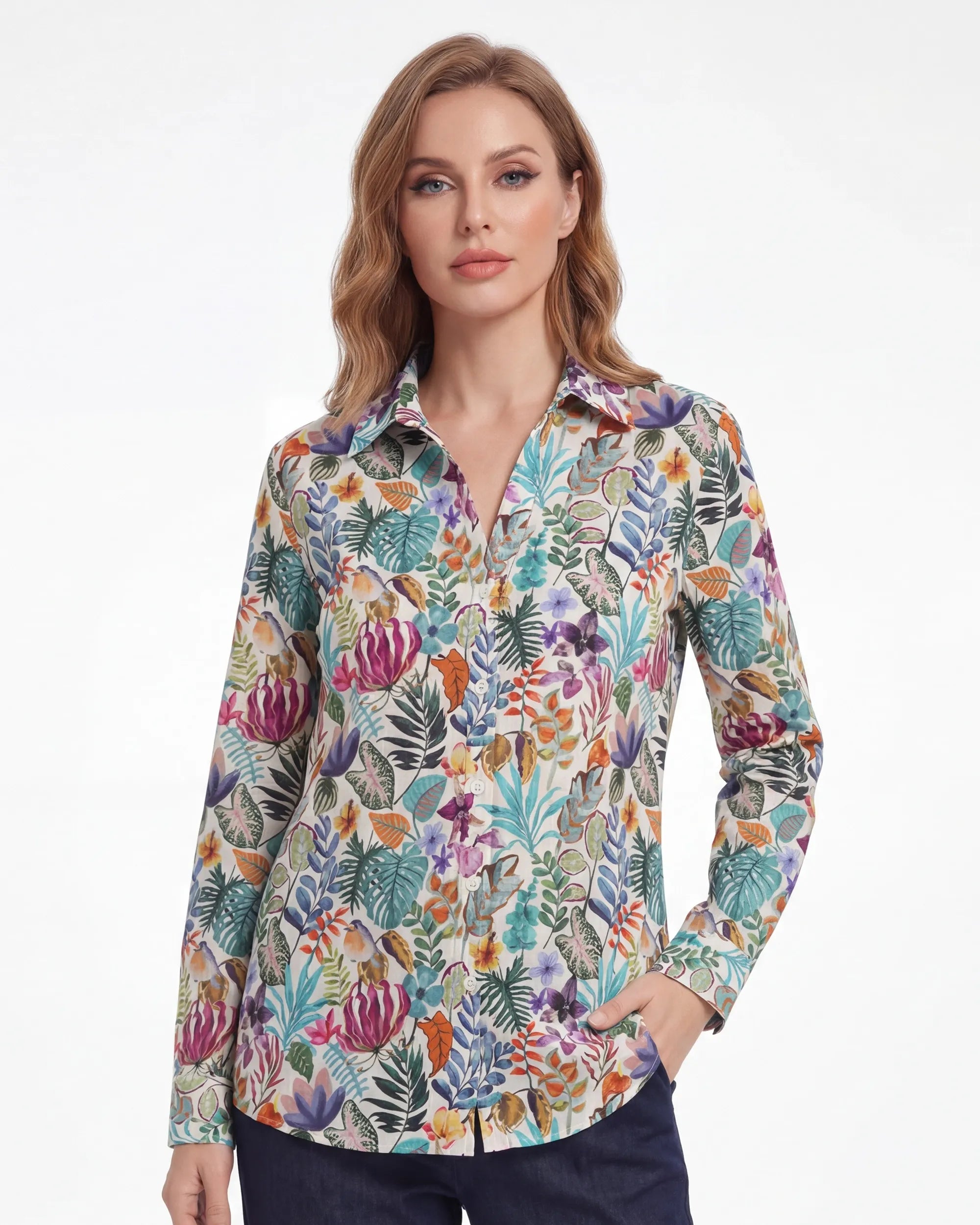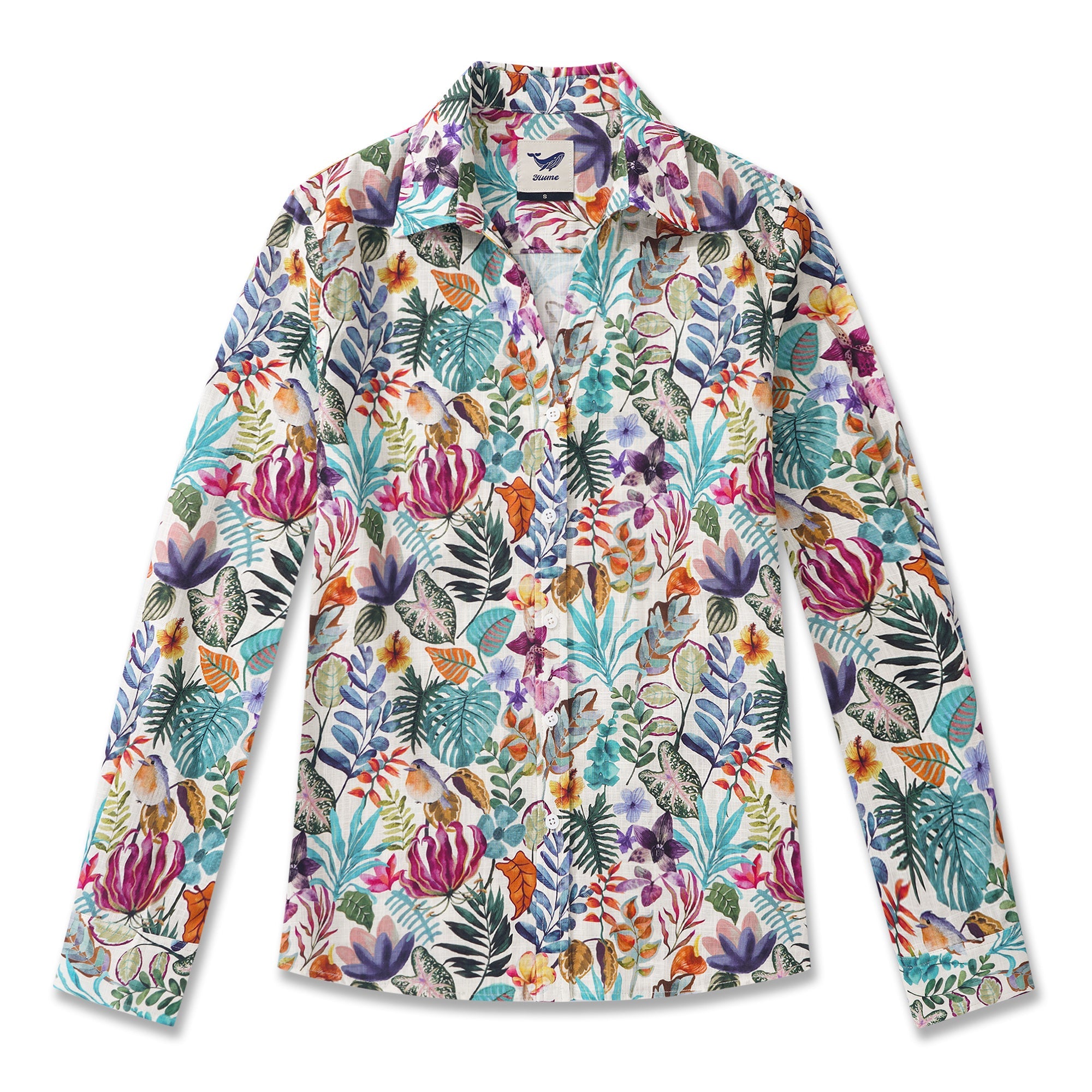 Tropisches Oasen-Nachmittagshemd 100% Baumwolle Damen Langarm V-Ausschnitt Hemd Blau Aloha Hawaiian