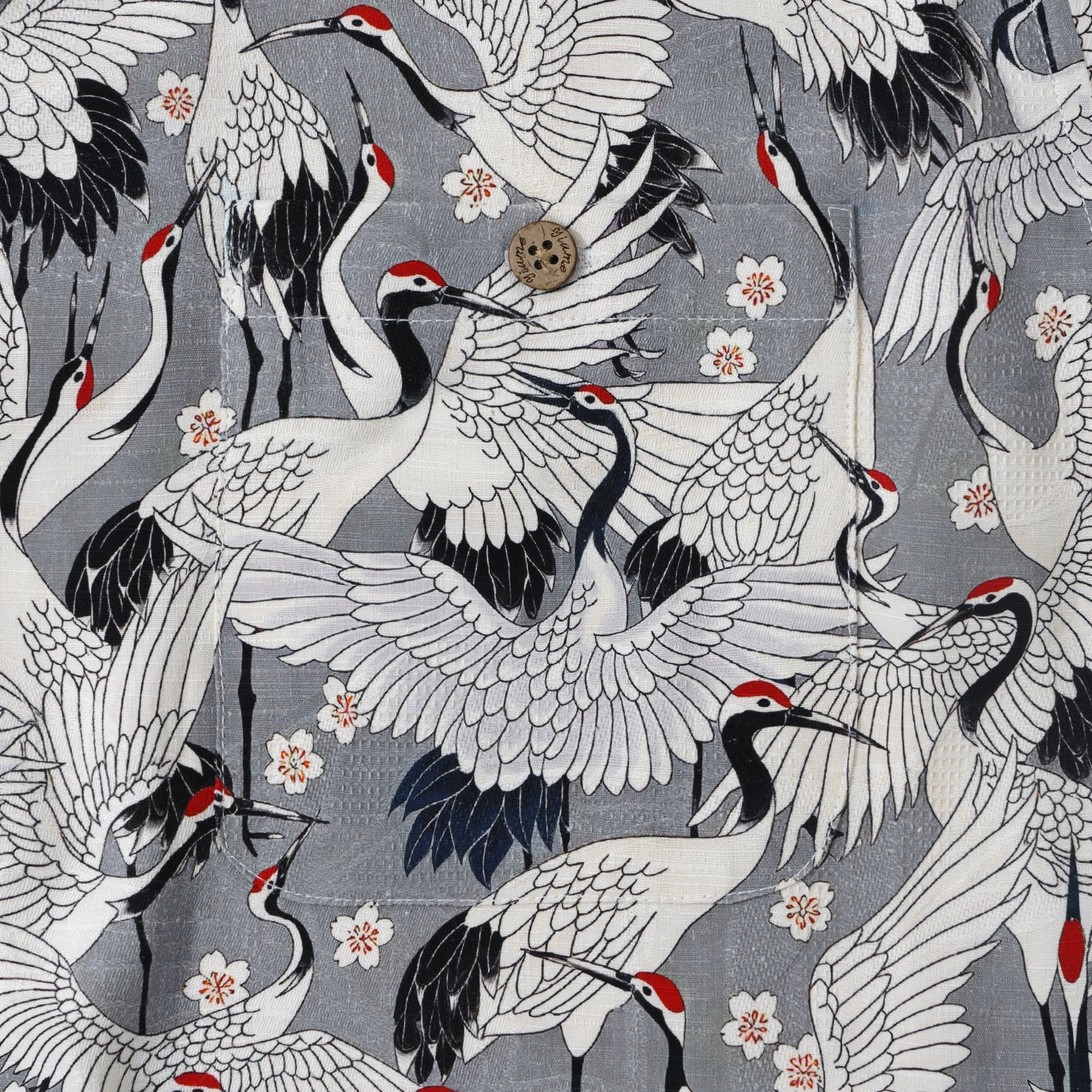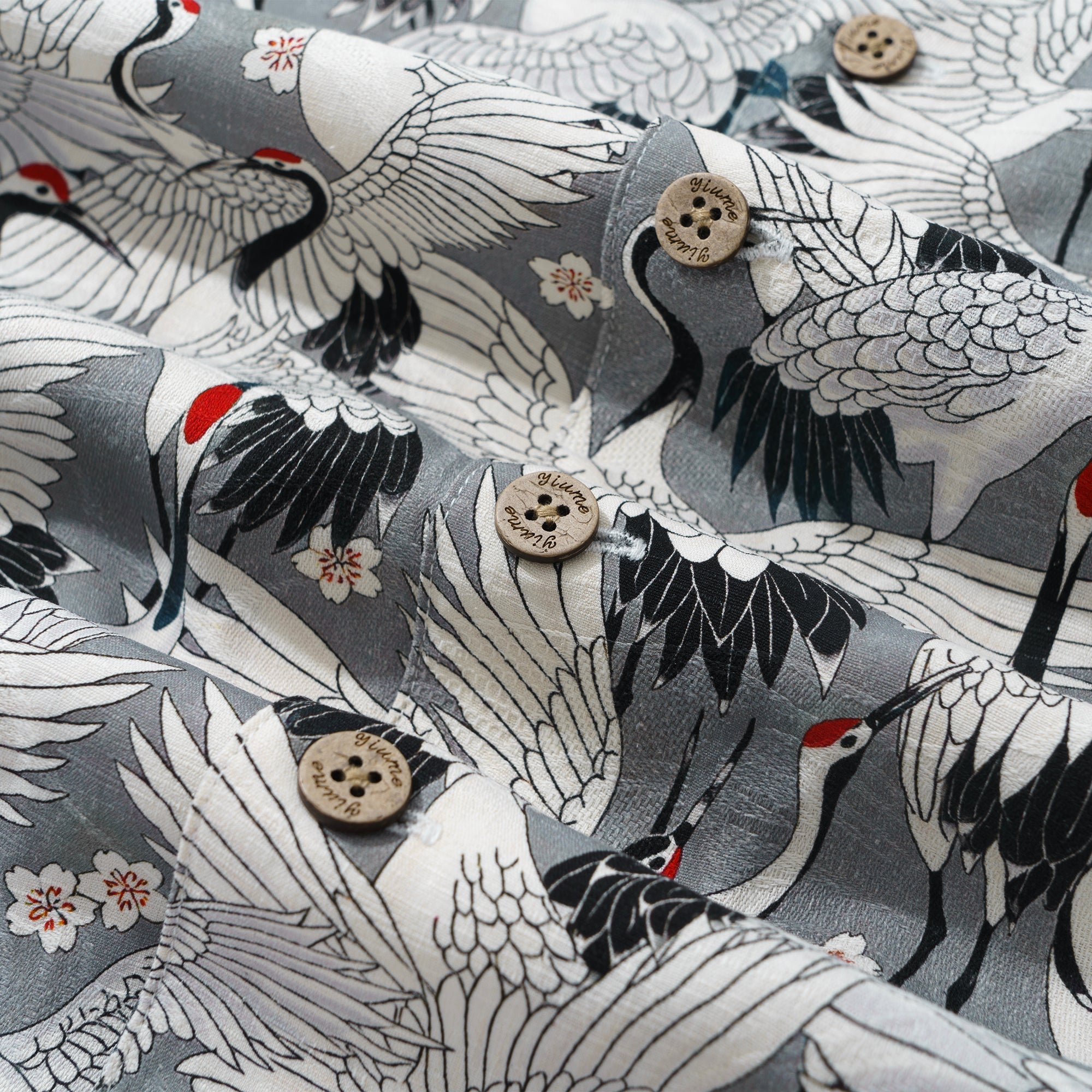 Die elegante Haltung des Kranichs skizziert poetische und malerische Szenen, wobei jeder Kranich seine eigene Geschichte zu erzählen scheint. Die grauen Kraniche sind mit einem auffälligen Rot verziert, inmitten kontrastierender weißer und schwarzer Federn. Dies verleiht dem Hemd einen Look, der sowohl exquisite traditionelle asiatische Kunst als auch moderne Mode verkörpert. „Das Fest der Kraniche“ ist nicht nur ein Kleidungsstück, sondern vielmehr ein kulturelles Symbol, das das Streben nach einem harmonischen und anmutigen Leben repräsentiert.