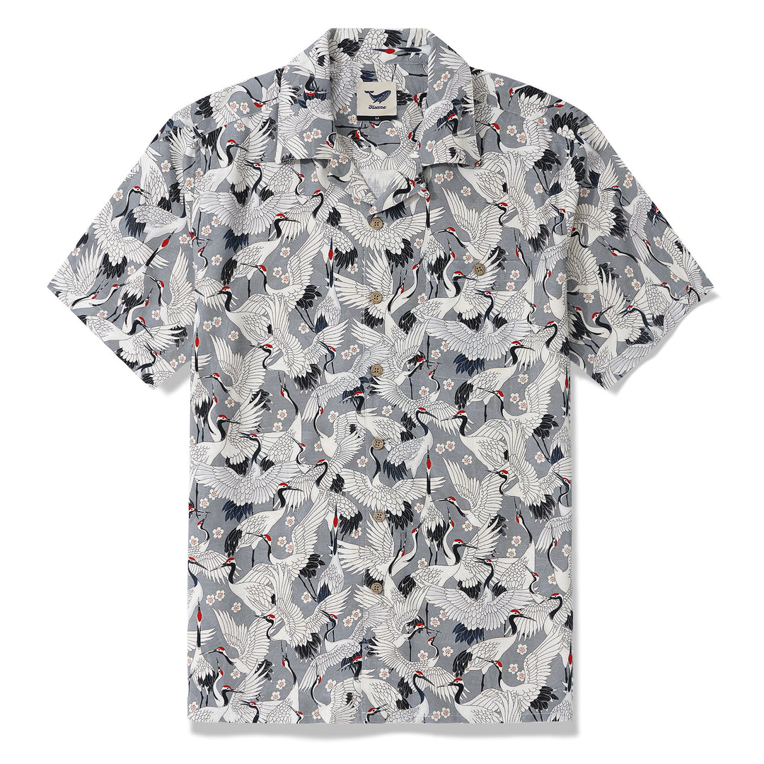 Herren-Hawaii-Hemd Langarm-Button-Down 100% Seidengrau Aloha Das Fest der Kraniche