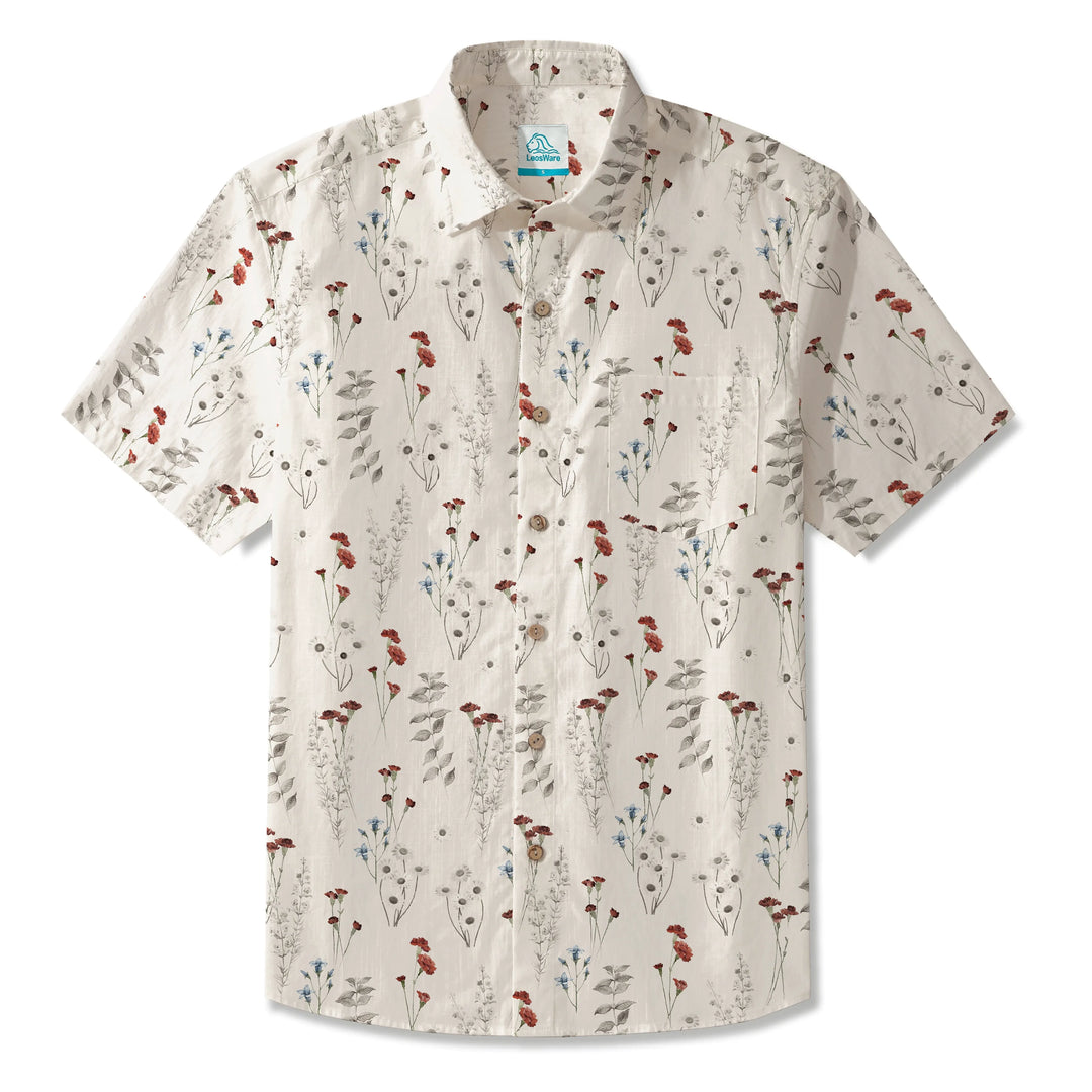 LeosWare® Men's Hawaiian Shirt Short Sleeve Button-up 100% Cotton Beige Aloha Field Of Wildflowers