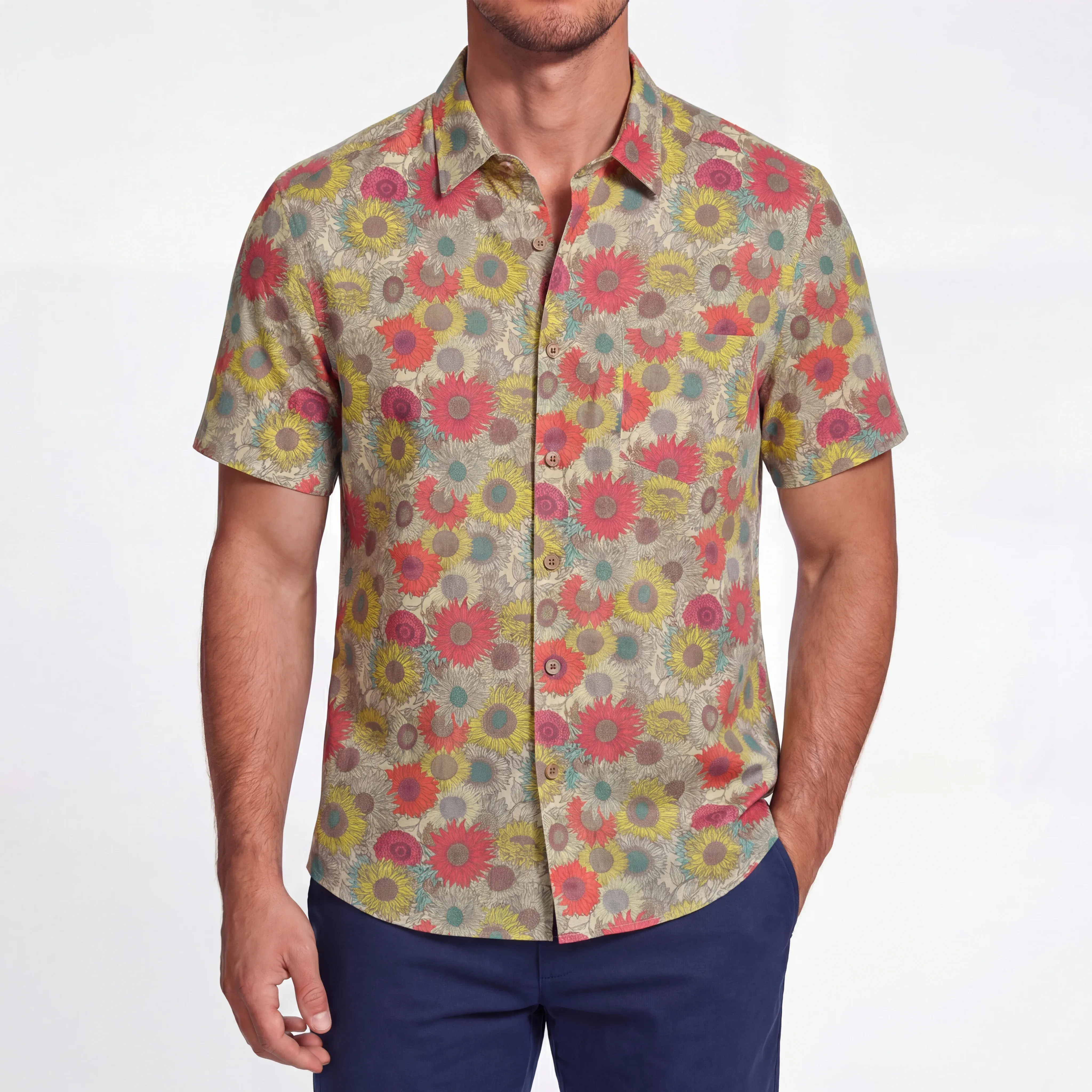 LeosWare® Men's Hawaiian Shirt Short Sleeve Button-up 100% Cotton Beige Aloha Earth Day Sunflower Garden Embroidery Kit