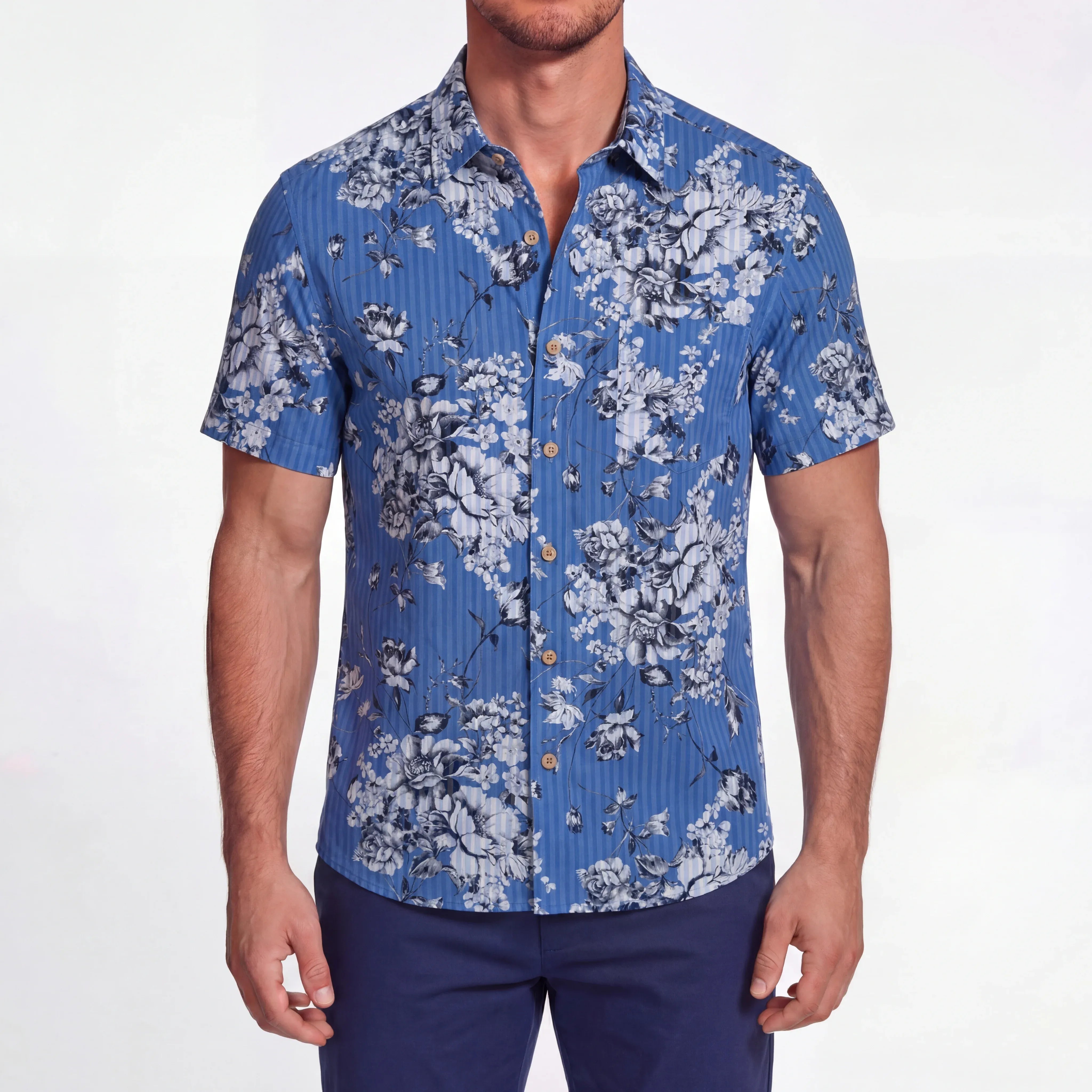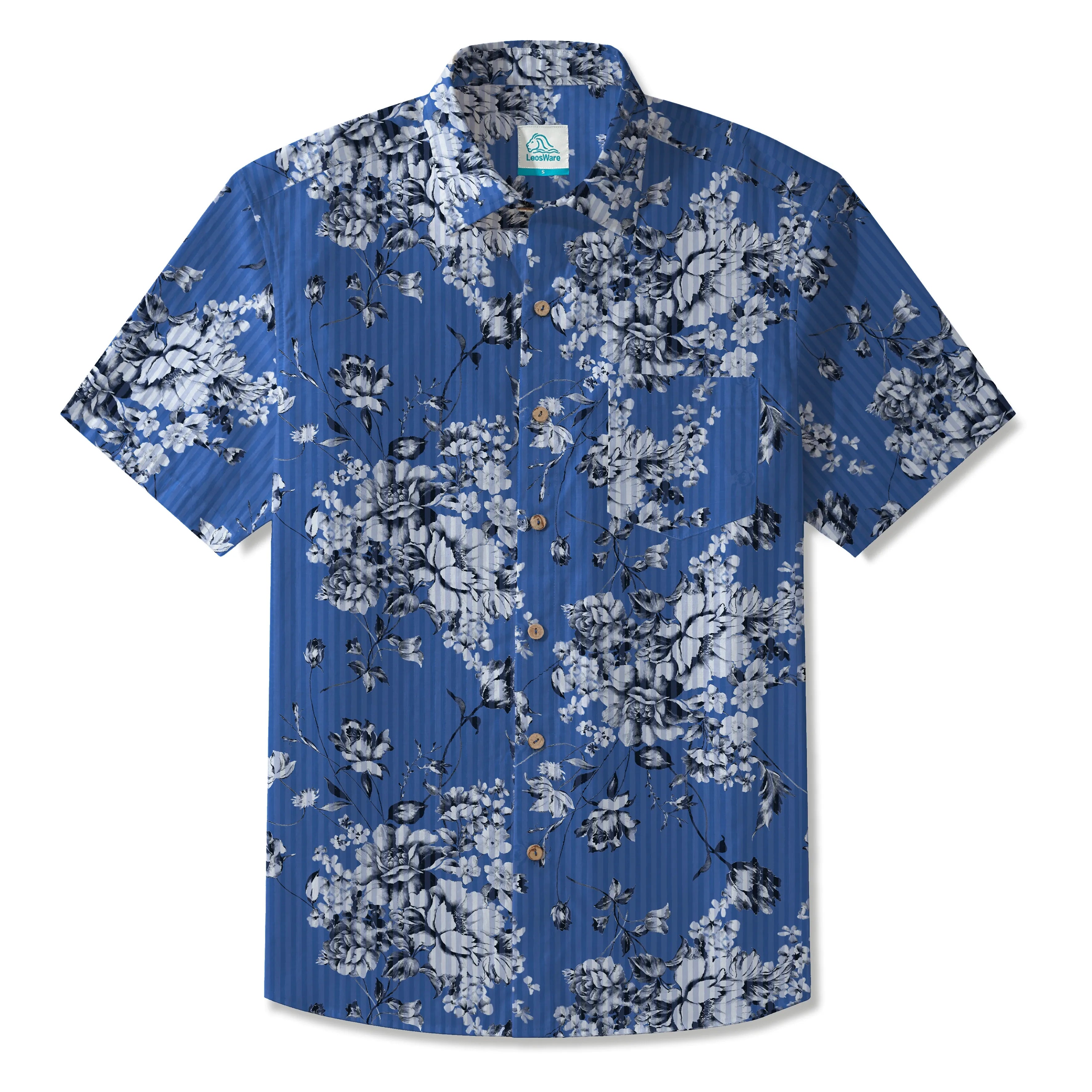 LeosWare® Men's Hawaiian Shirt Short Sleeve Button-up 100% Cotton Blue Aloha Artistic Blue Floral Charm