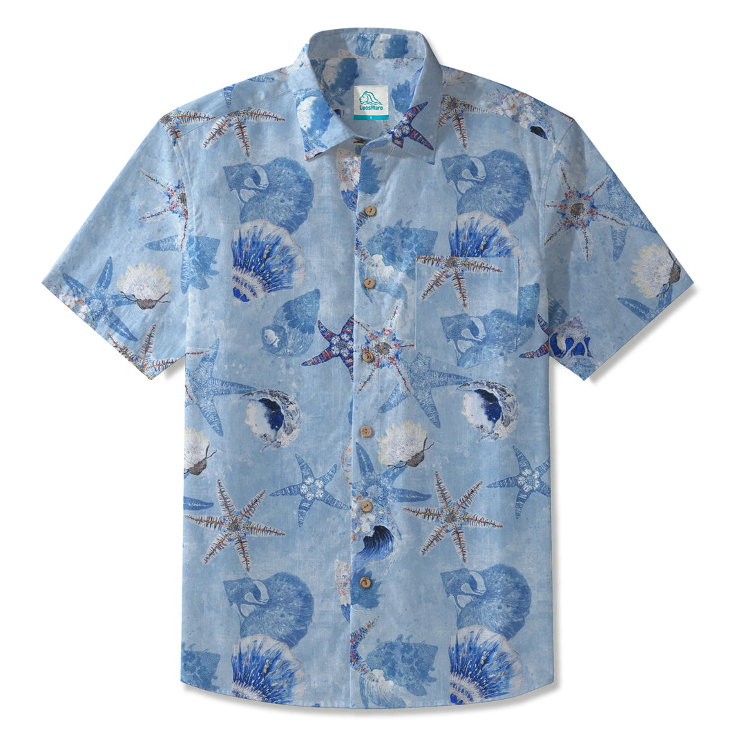 LeosWare® Men's Hawaiian Shirt Short Sleeve Button-up 100% Cotton Blue Aloha Ocean Shell Dream