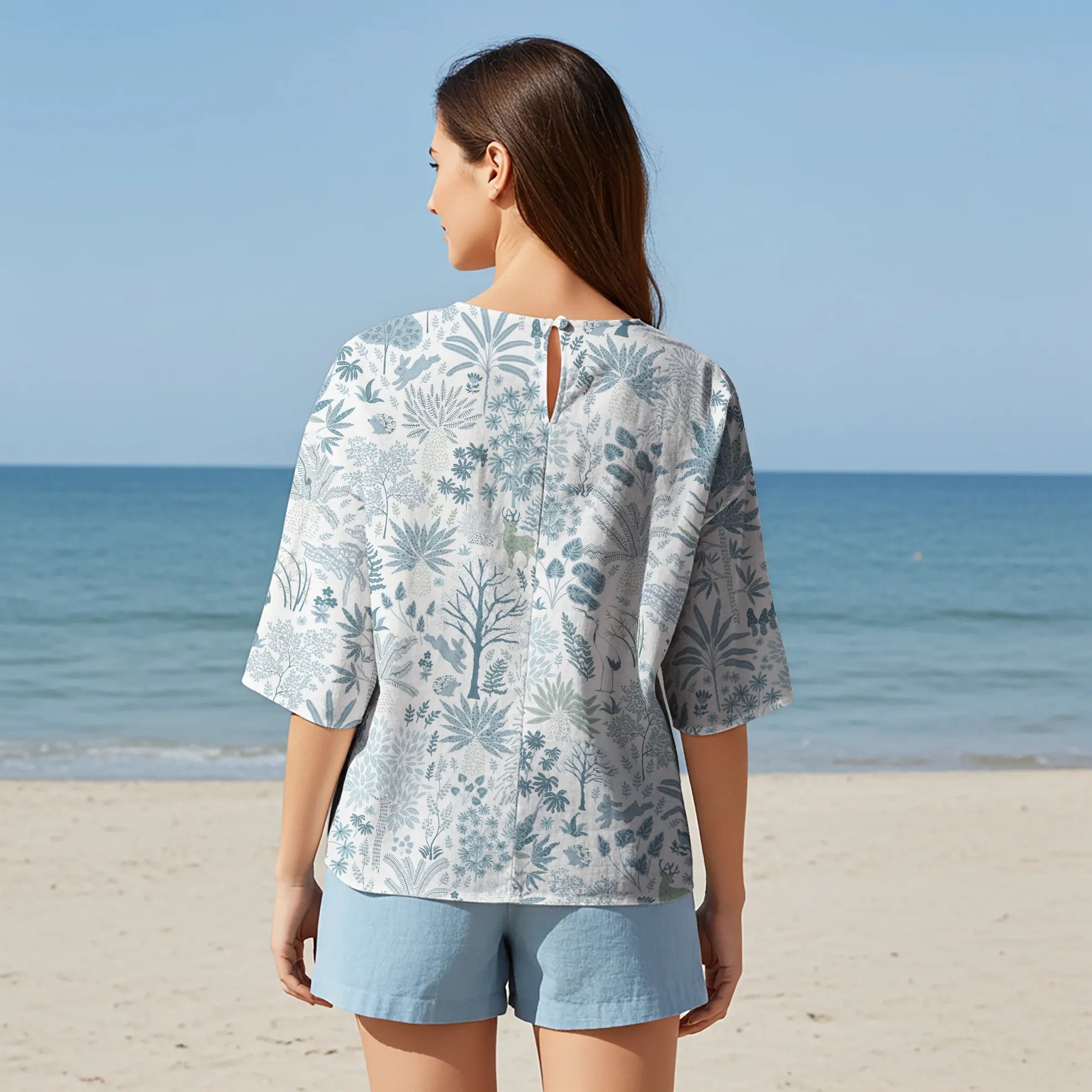 Women Casual Blouse Elbow Sleeve Crew Neck Button-Back 95% Lyocell, 5% Linen Blue Aloha Whispering Forest Tales