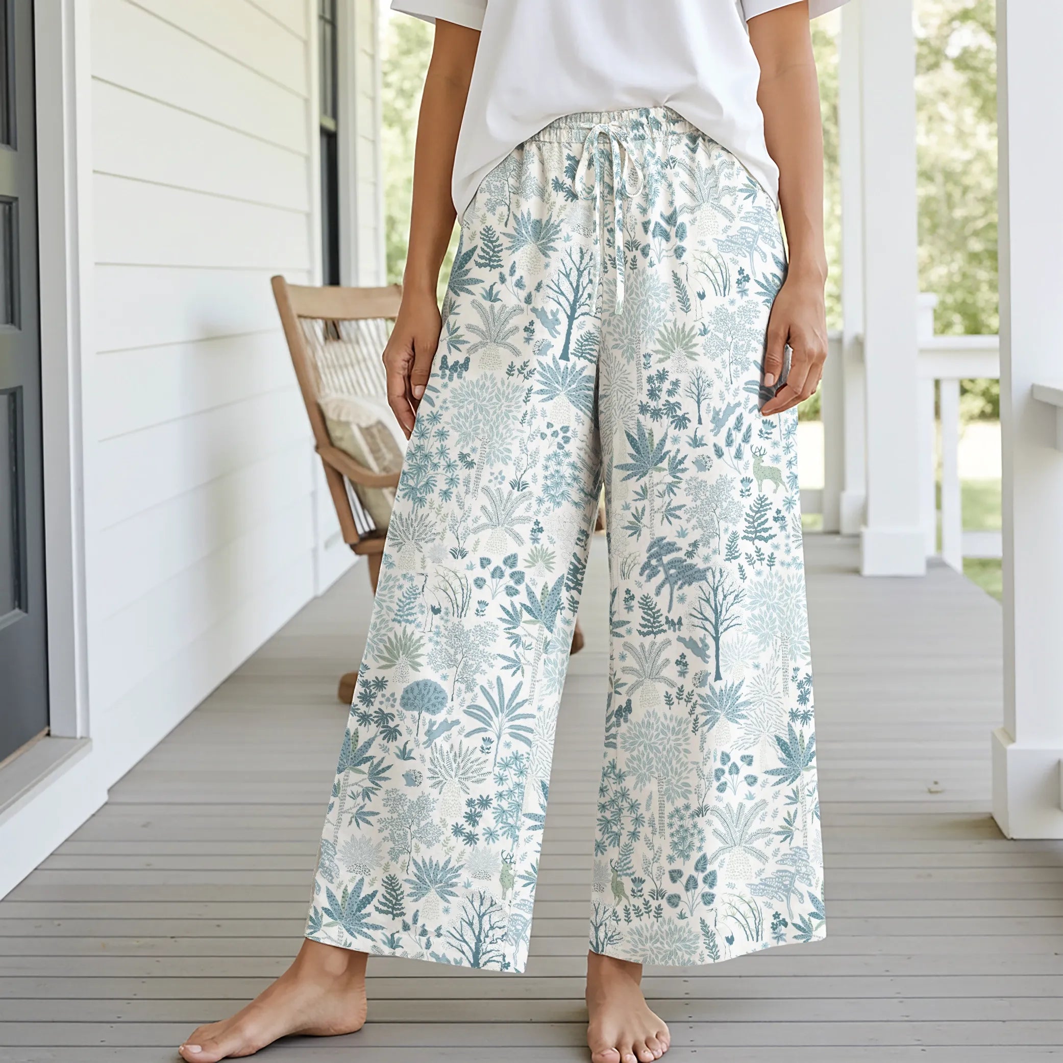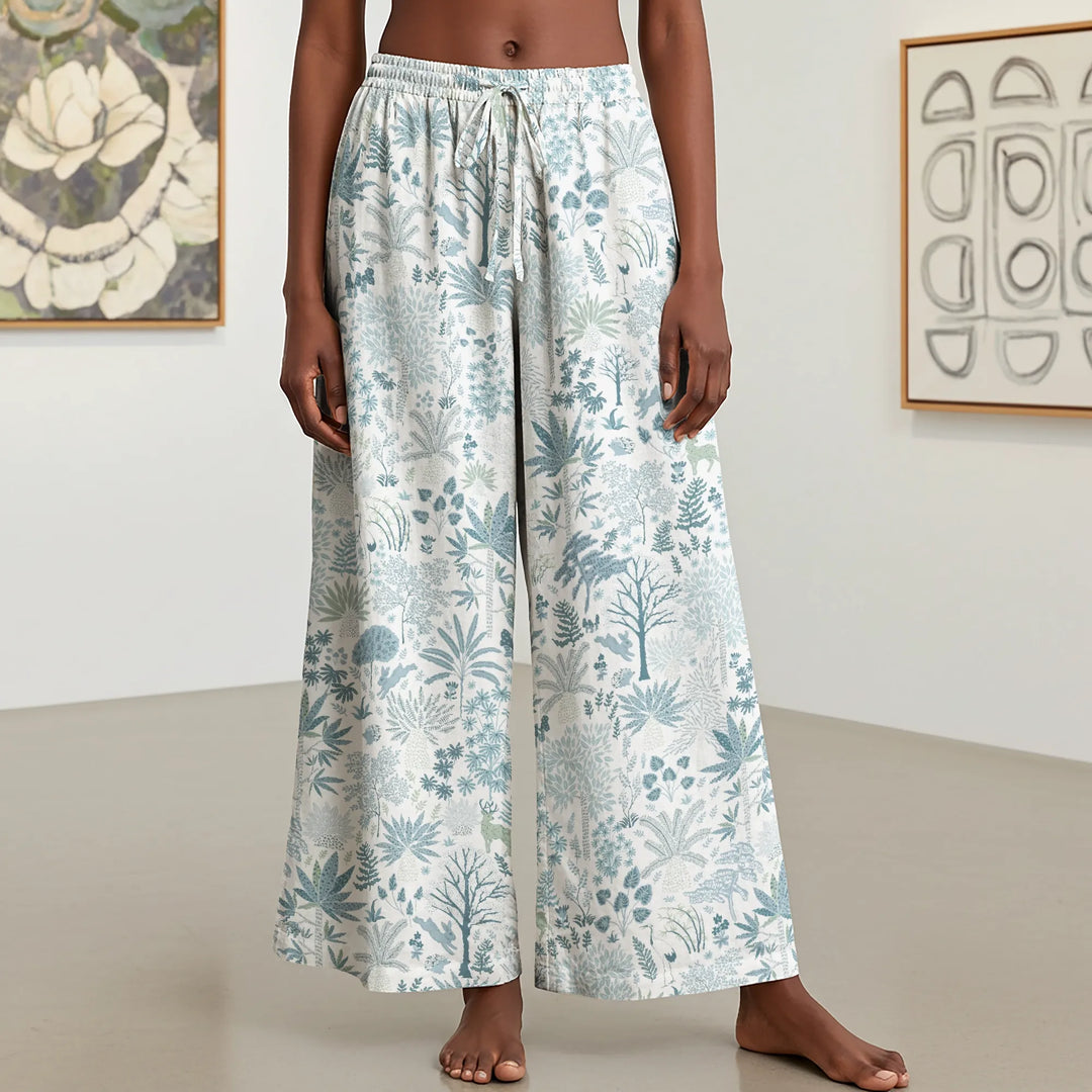Women Casual Pants Lounge Elastic Waist Drawstring with Pockets 93% Lyocell, 7% Linen Blue Aloha Whispering Forest Tales