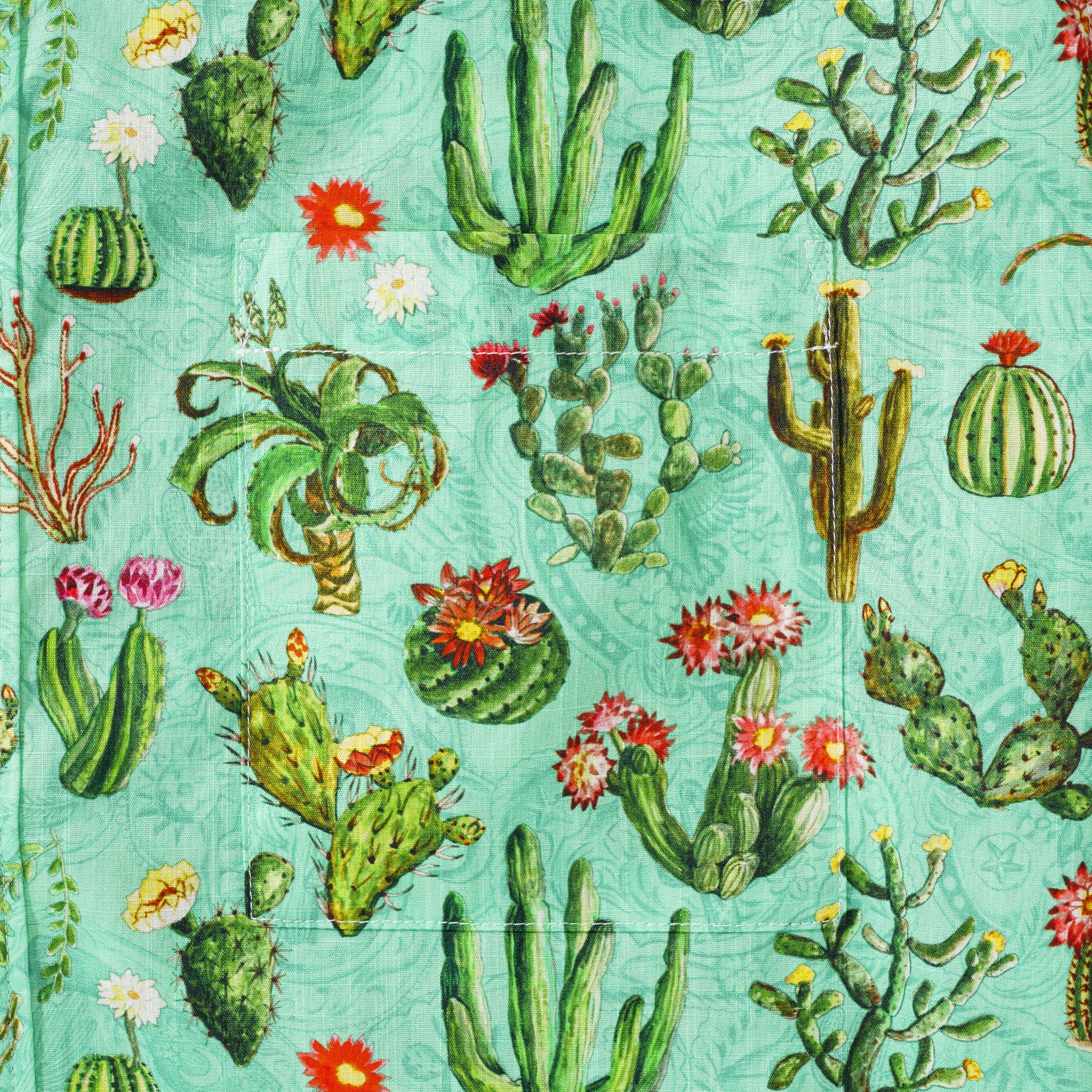 Kräftiges Mintgrün mit tanzenden roten, rosa und gelben Kaktusblüten. Kakteen, die Kultsymbole des Westens, sind inspiriert von der vielfältigen Familie dieser Pflanze. Dunkle Muster imitieren Cowboy-Gürtelschnallen und zeigen jeweils Wüstenszenen in metallischem Relief.