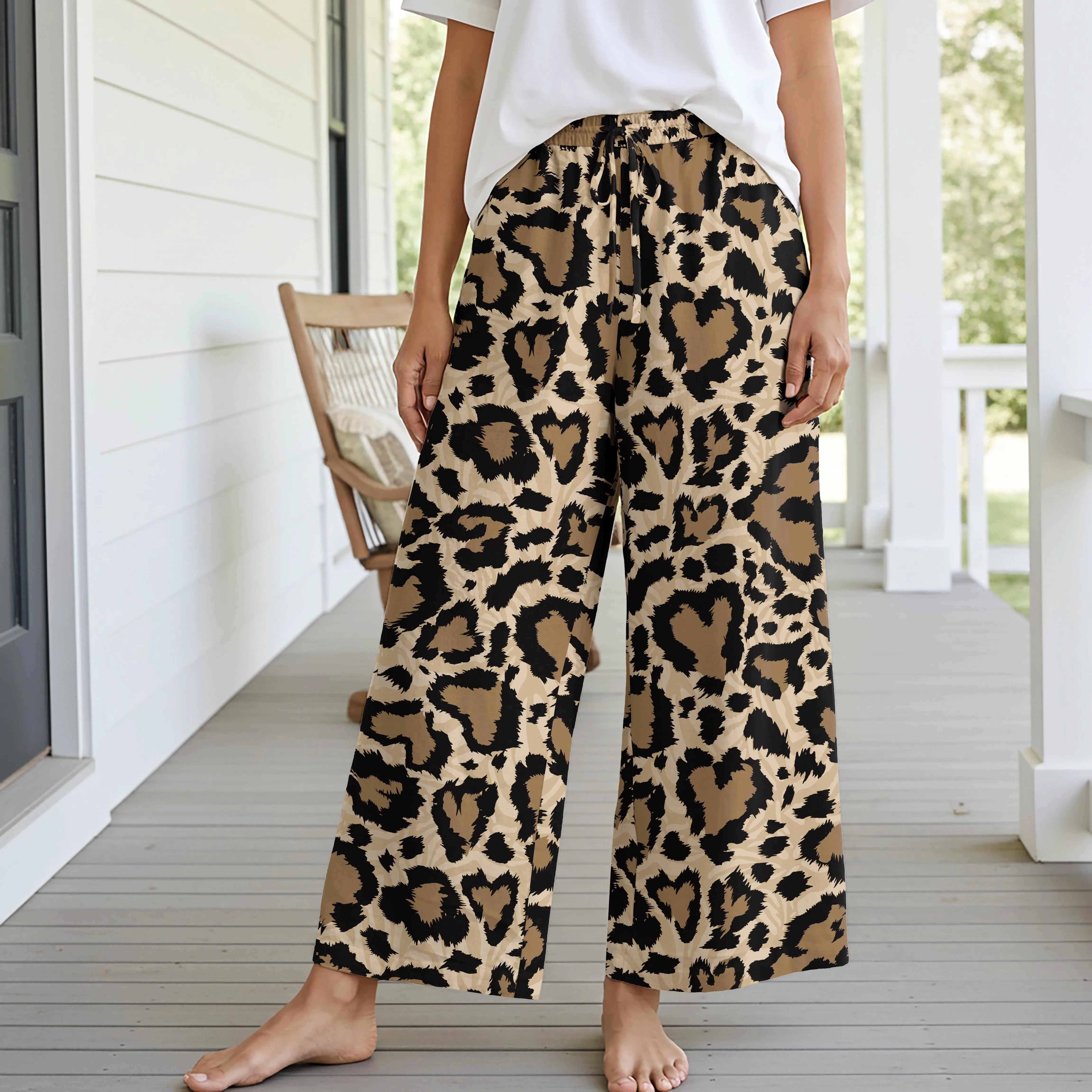 Women Casual Pants Lounge Elastic Waist Drawstring with Pockets 93% Lyocell, 7% Linen Black Aloha Leopard Wilderness Whisper