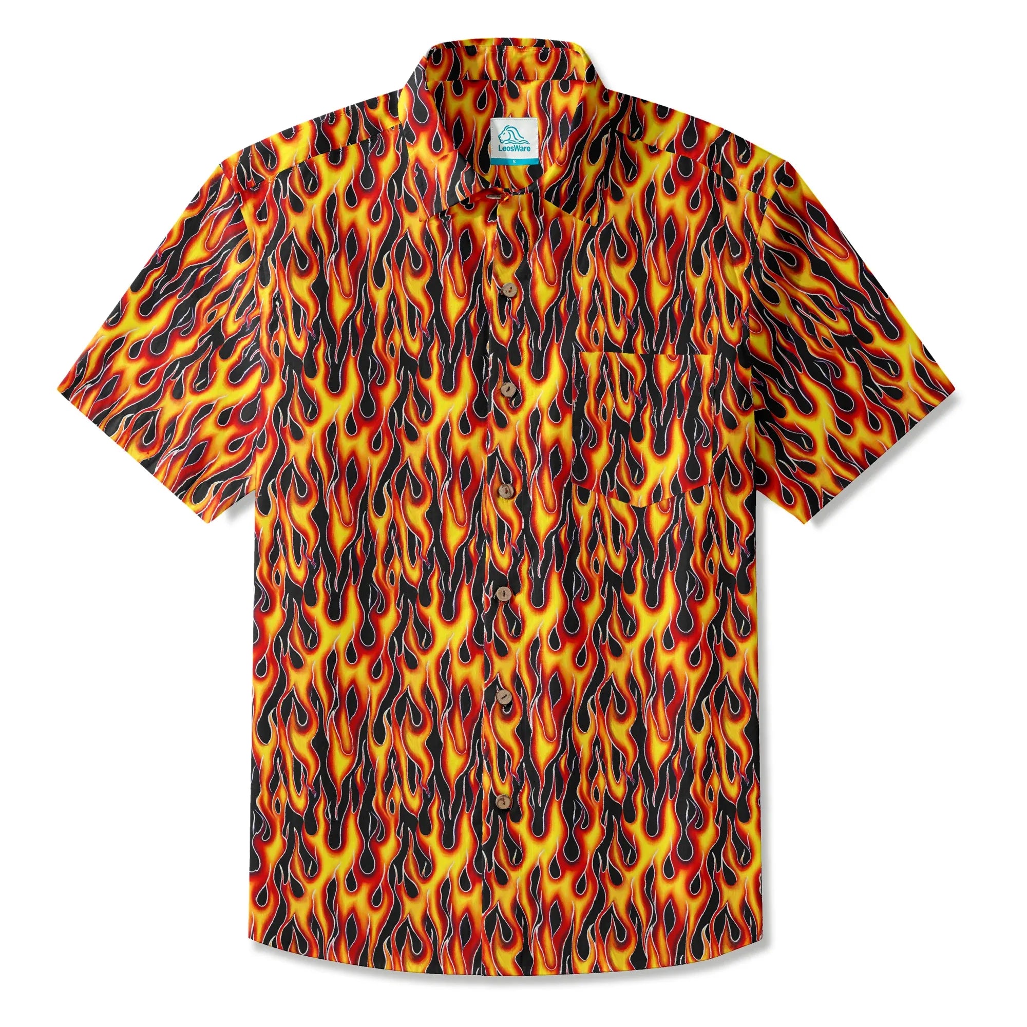 LeosWare® Flames Men's Hawaiian Shirt Short Sleeve Button-up 100% Cotton Yellow Aloha Flame Surge
