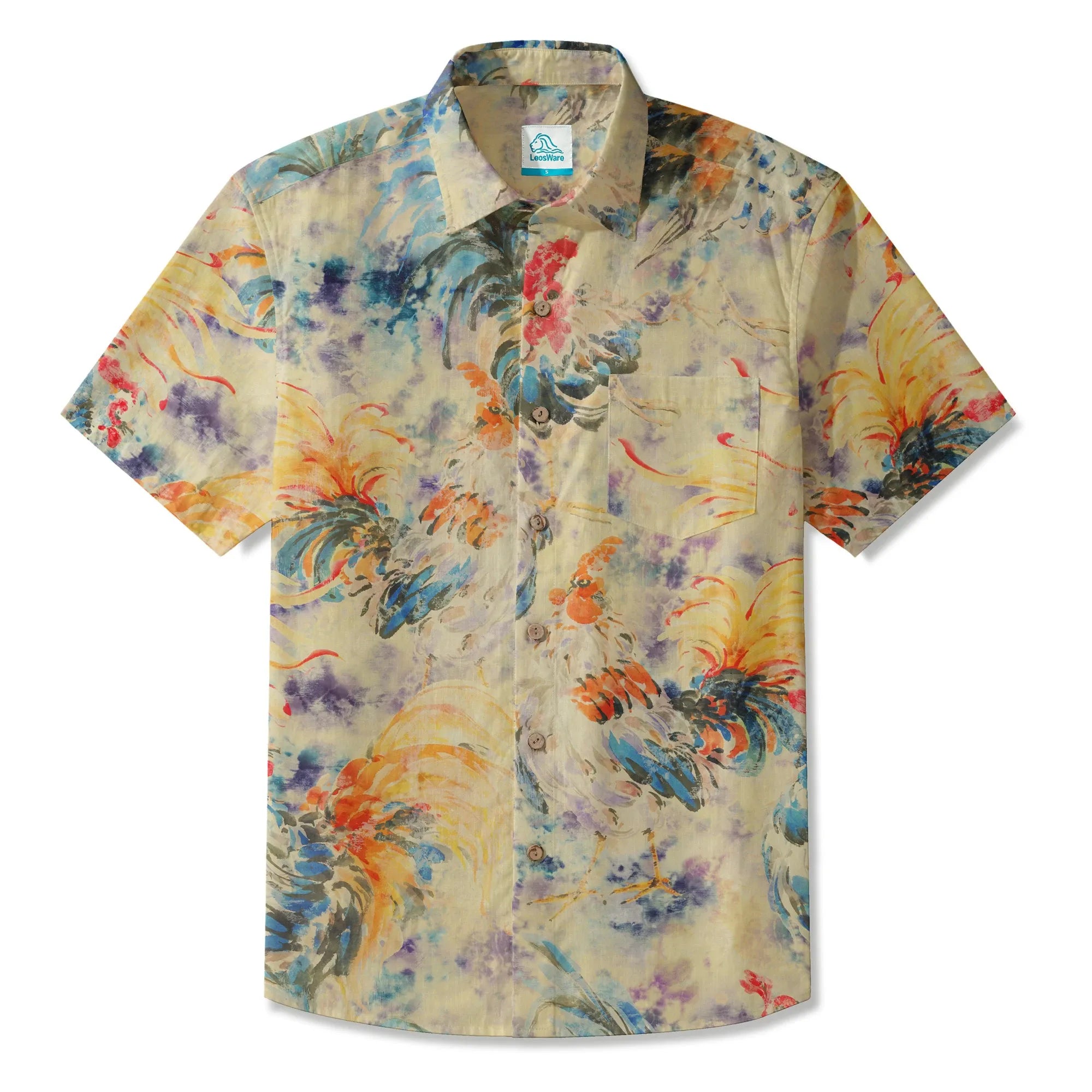 LeosWare® Men's Hawaiian Shirt Short Sleeve Button-up 100% Cotton Orange Aloha Enchanting Rooster
