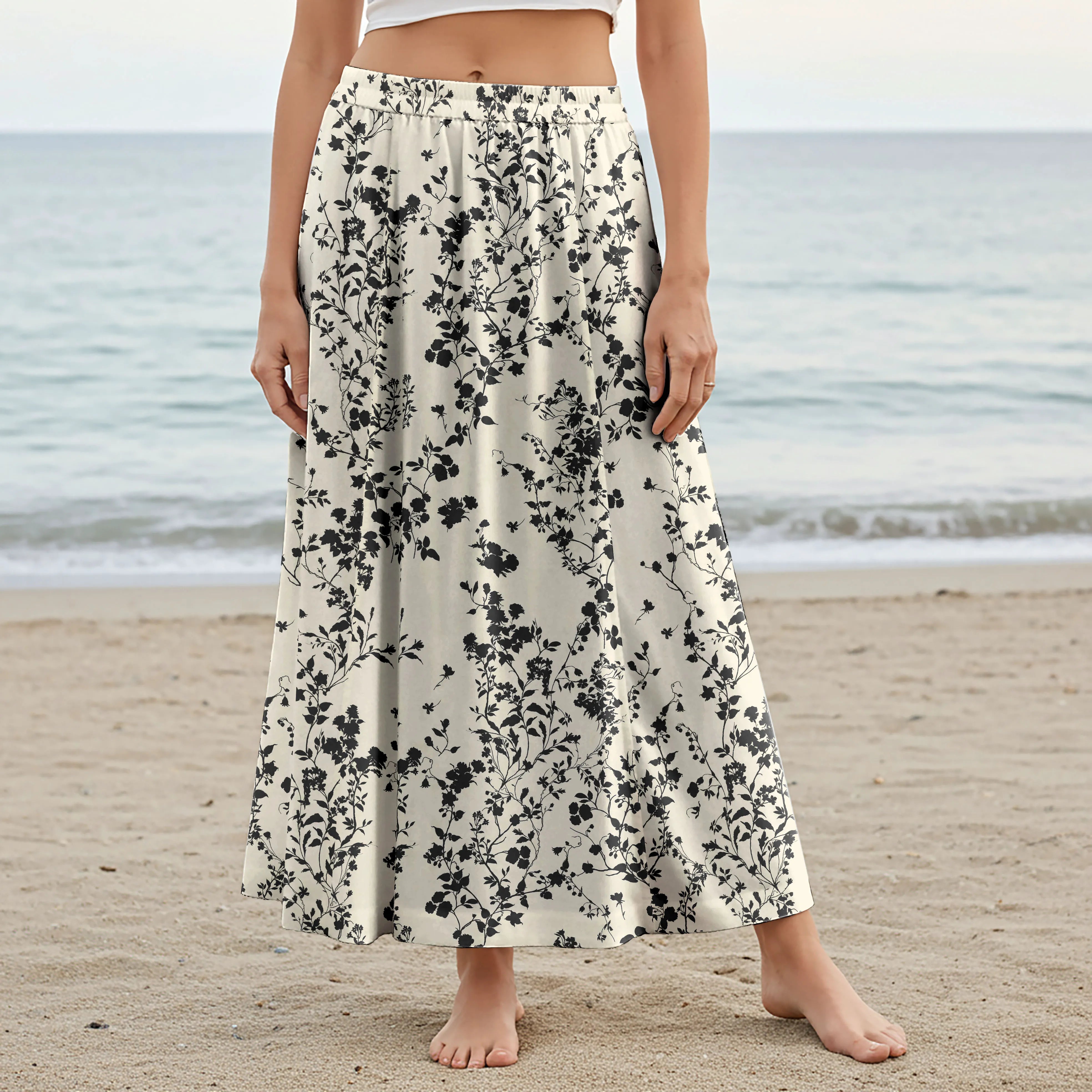 Women Casual Maxi Skirt Long Elastic Waist with Pockets 100% Cotton Beige Aloha Tranquil Inkvine