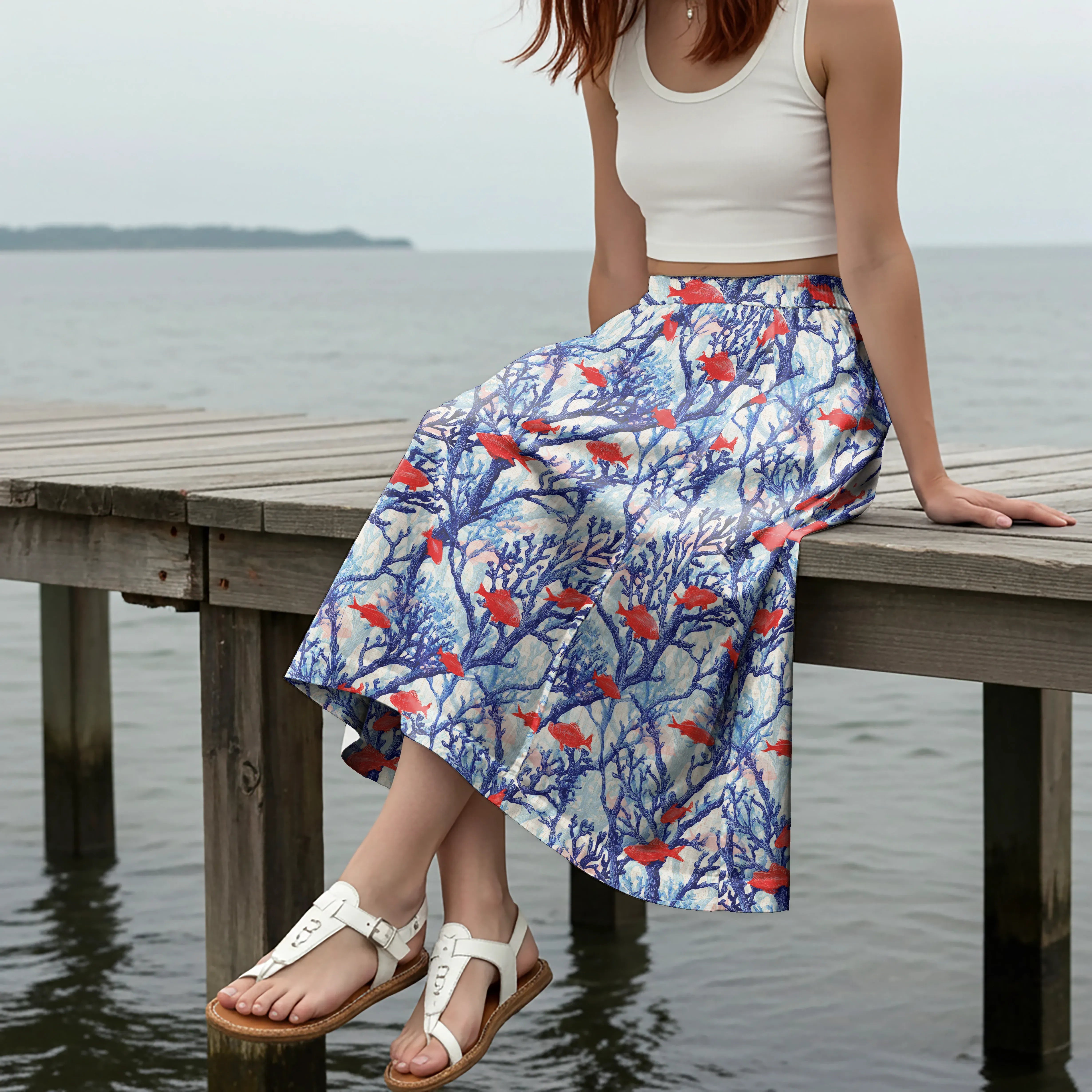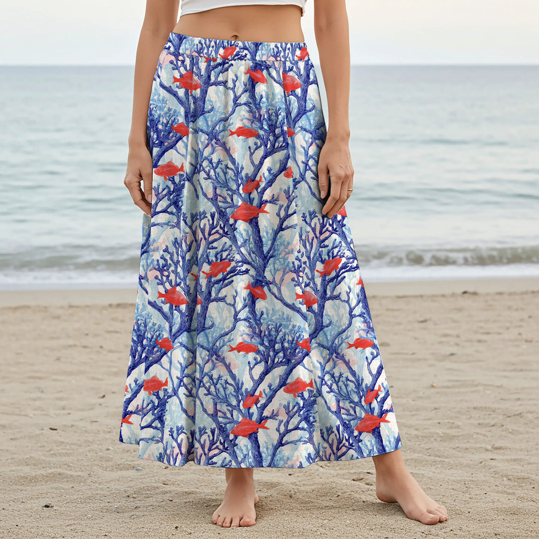 Women Casual Maxi Skirt Long Elastic Waist with Pockets 100% Cotton Blue Aloha Messenger Of The Earth's Red Fish