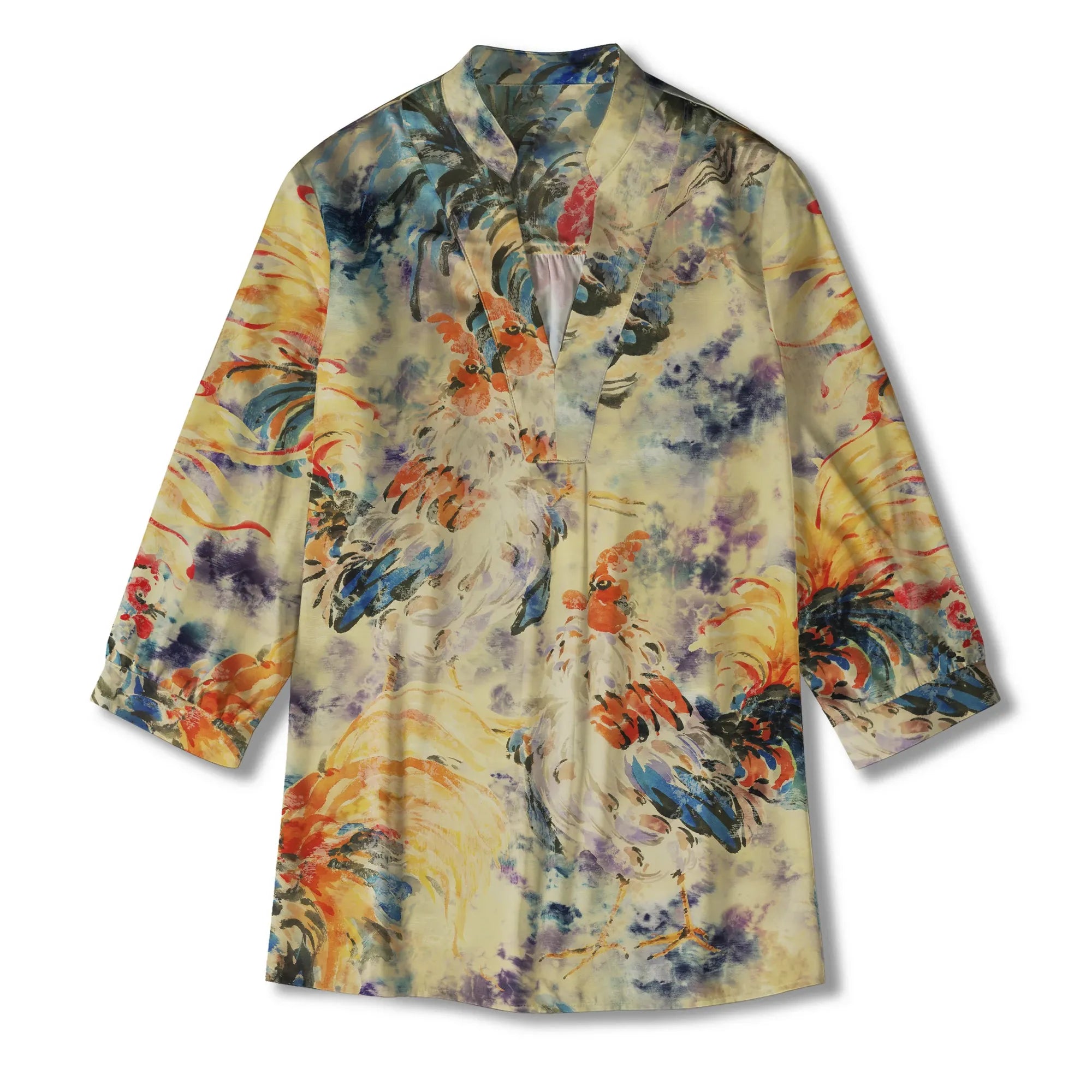 Women's Casual Blouse 3/4 Sleeve V-neck Shirt Collar 100% Lyocell Orange Aloha Enchanting Rooster