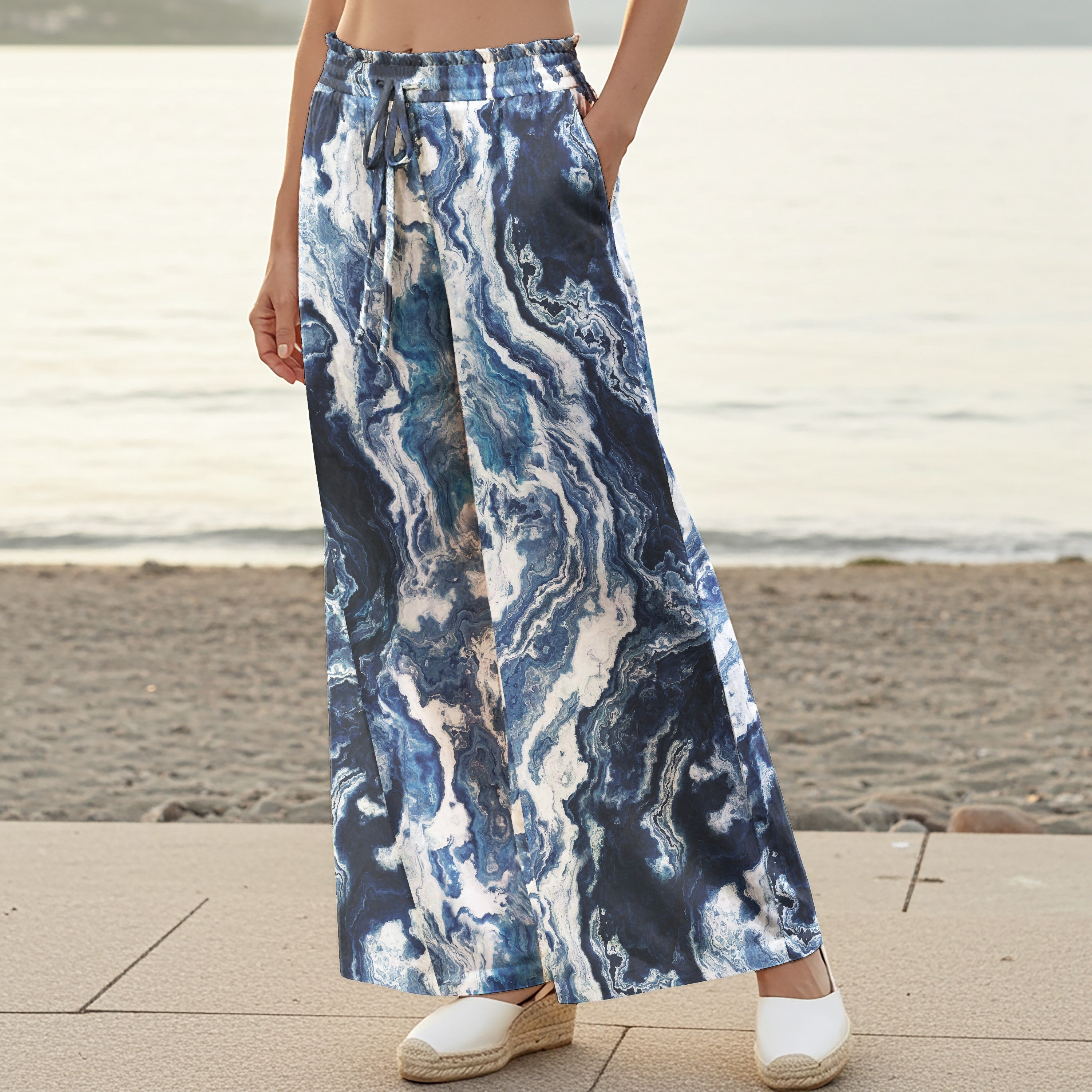 Immerse yourself in the mystery and dynamism of the deep sea with these blue-toned wide-leg pants. The intricate patterns mimic the ebb and flow of ocean waves, capturing the profound tranquility of the sea. Wear them to stand out at any occasion, embodying the allure of the ocean. Get ready to turn heads and receive compliments like "You're wearing the romance of the sea on your legs."