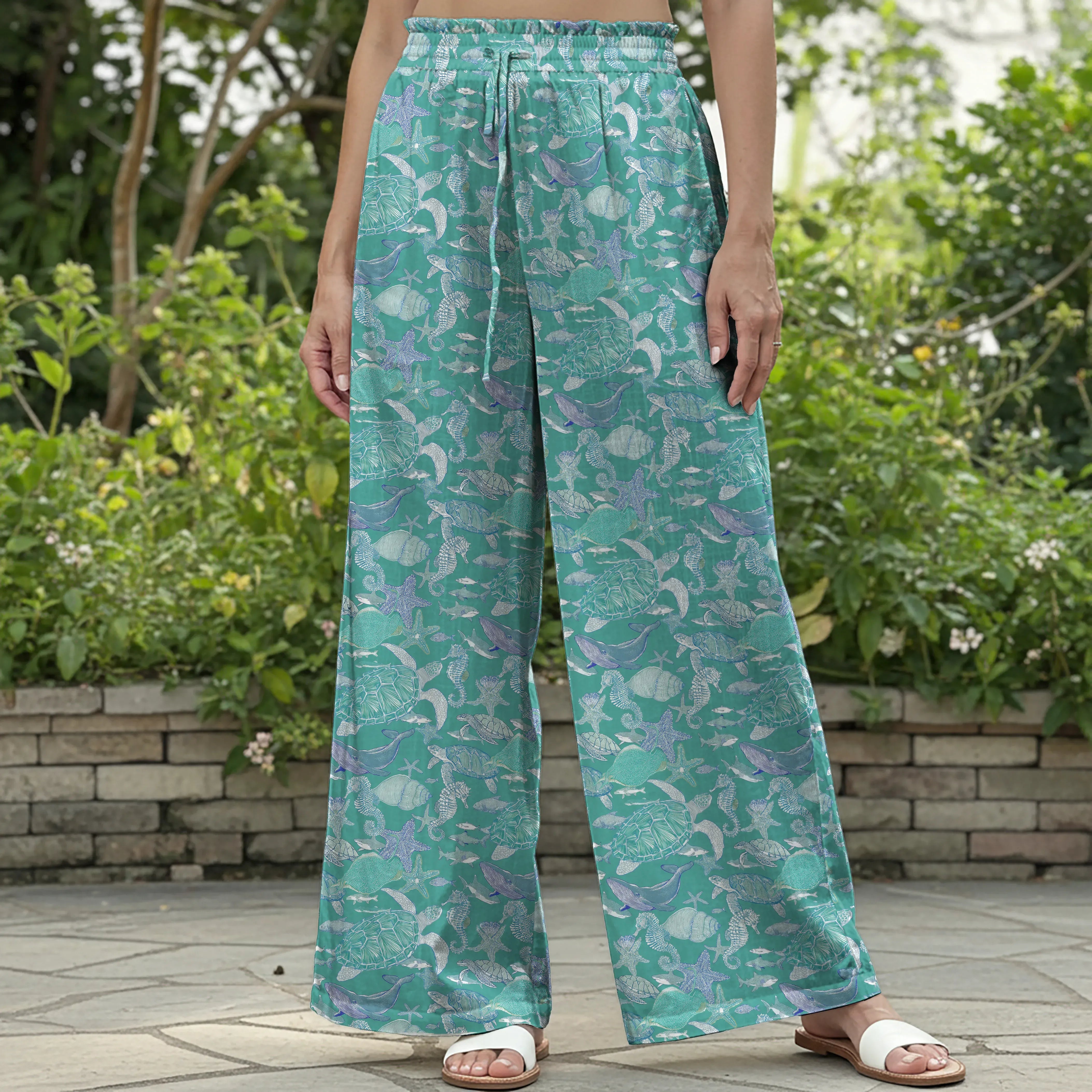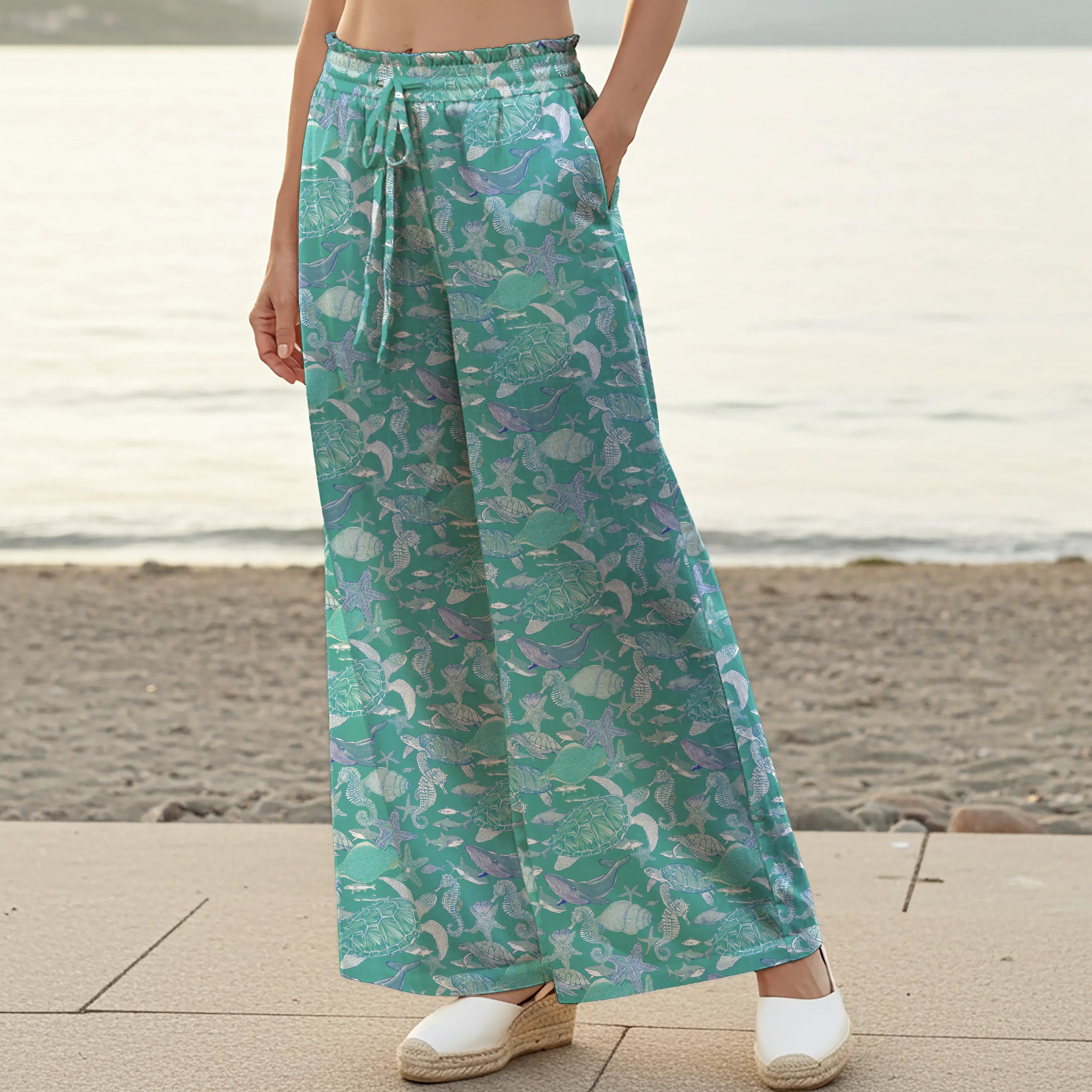 Women Casual Pants Lounge Elastic Waist Drawstring with Pockets 100% Cotton Blue Aloha Azure Islet Sea Turtle