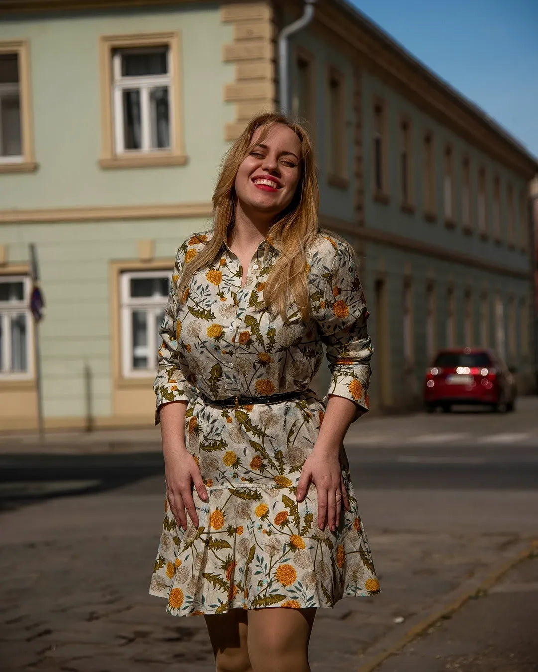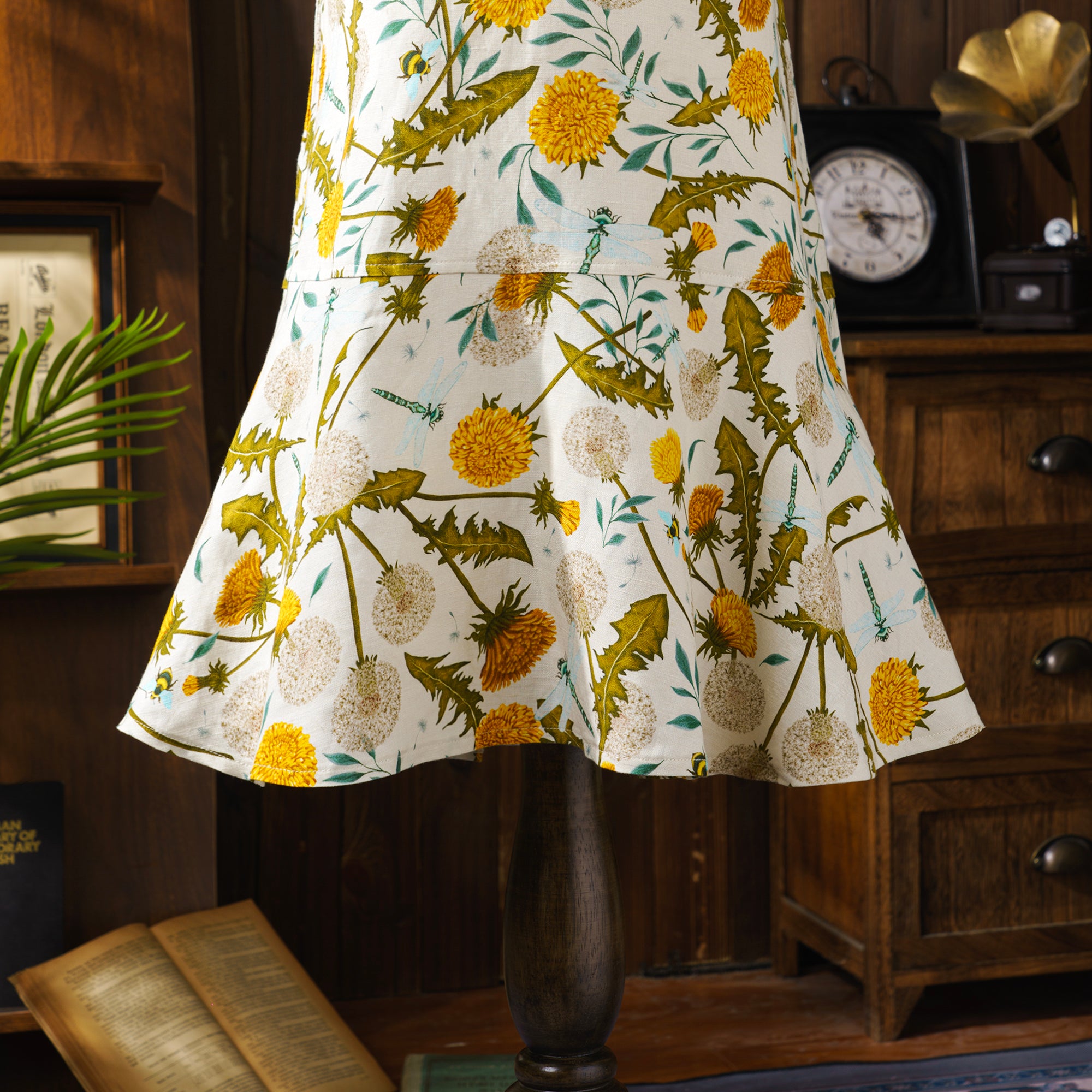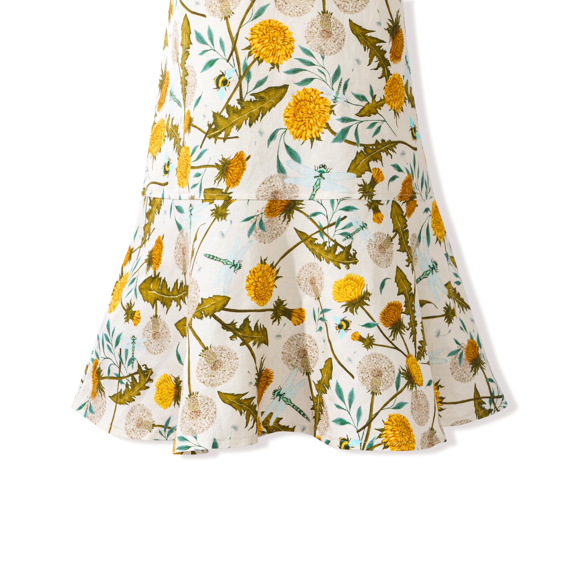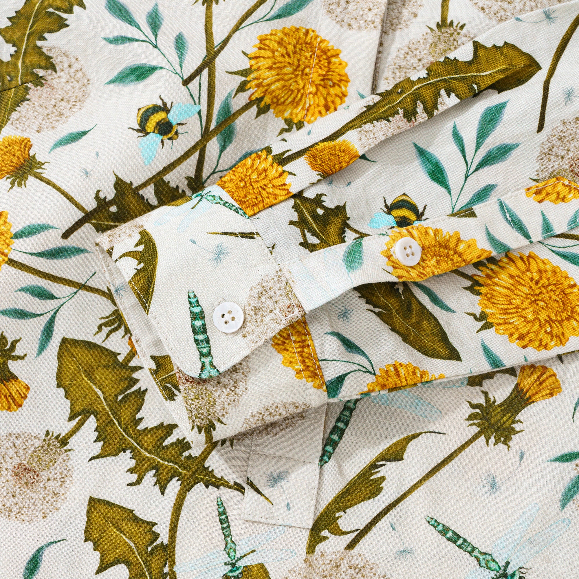 Damenkleid Hawaiianische Löwenzahn und Libellen Rüschensaum Langarmhemdkleid