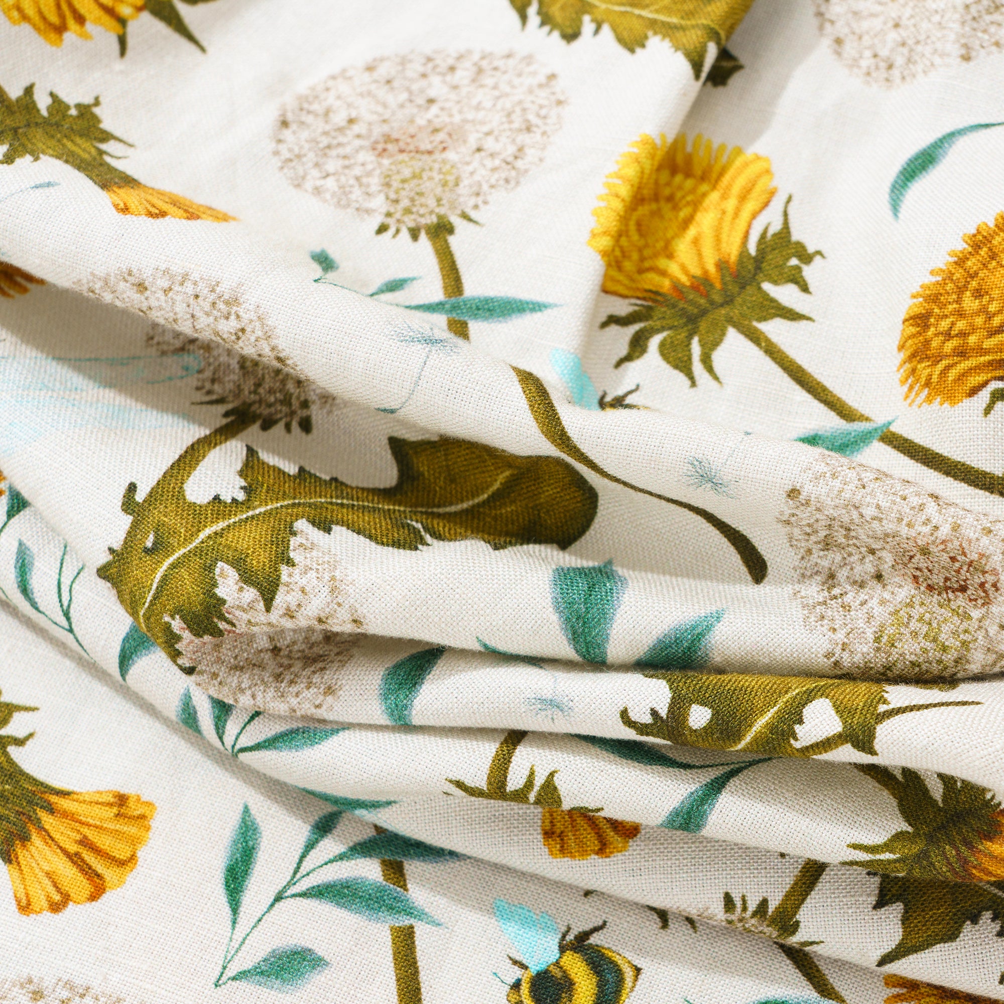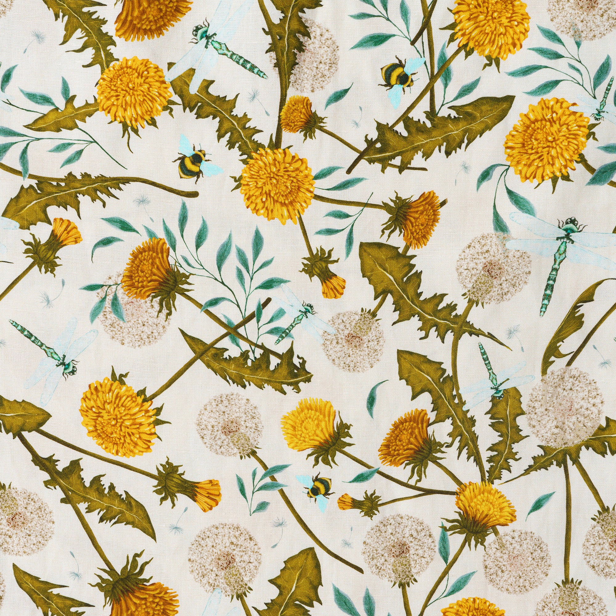 Ein frisches und luftiges Design mit eleganten Libellen, die zwischen sonnigen und unbeschwerten Löwenzahnblüten umherschwirren. Die perfekten Farbtöne von Aqua, Goldrute, Sand und Sommergrün heben sich lebhaft von einem frischen, warmen Weiß ab. Eine perfekte Wahl für den Alltag, einen tropischen Kurzurlaub oder einfach zum Bummeln in der Stadt.