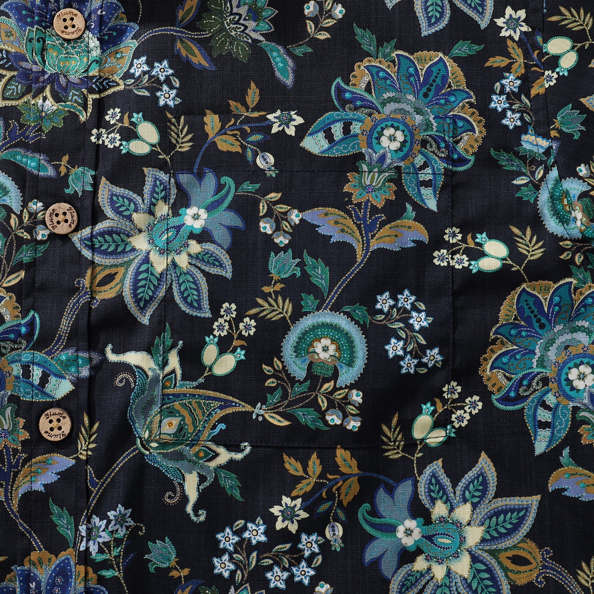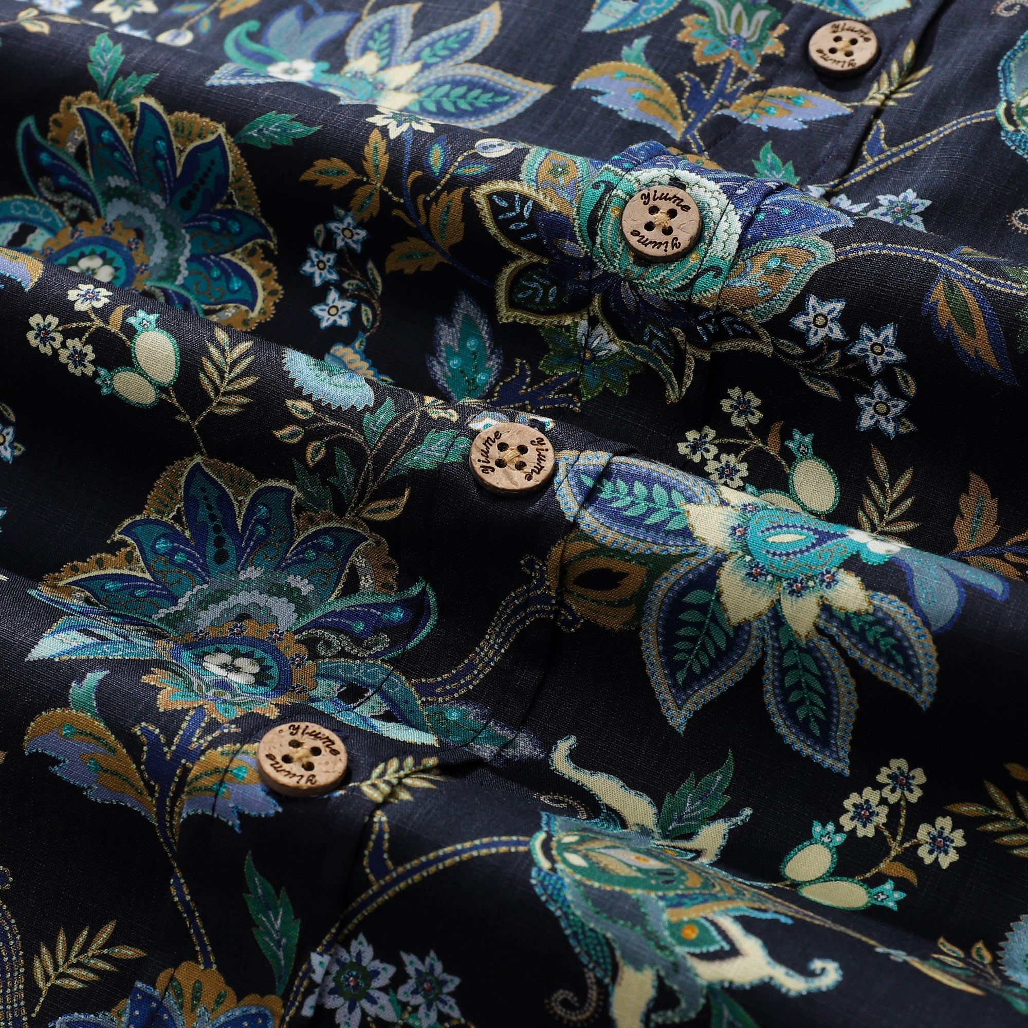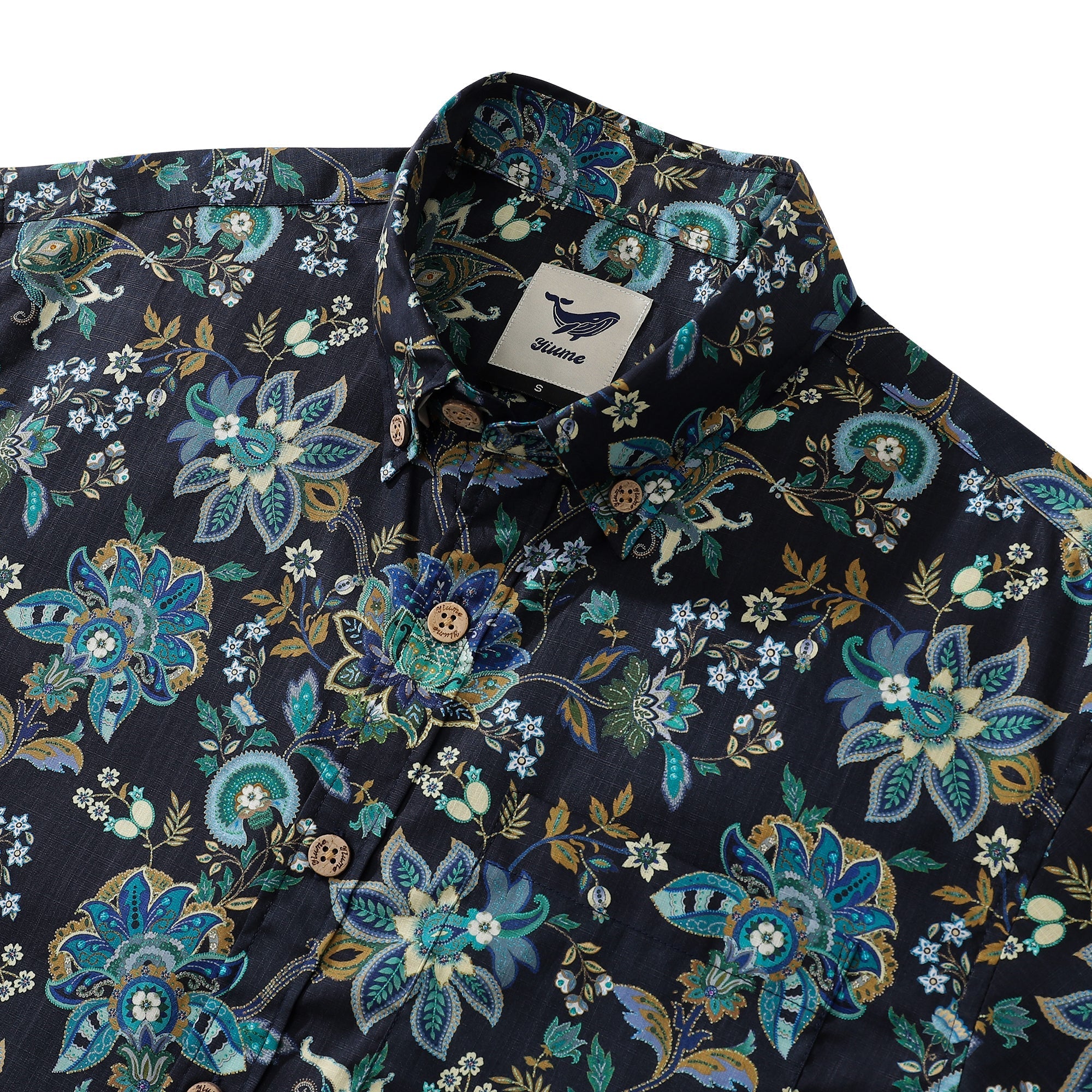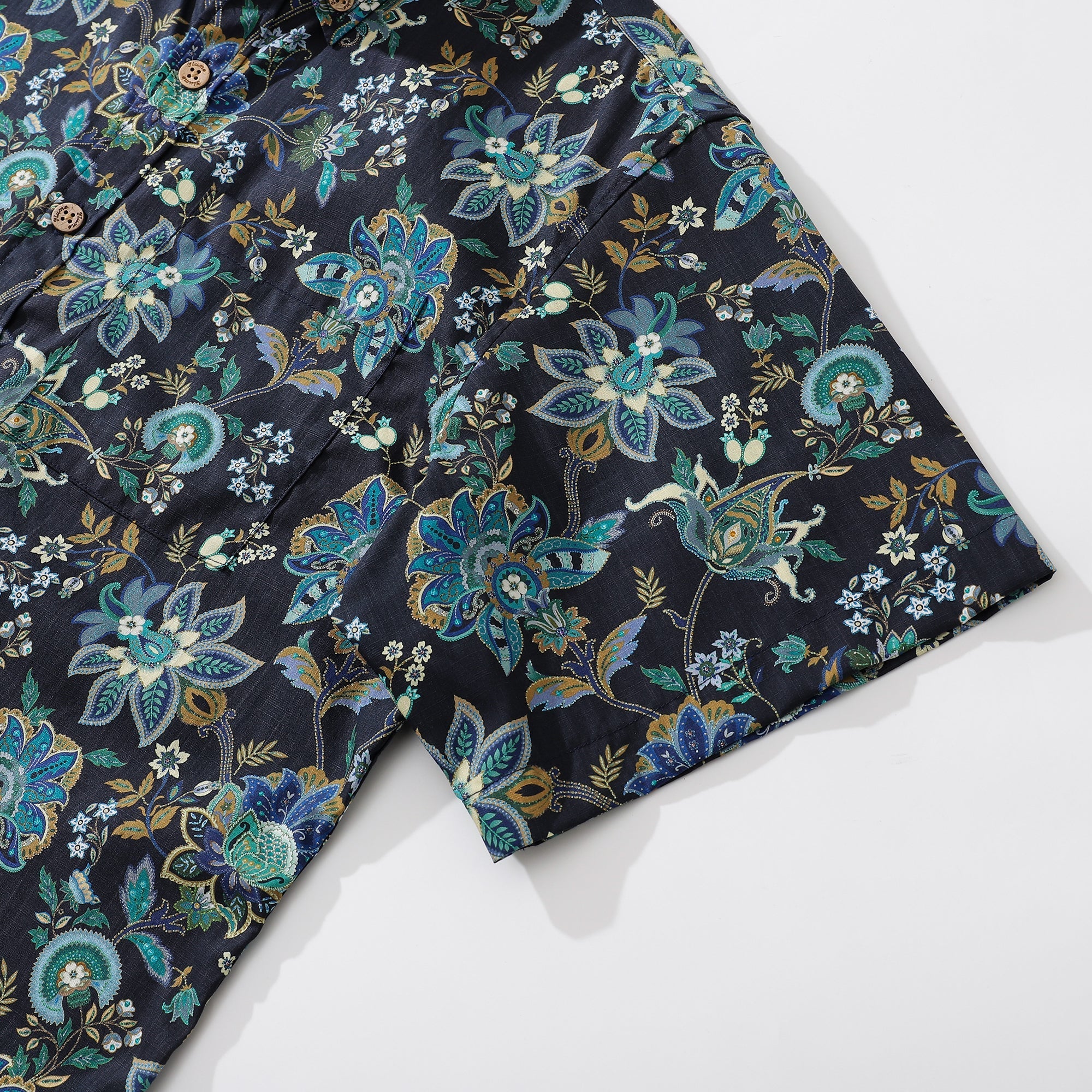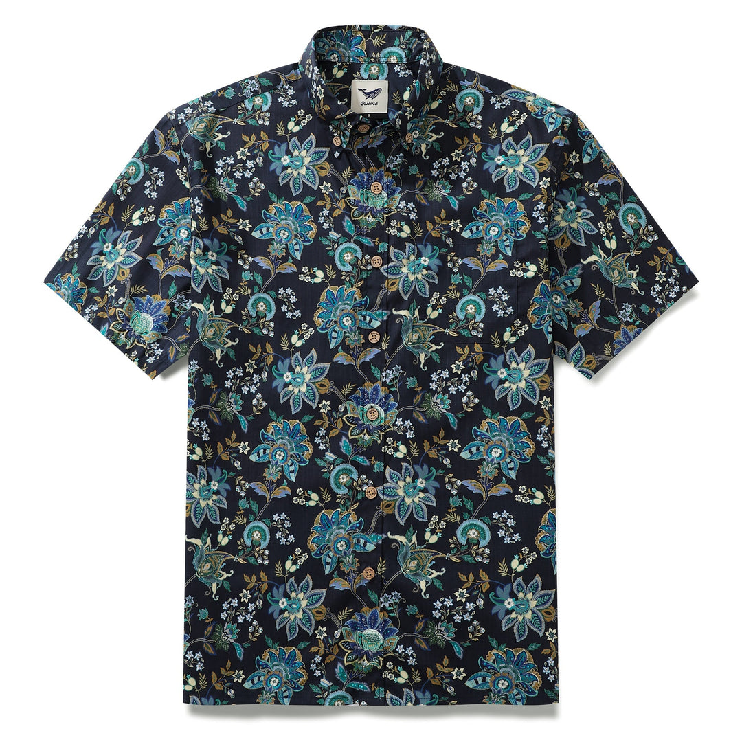 Schwarze Hawaiian Hemd für Herren mit fantasievollen Blumenmuster, kurzärmlig, aus Baumwolle, mit Knopfleiste