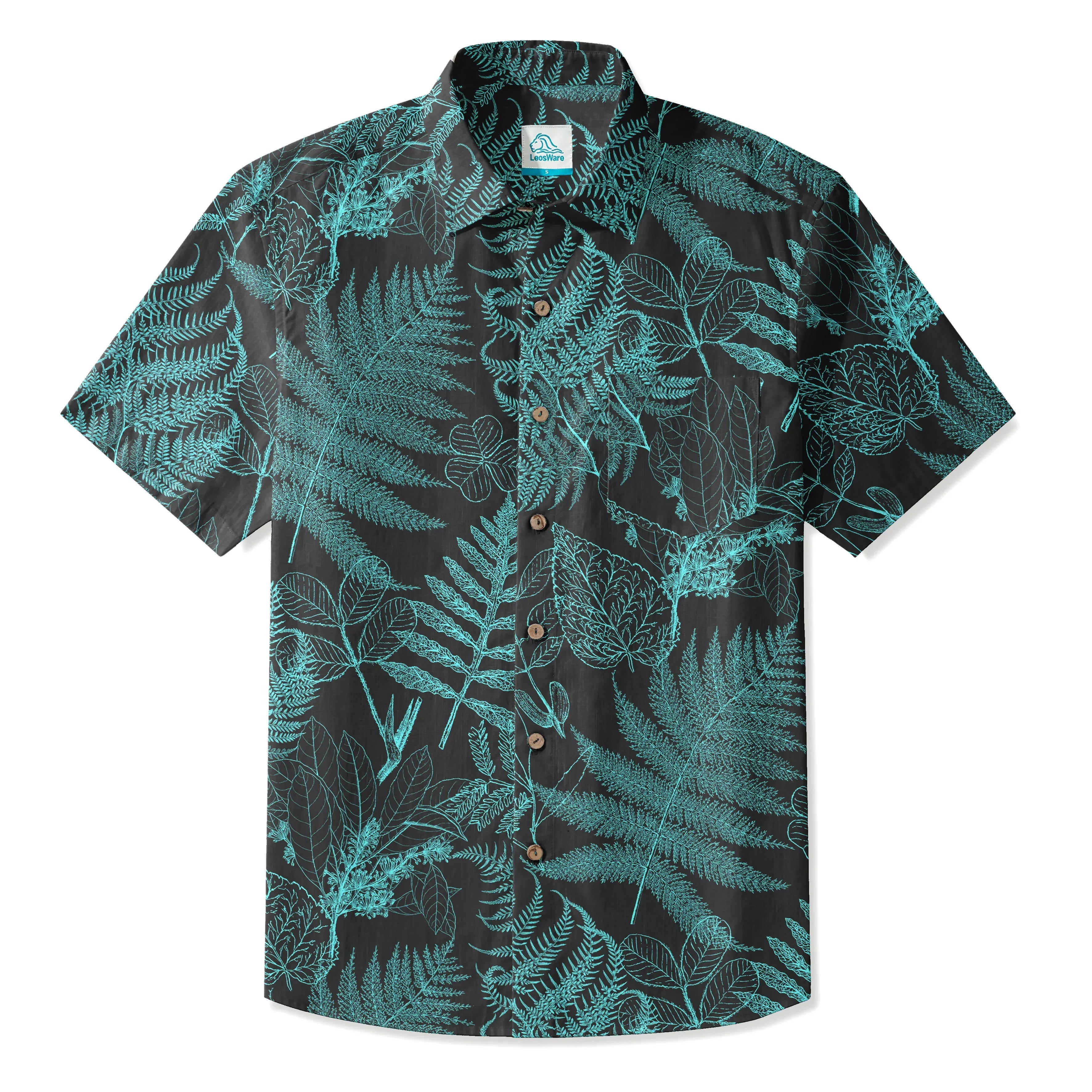 LeosWare® Men's Hawaiian Shirt Short Sleeve Button-up 100% Cotton Blue Aloha Hidden Forest Fern